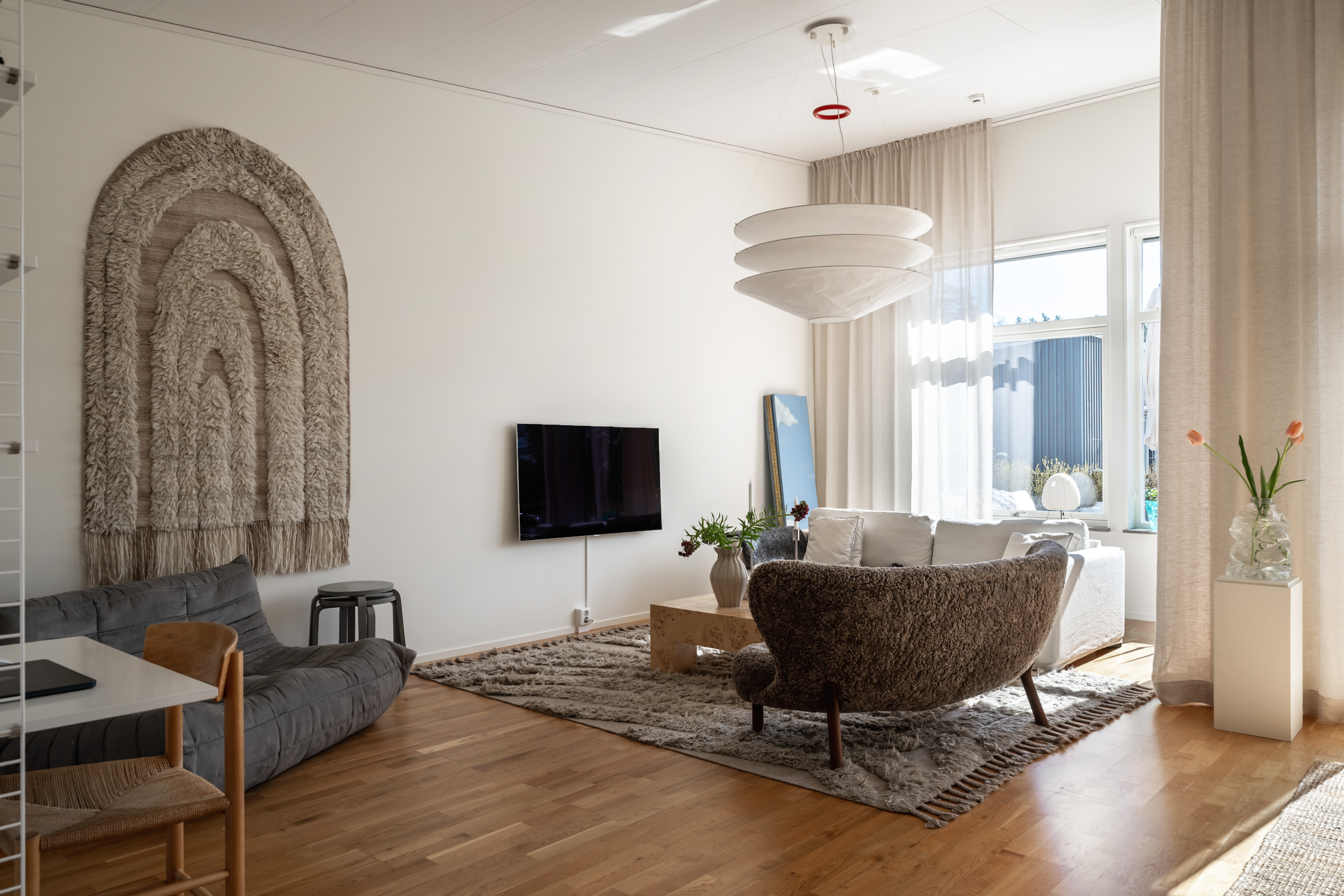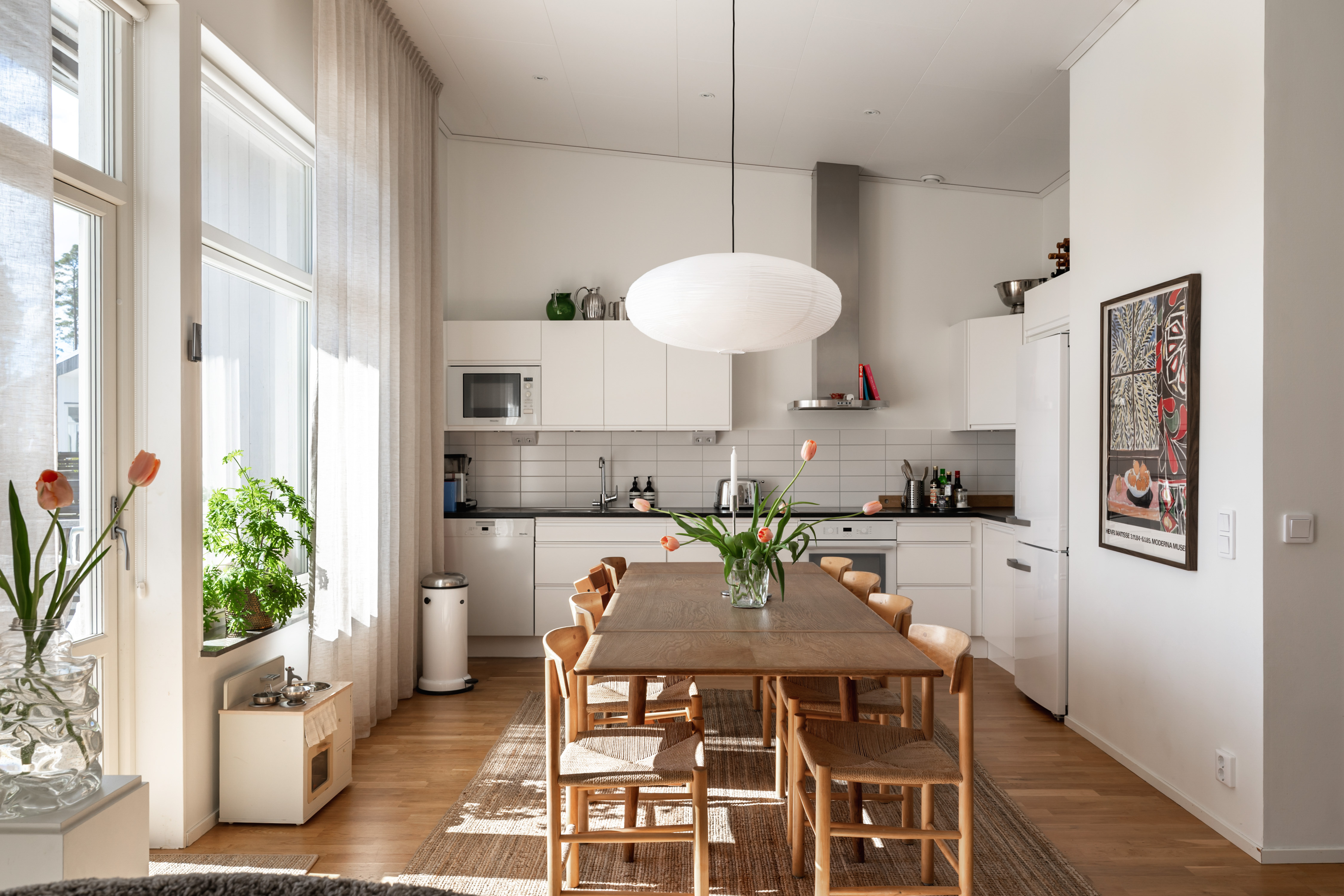 - Parkettgolv och målade väggar. - Öppen planlösning mot köket. - 3,6 meter i takhöjd som högst. Stora fönster som get härligt ljusinsläpp.