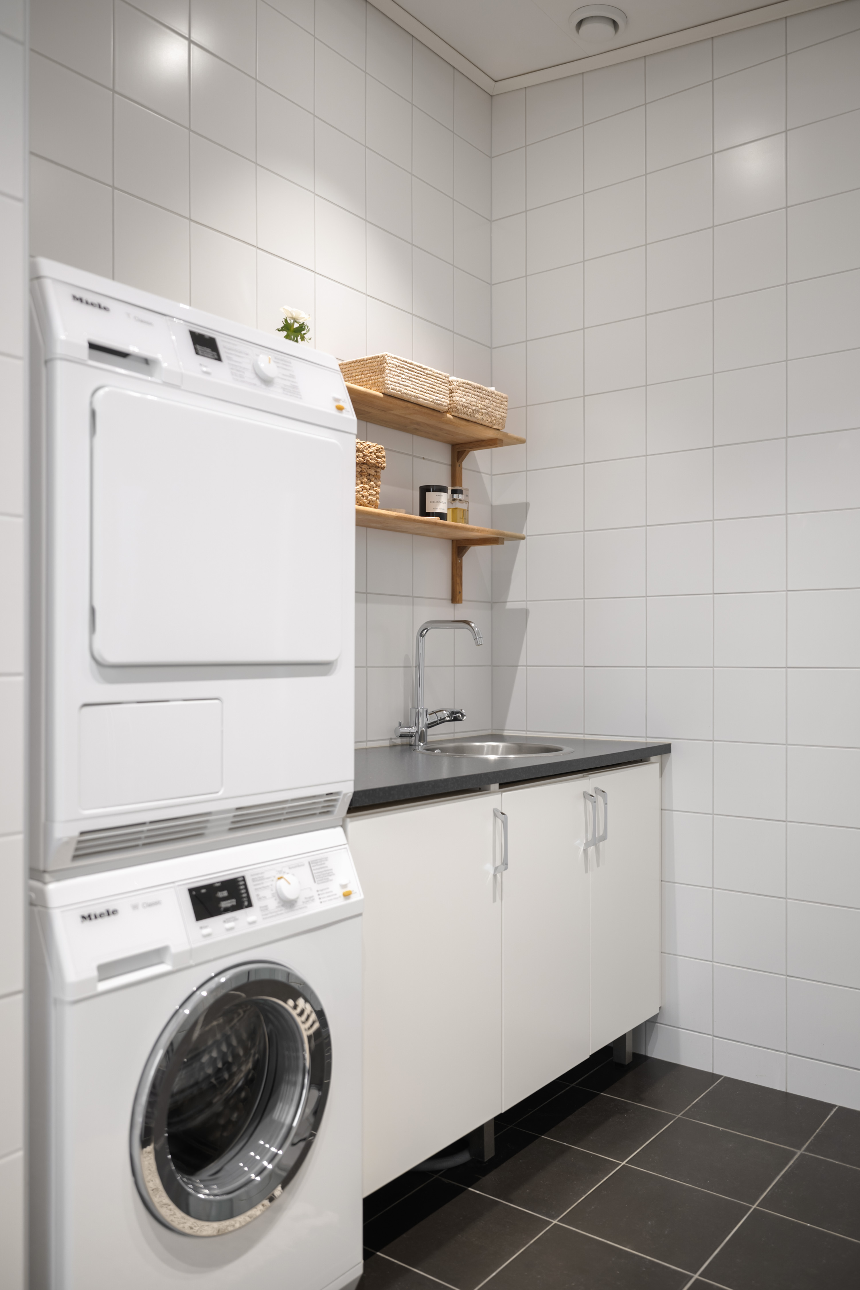 - Klinkergolv och kaklade väggar. - WC-stol, dusch med duschvägg i glas, handfat med kommod samt väggskåp. - Tvättmaskin och torktumlare från Miele. - Vask med bänkskiva i mörk laminat.