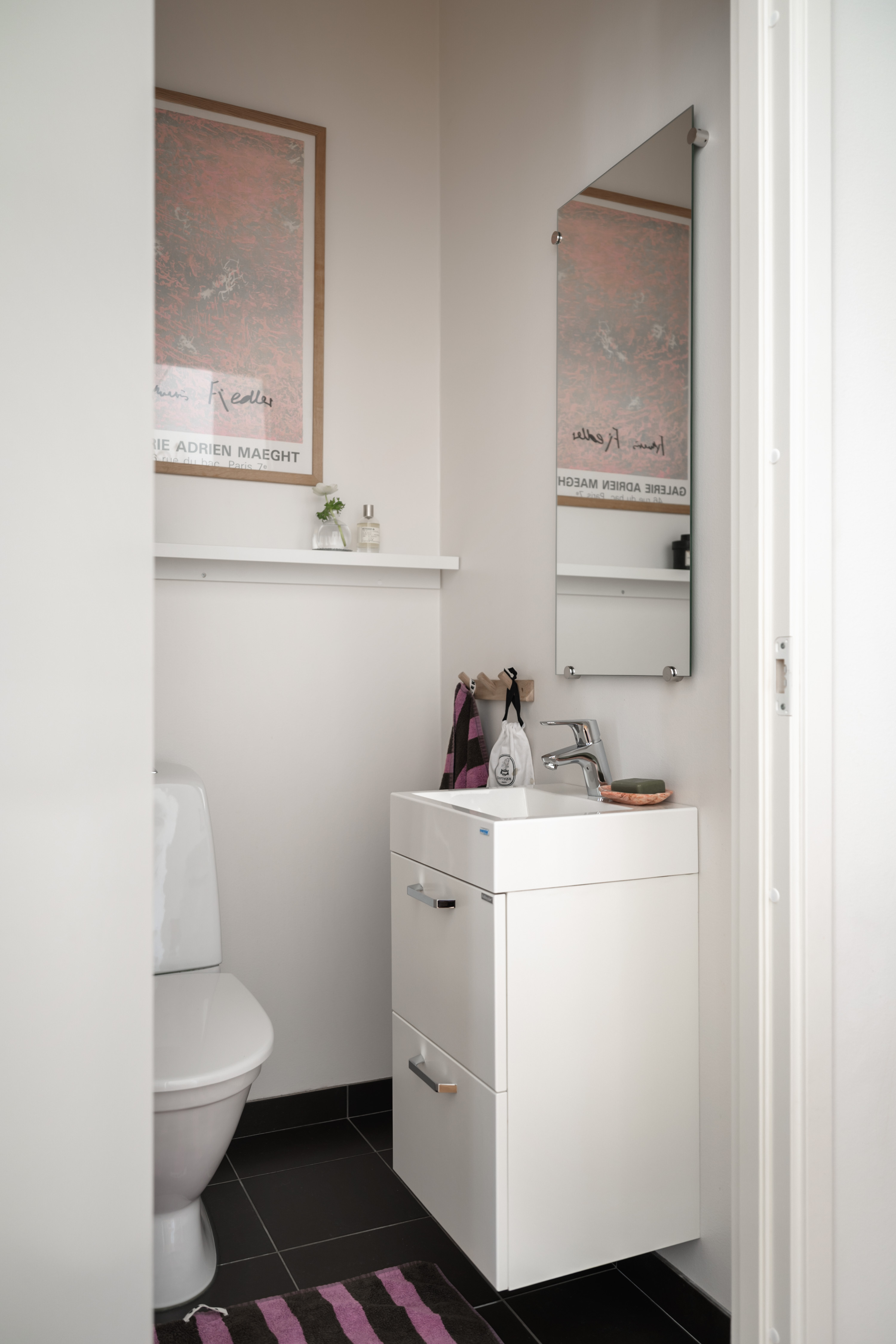 - Klinkergolv och målade väggar. - WC-stol och handfat med kommod.