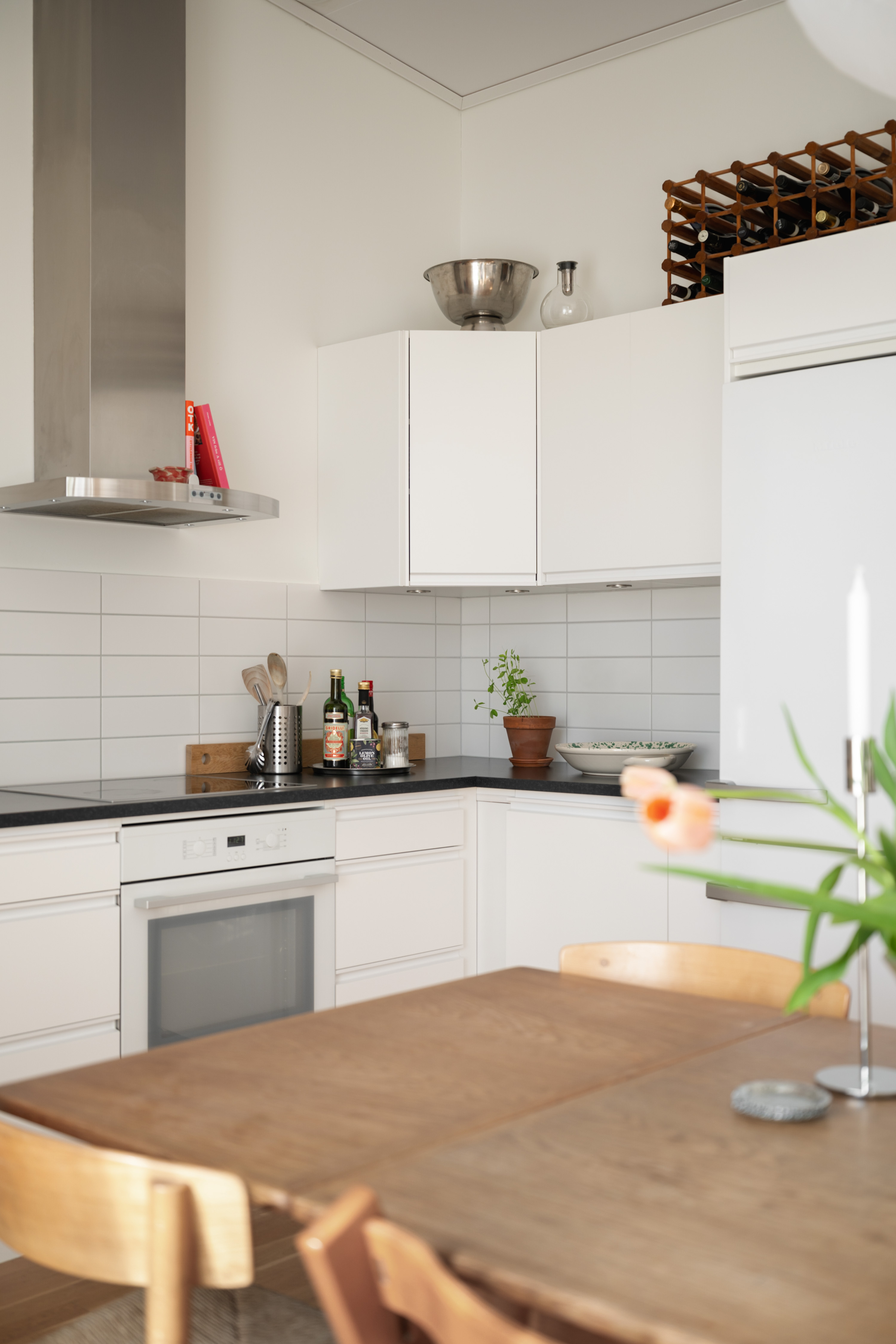 - Parkettgolv och målade väggar. - Köksinredning från Ballingslöv med vita skåpsluckor och bänkskiva i mörk laminat. - Samtliga vitvaror är från Miele: induktionshäll, inbyggnadsugn, inbyggnadsmicro, diskmaskin, kyl/frys. - Fläkten är från Fjäråskupan. - Infällda spotlights i tak.