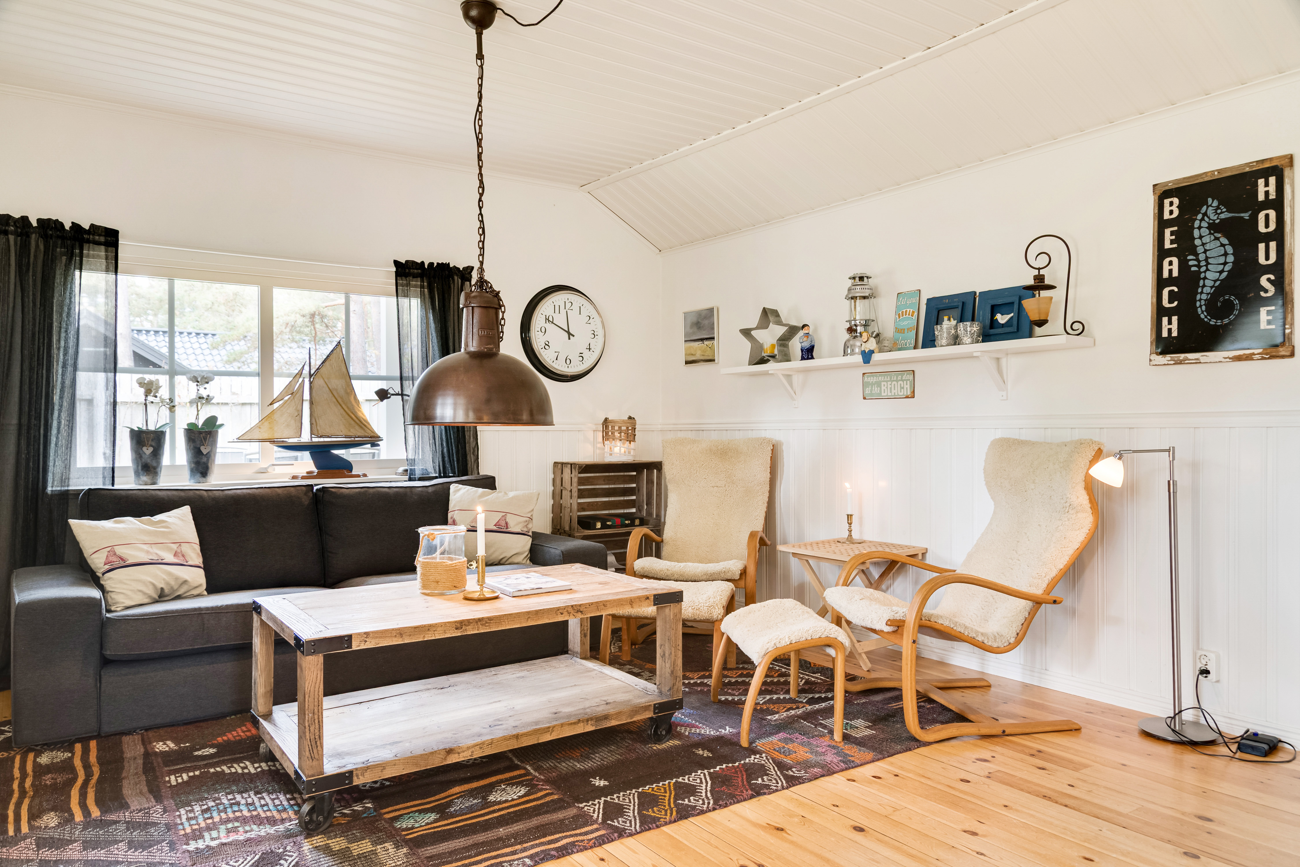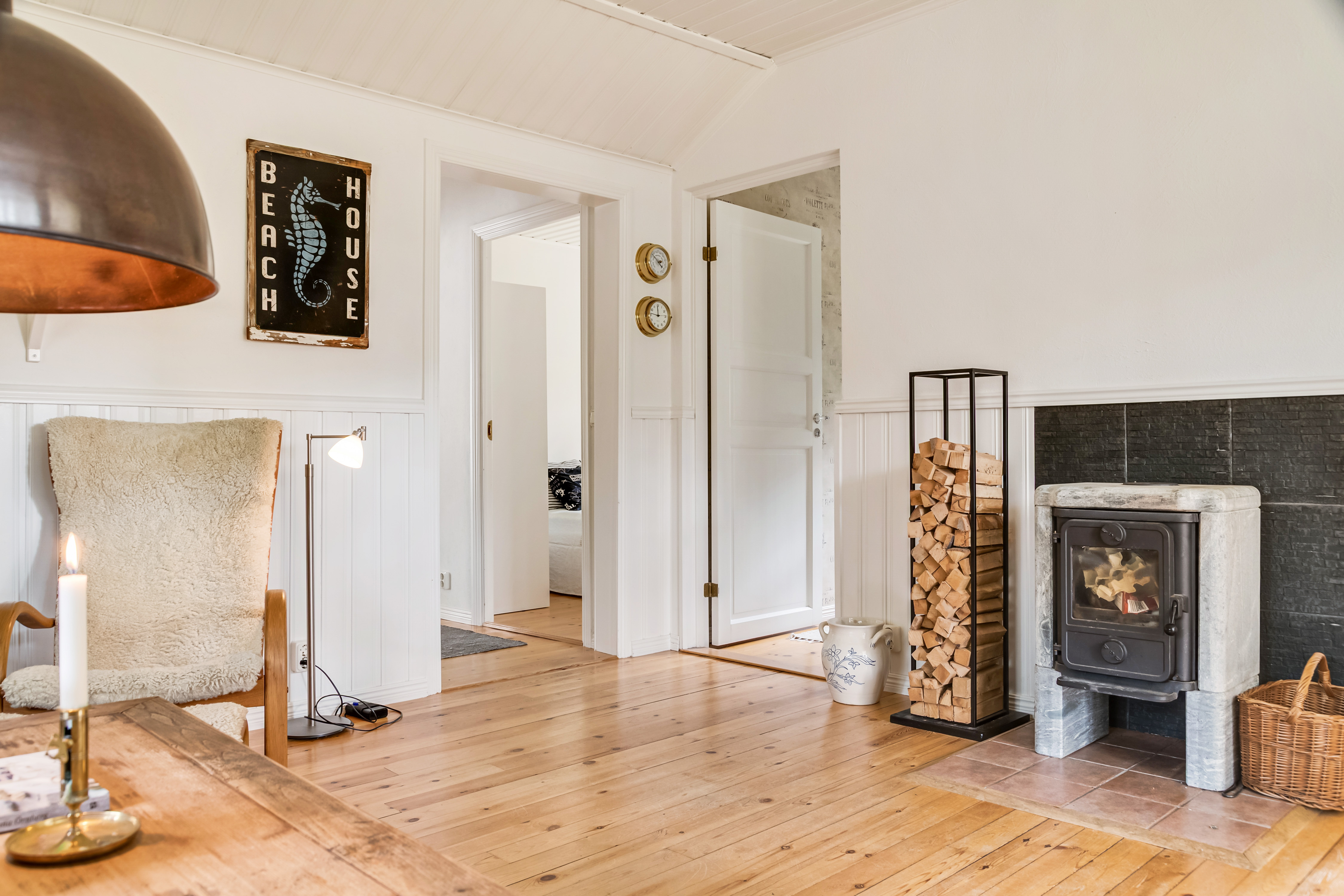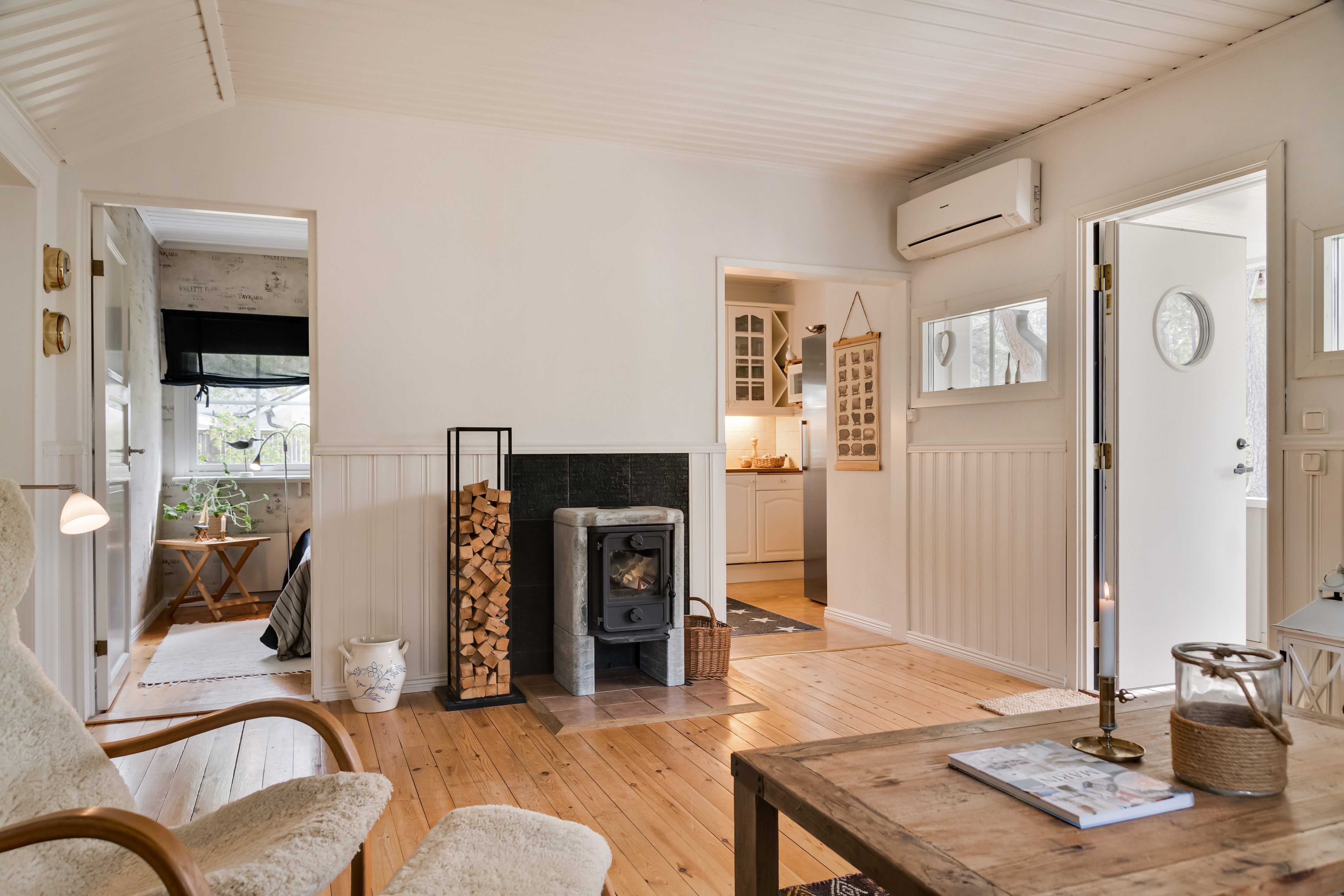 Trägolv, bröstpanel, målad vägg och vitmålad takpanel. Täljstenskamin och luft/luft-värmepump