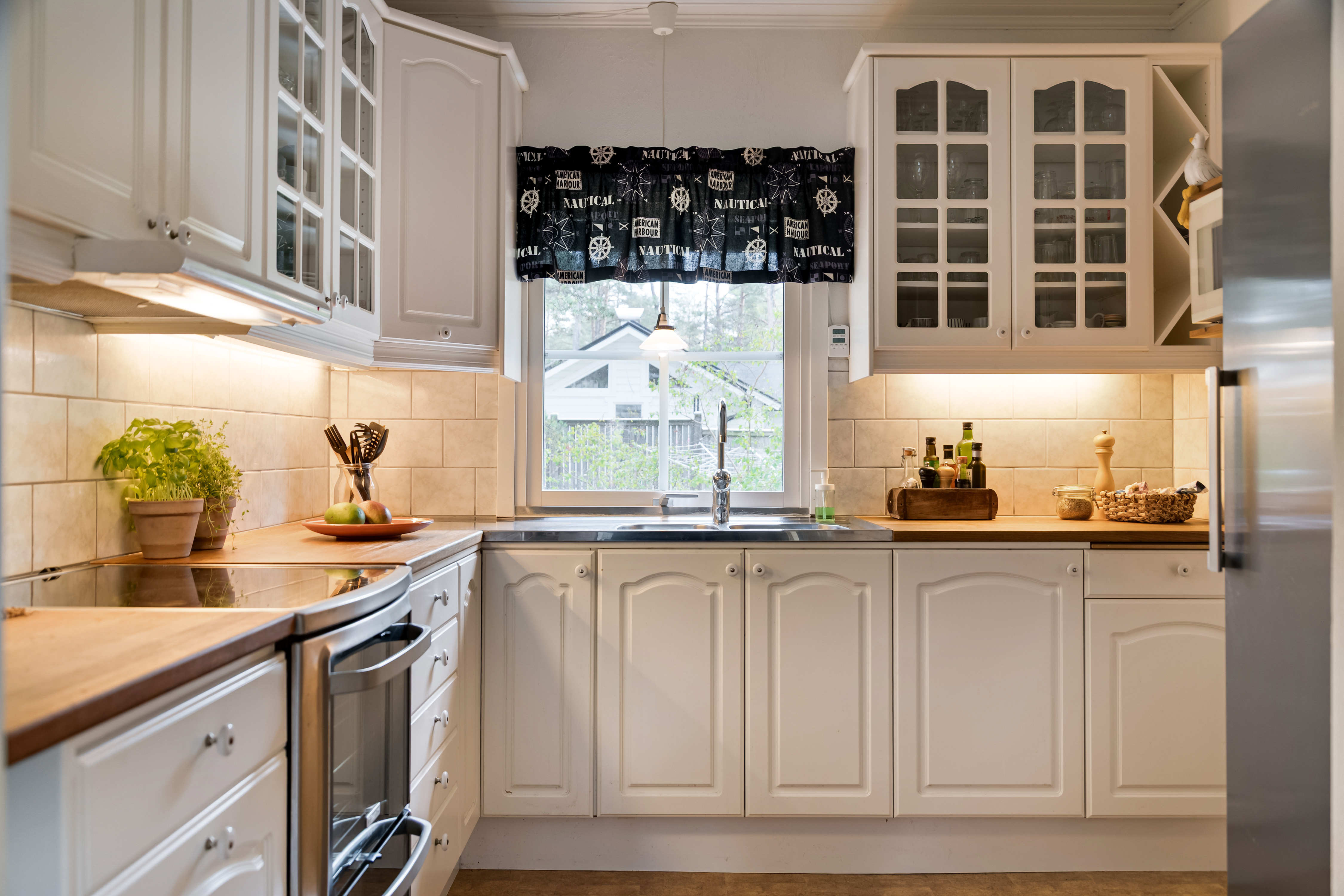 Plastgolv, kakel, målad vägg, vitlackerade speglade luckor. Kylskåp, (frys i förråd), spis med induktionshäll.