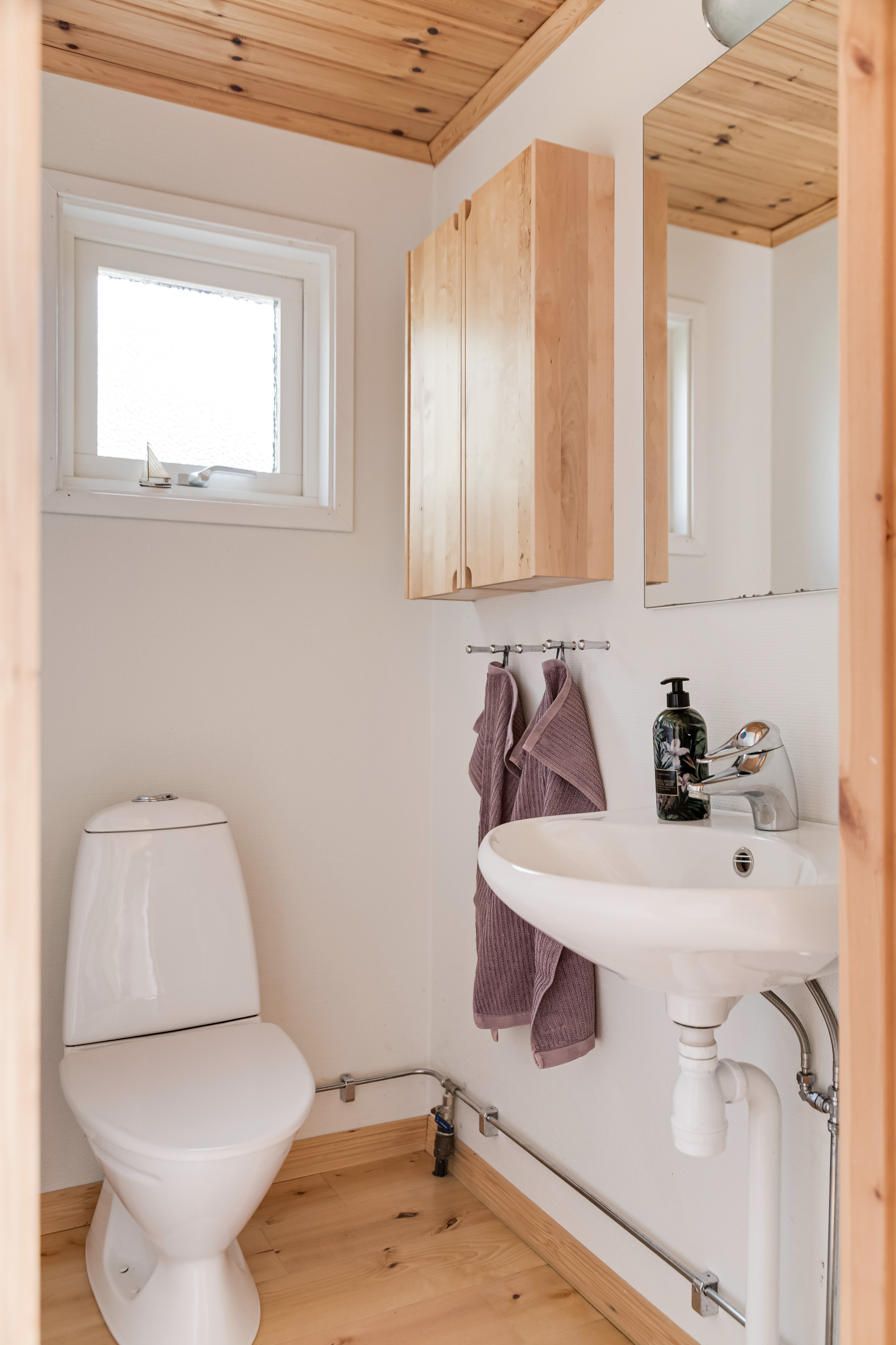 Bokparkett och målad vägg. Wc och handfat.