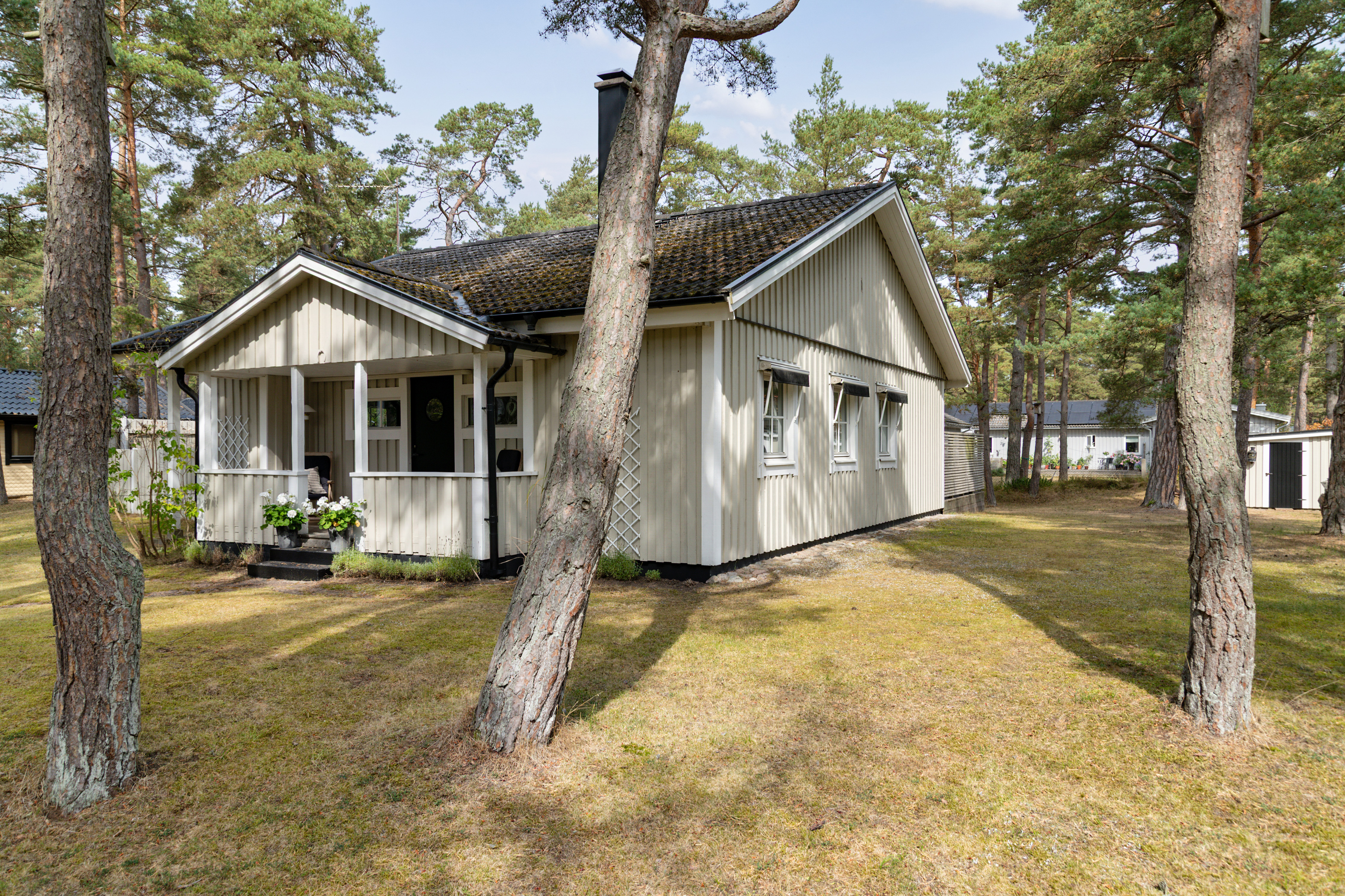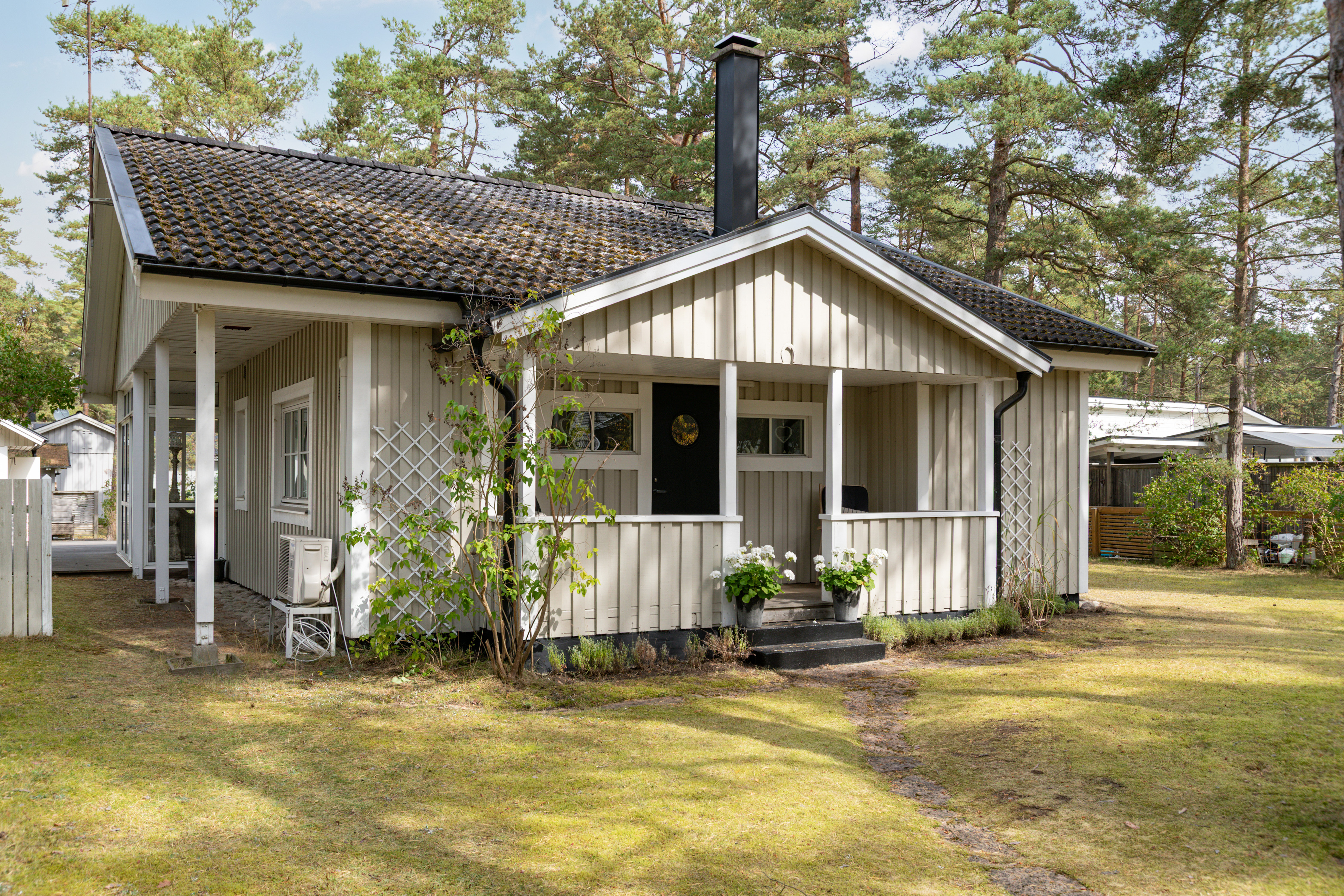 Uterum med infravärme och spotlights i tak. Stora trädäck vid hus och gästhus. Veranda med trädäck på framsidan.