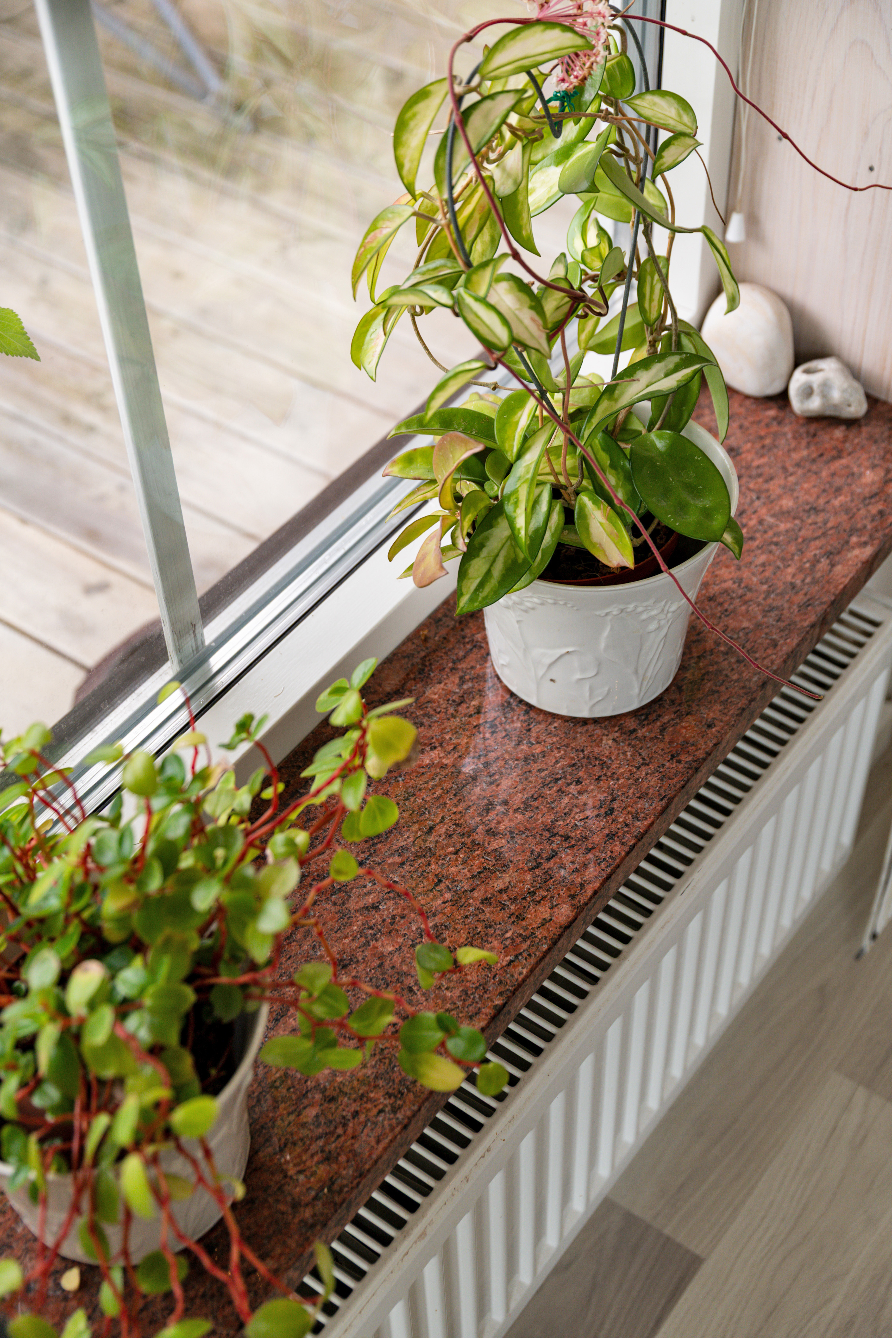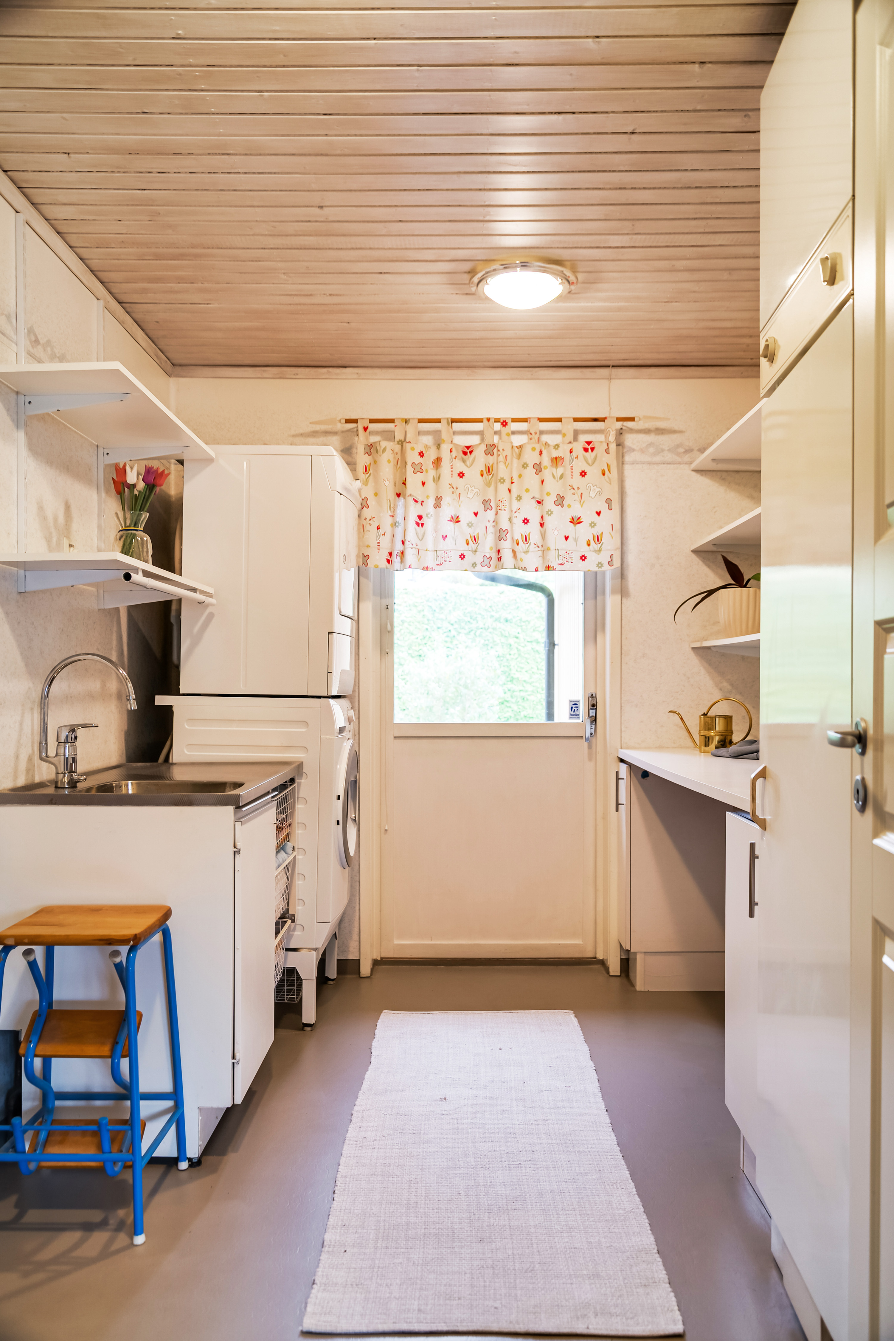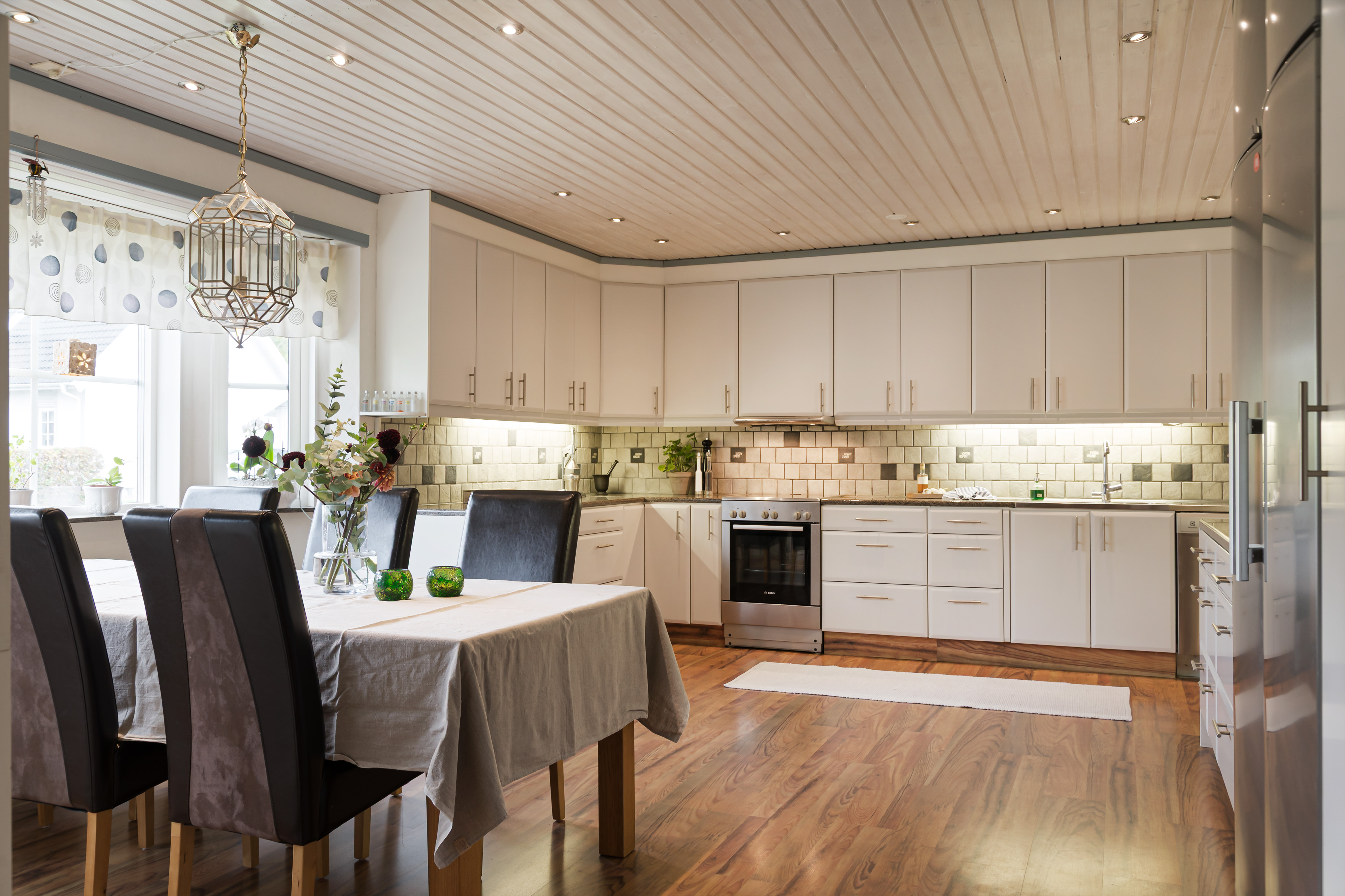Det är panel i tak i samtliga rum och fönsterbänkar i granit i hela huset.