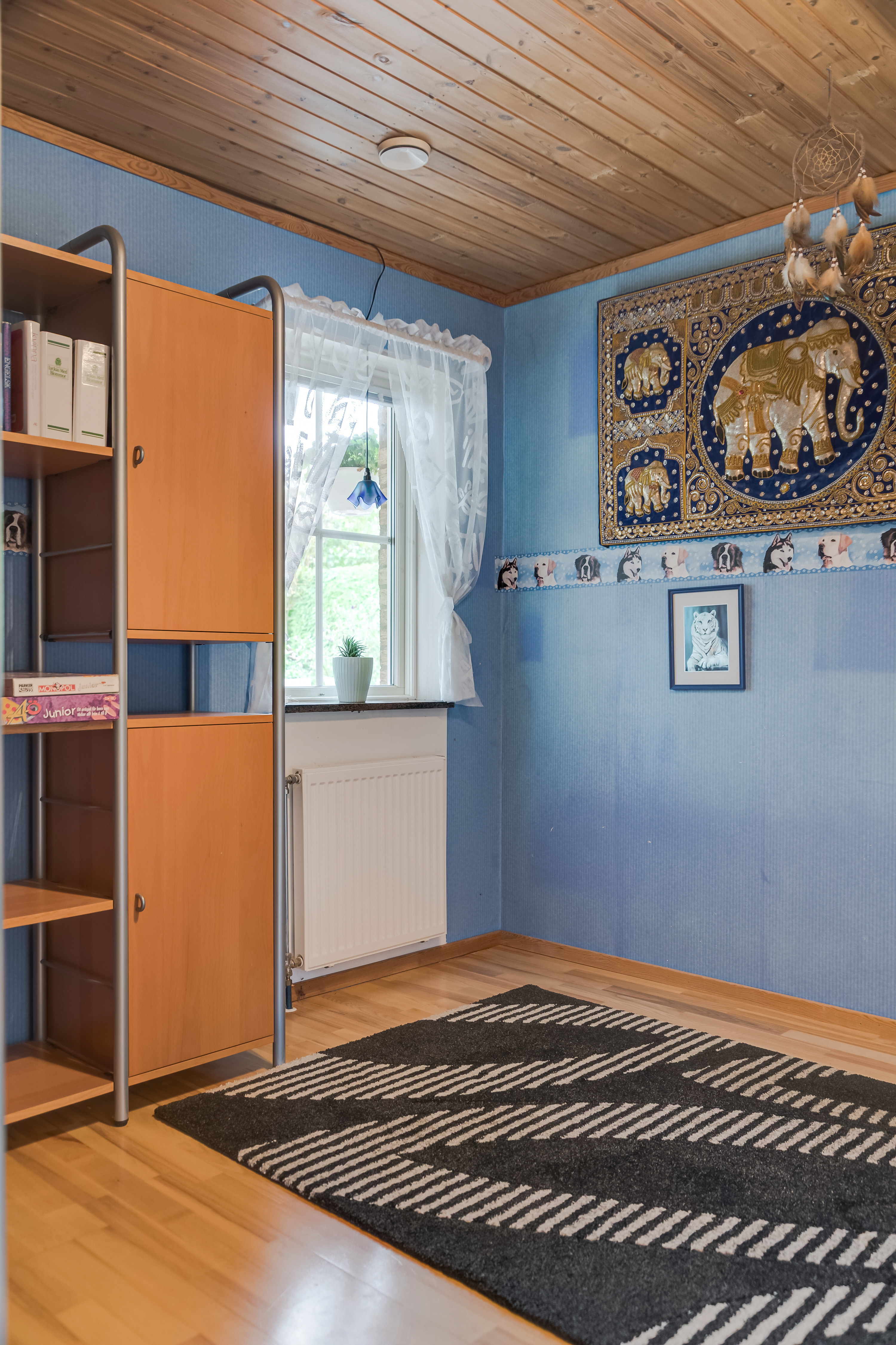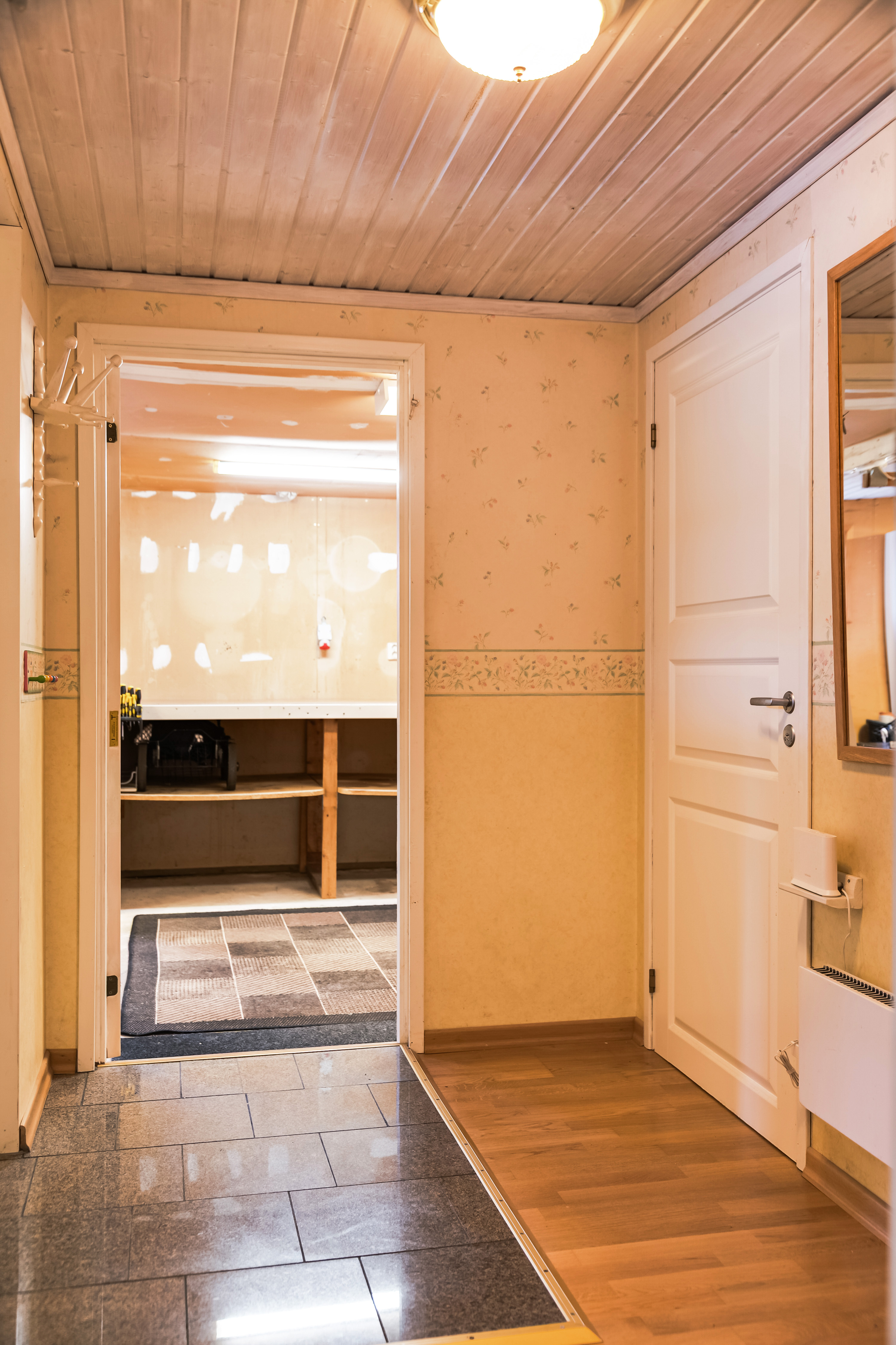 Parkettgolv och tapet. Täljstensugn, är godkänd, sotad 2025.