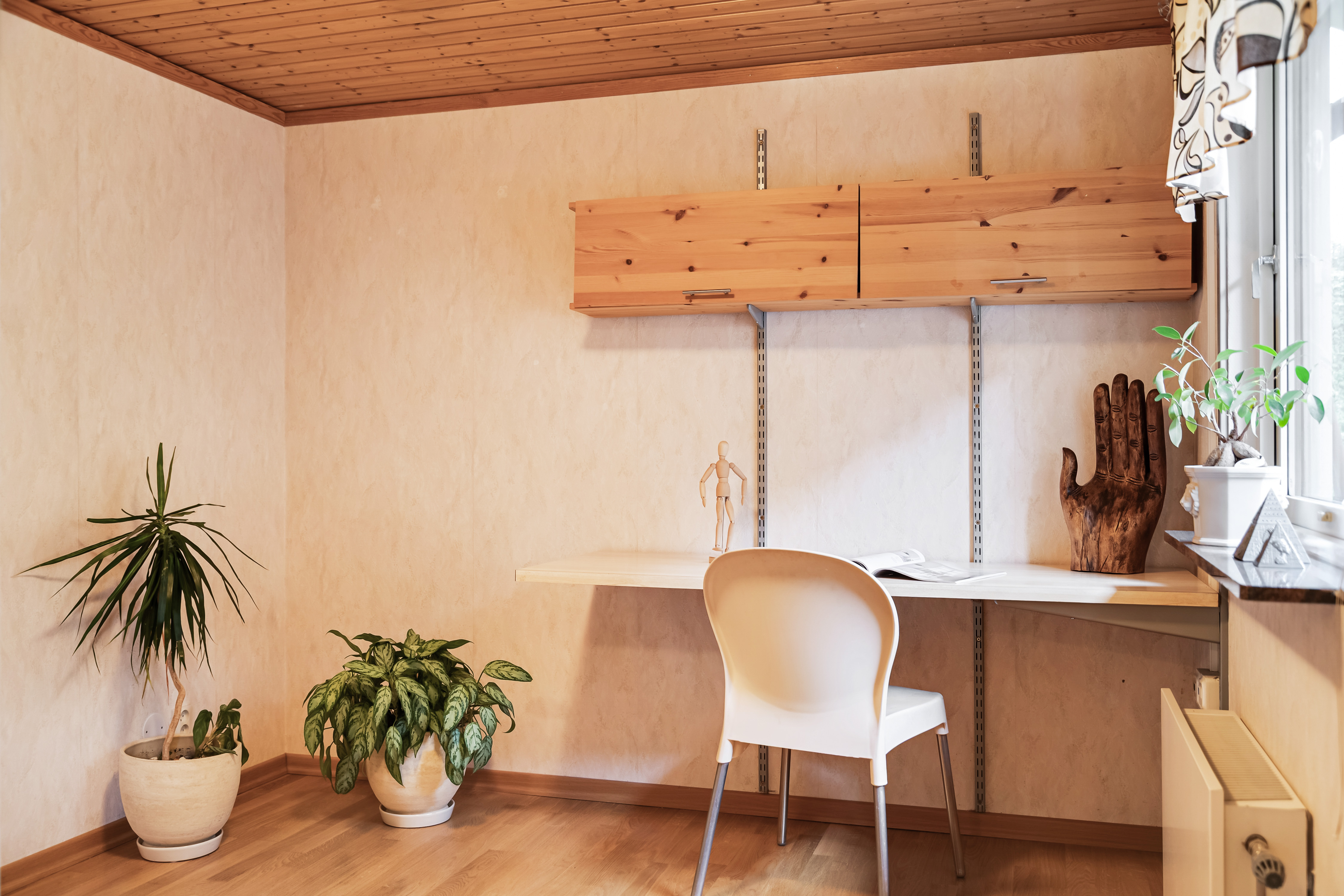 Parkettgolv och tapet. Skjutdörrsgarderob.