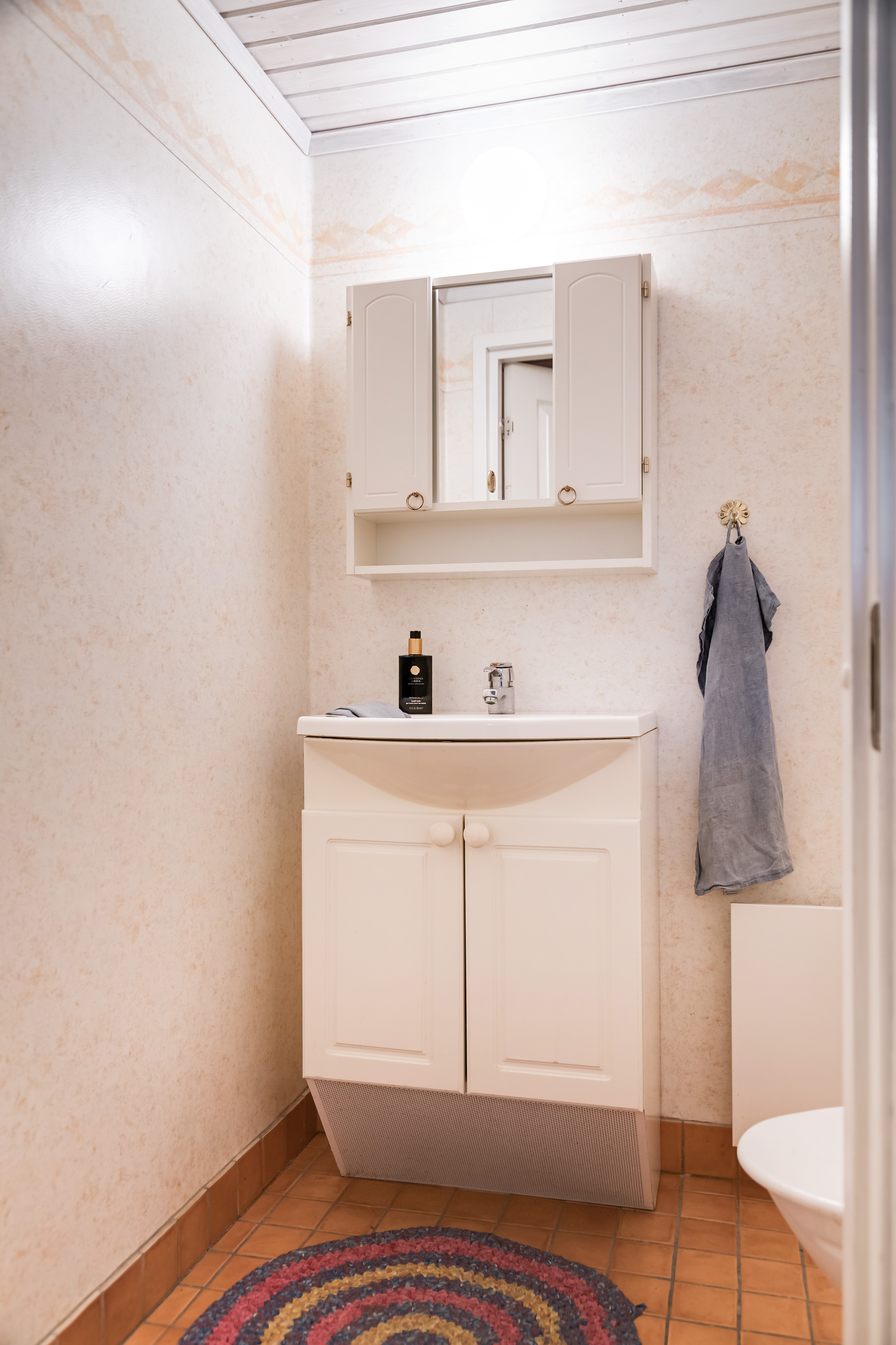 Klinkergolv och tapet. WC, handfat med kommod, spegelskåp.