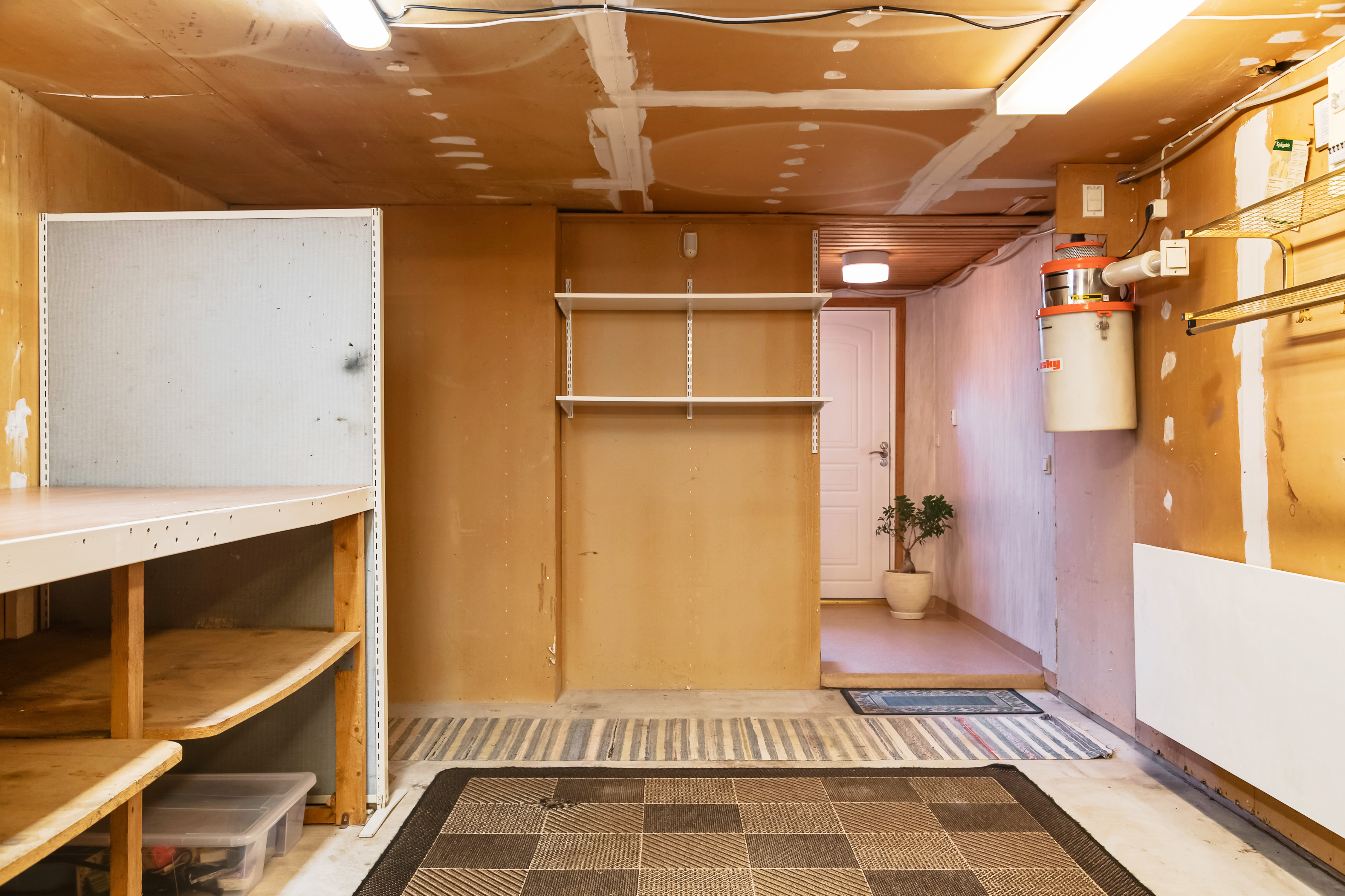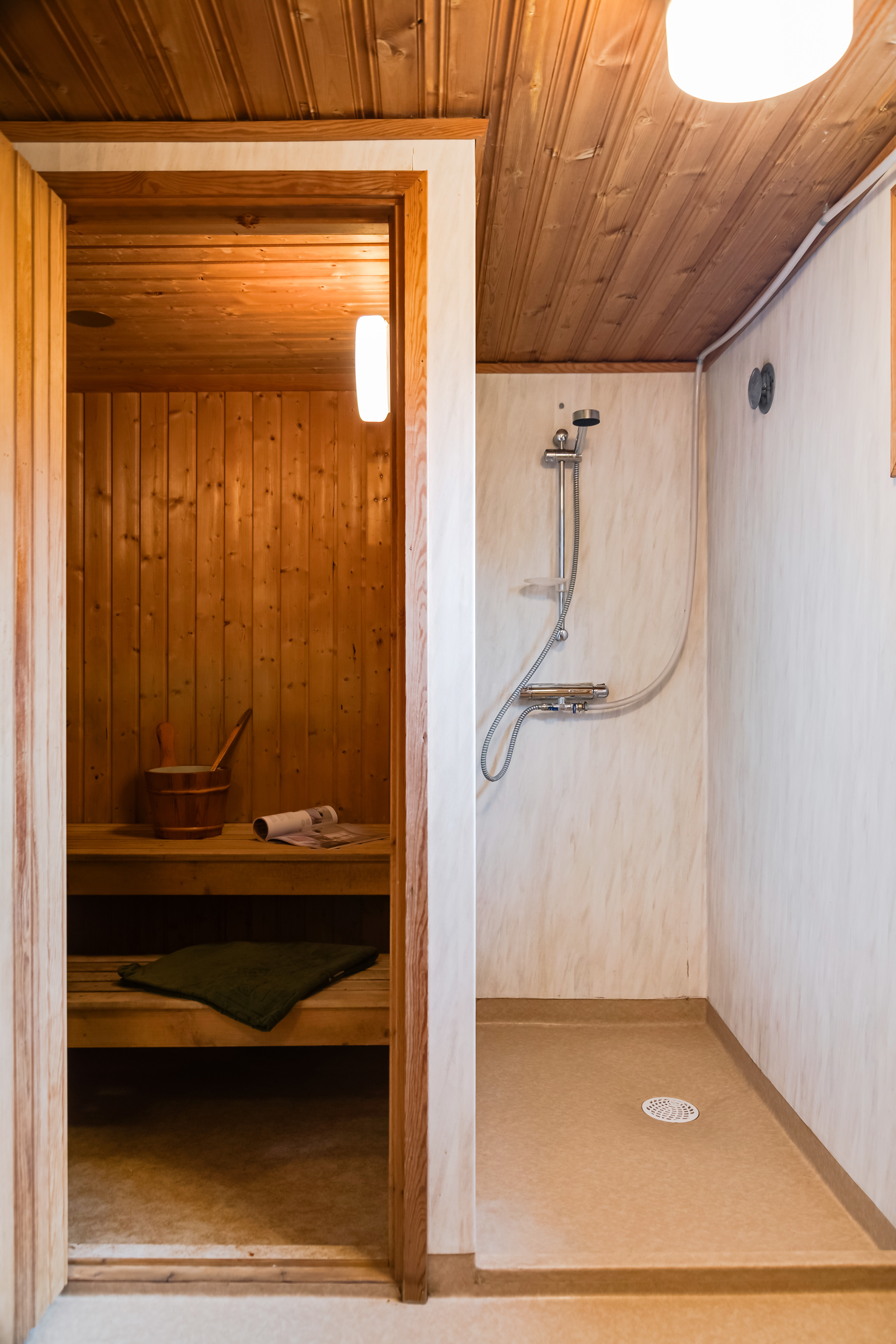 Garaget som är sammanbyggt med huset har i bakre delen en bastu och duschdel. I duschen är det plastgolv och väggmatta.