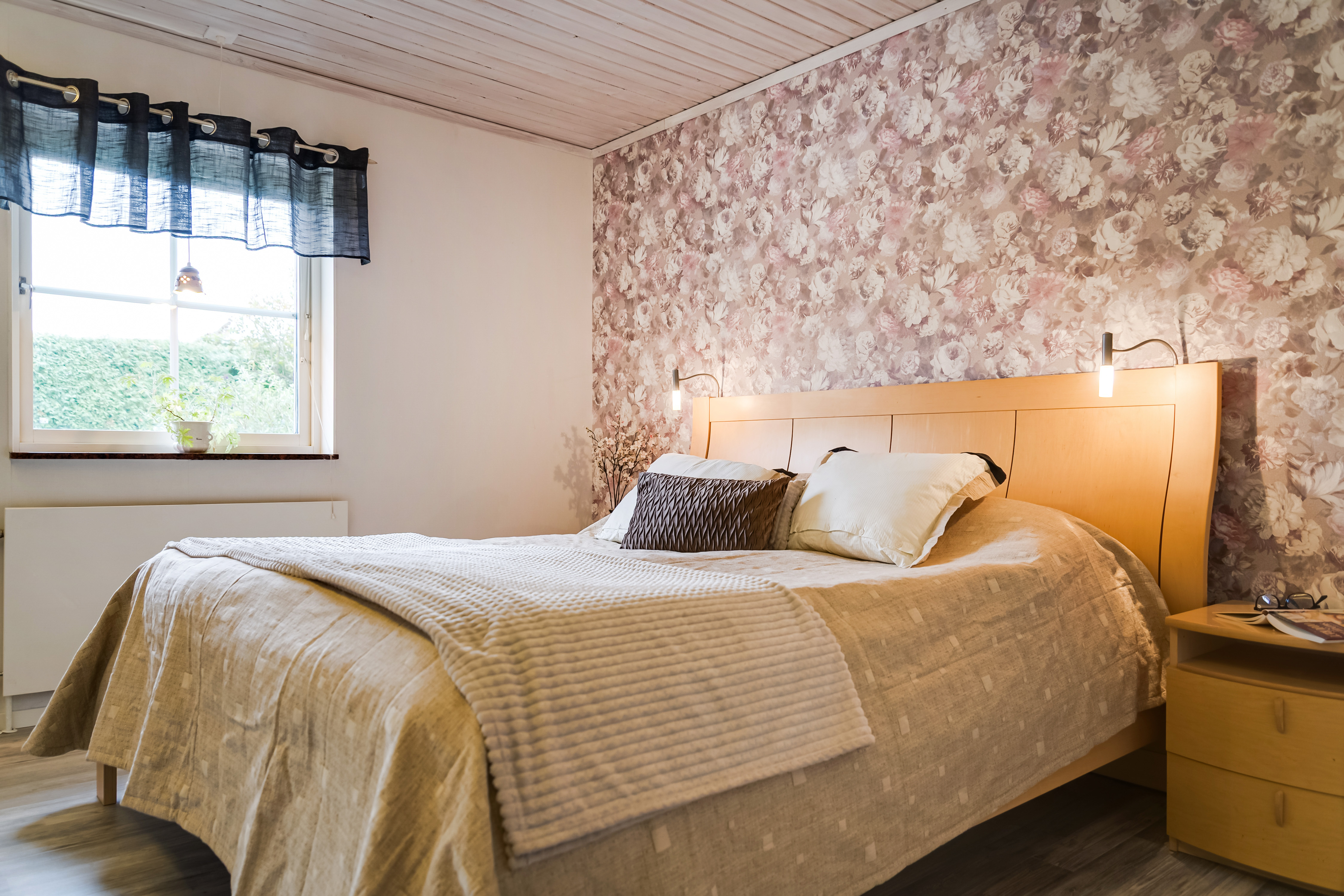 Laminatgolv och målade väggar samt fondtapet. Garderober med skjutdörrar och belysning.
