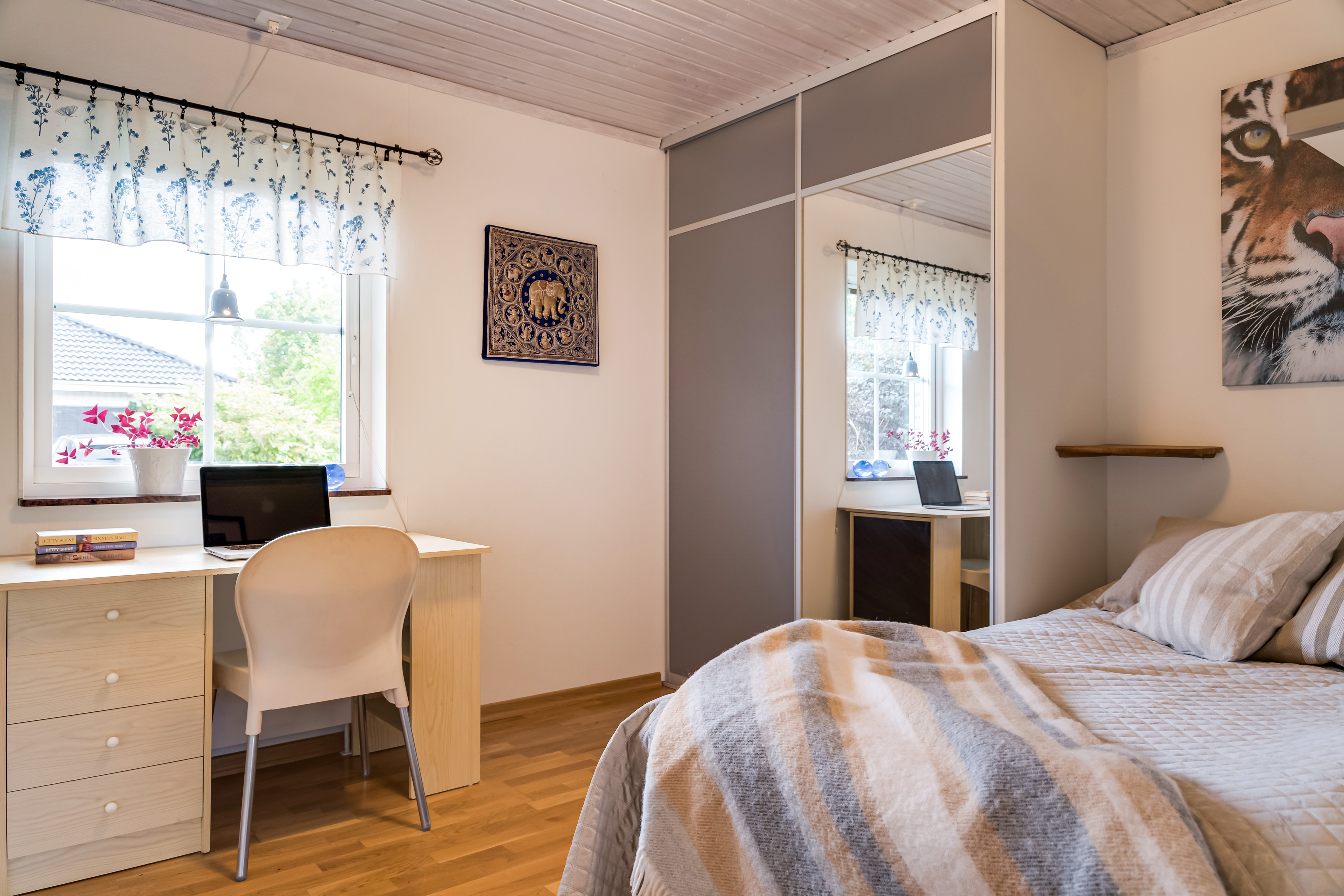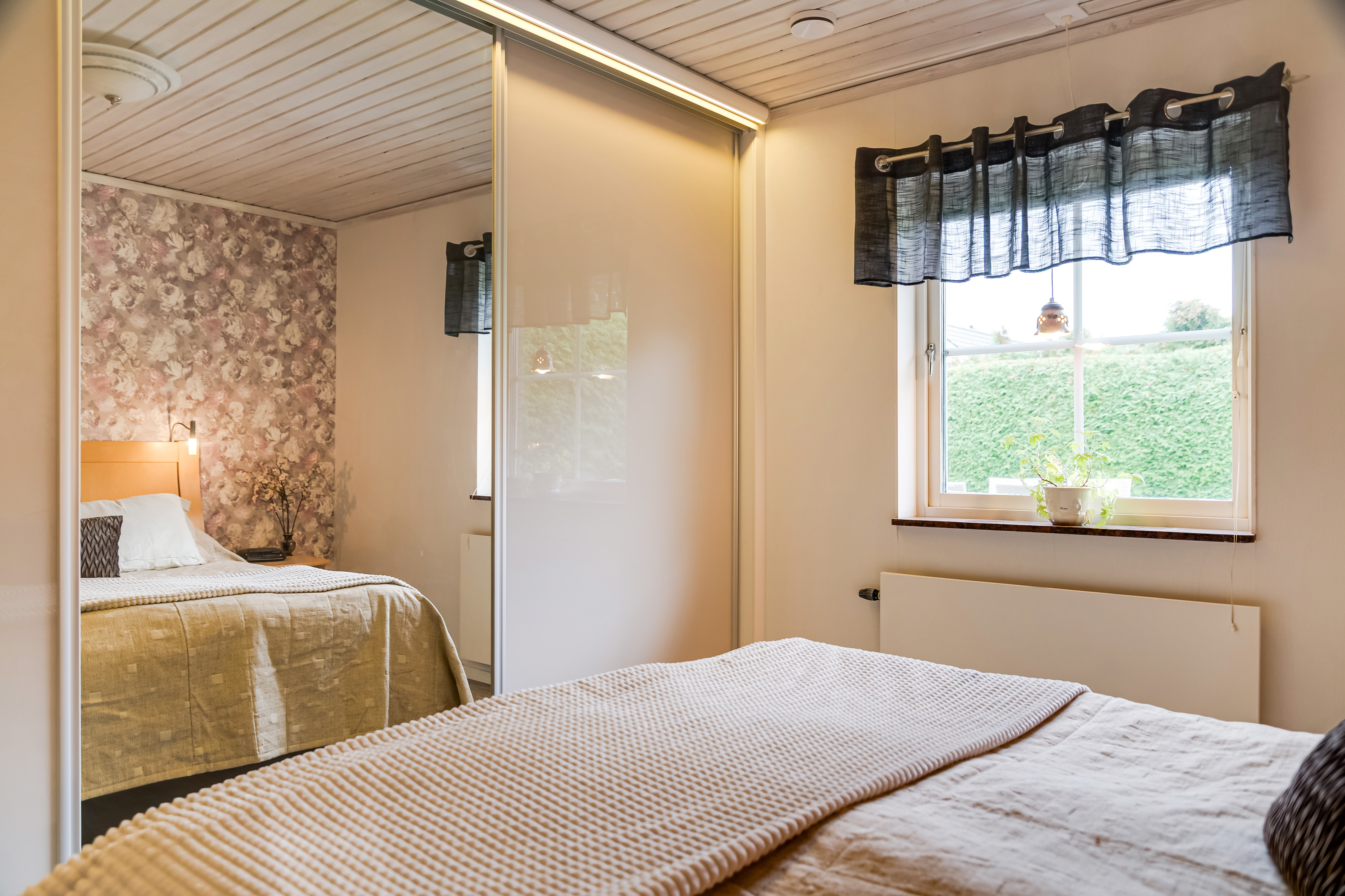 Parkettgolv och målade väggar. Skjutdörrsgarderober.
