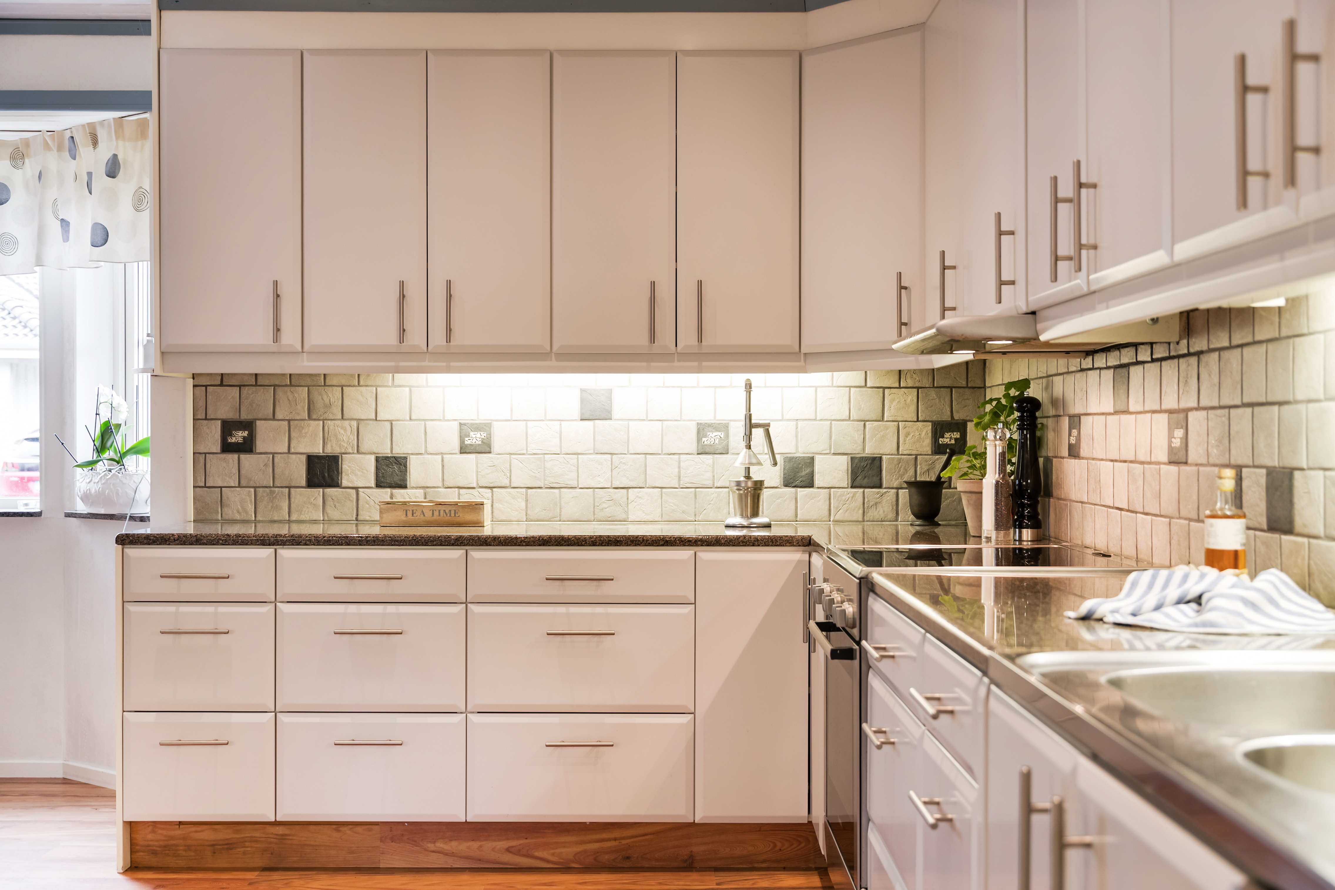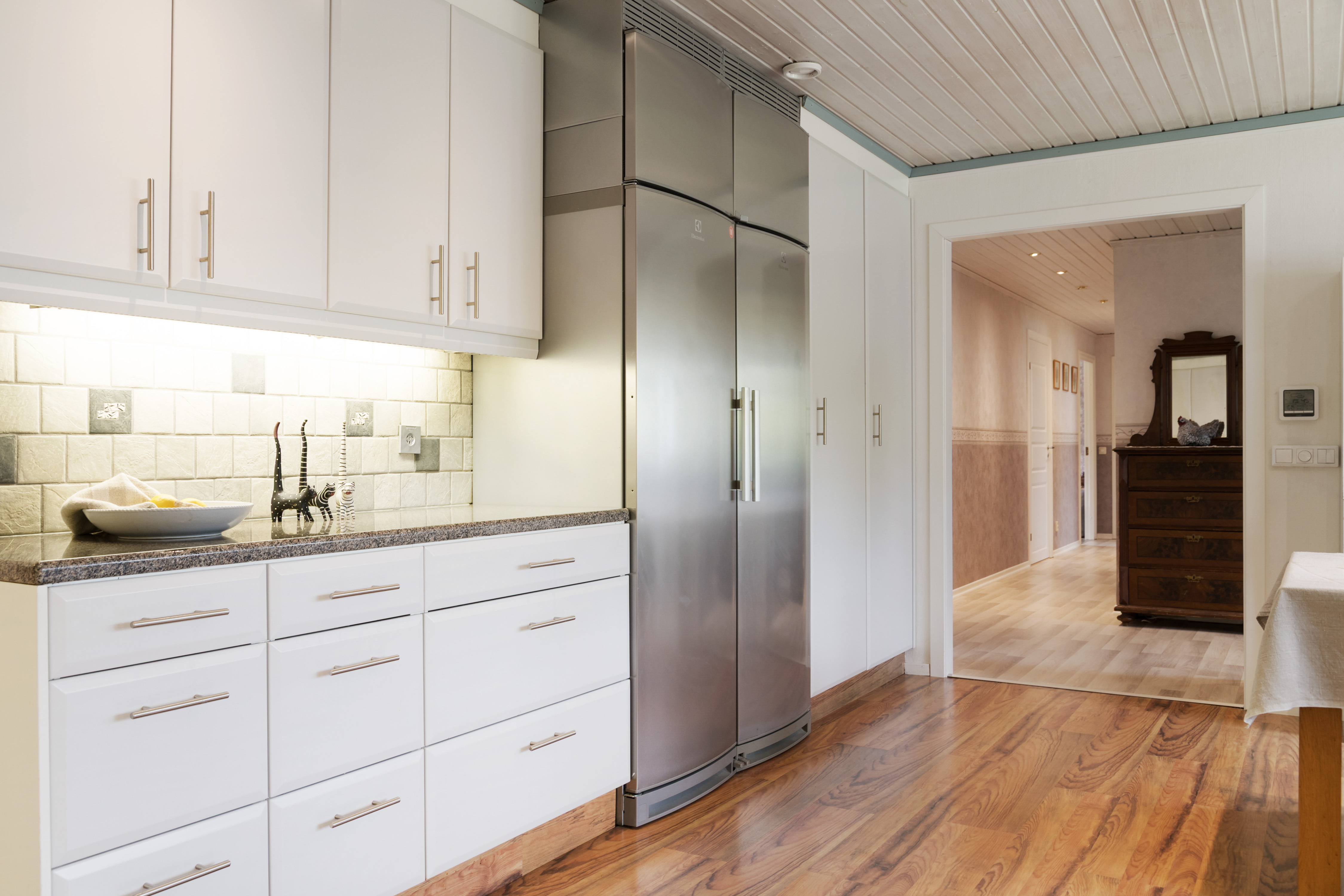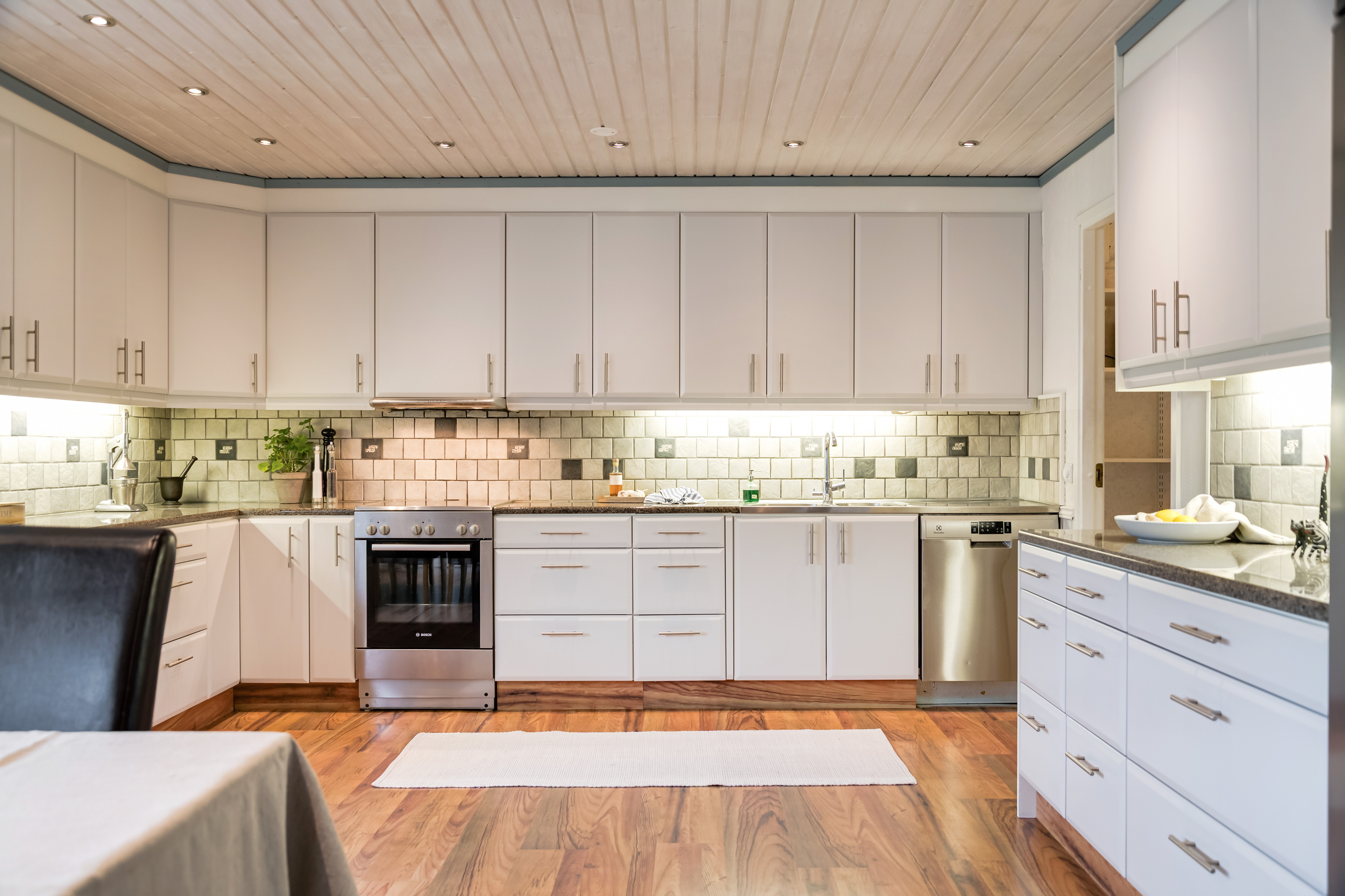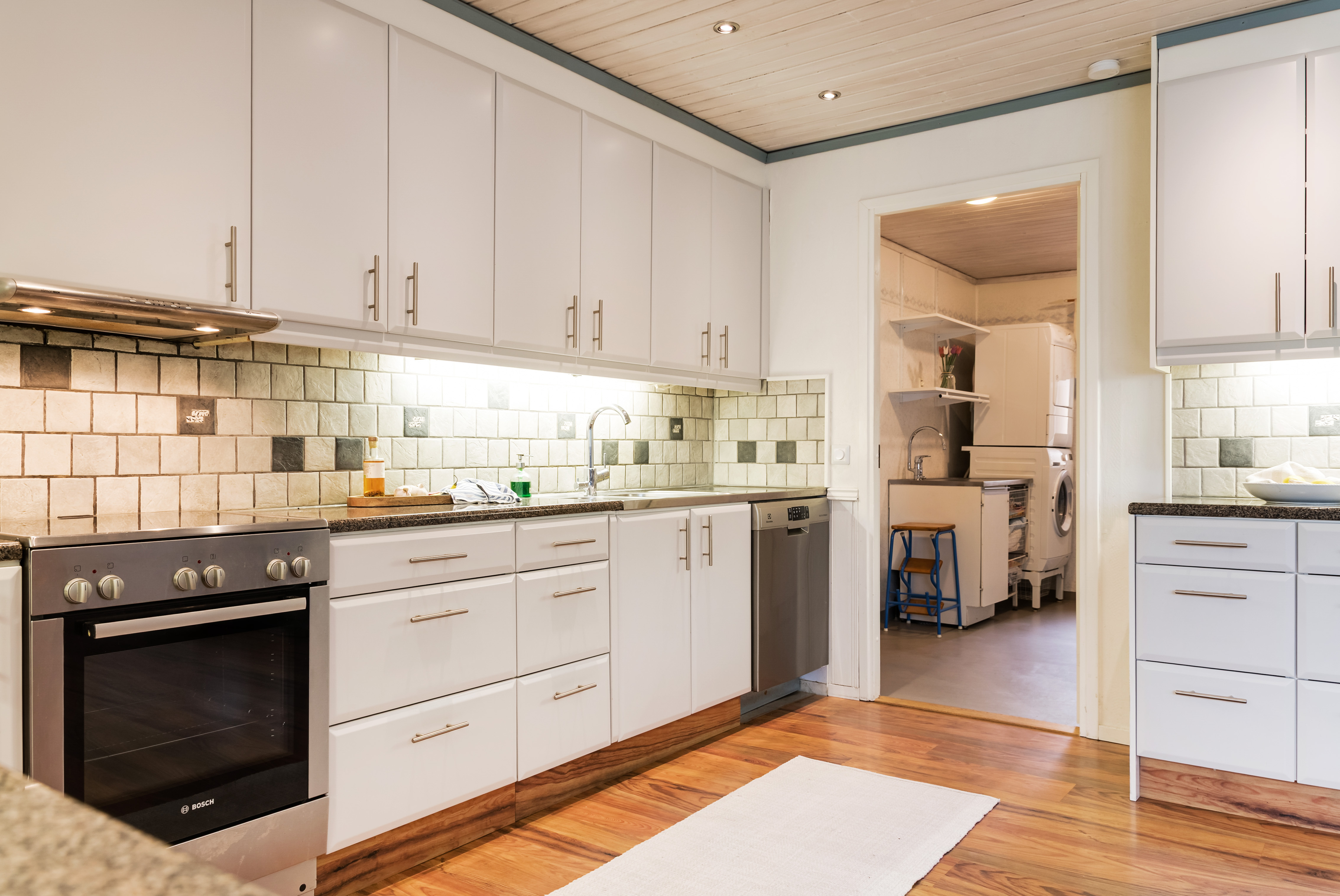 Laminatgolv och tapet. Kakel ovan bänkytor. Ljusgrå inredning från Myresjö kök, bänkskivor i granit, kyl, frys, diskmaskin och spisfläkt från Electrolux. Spis med ugn från Bosch.