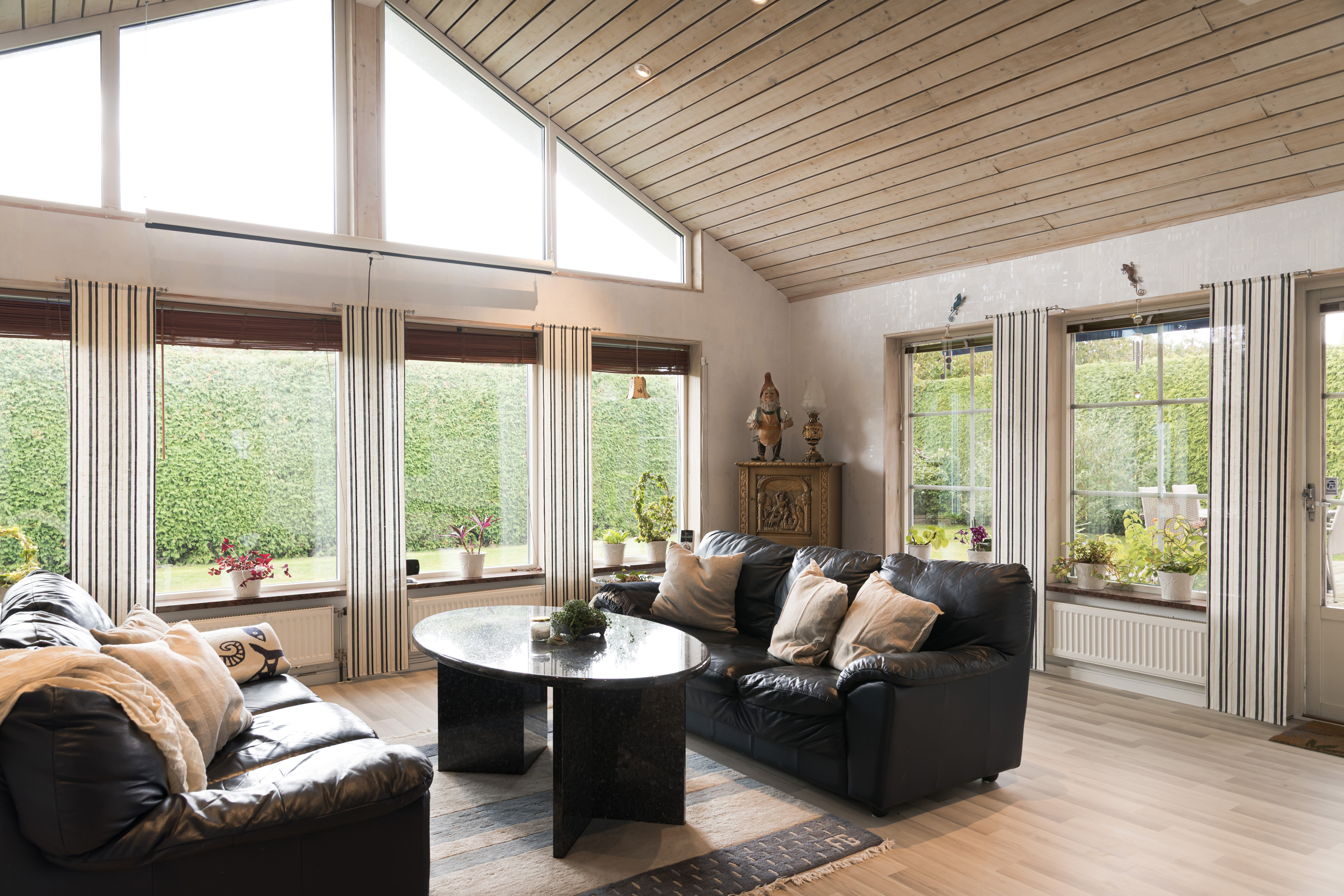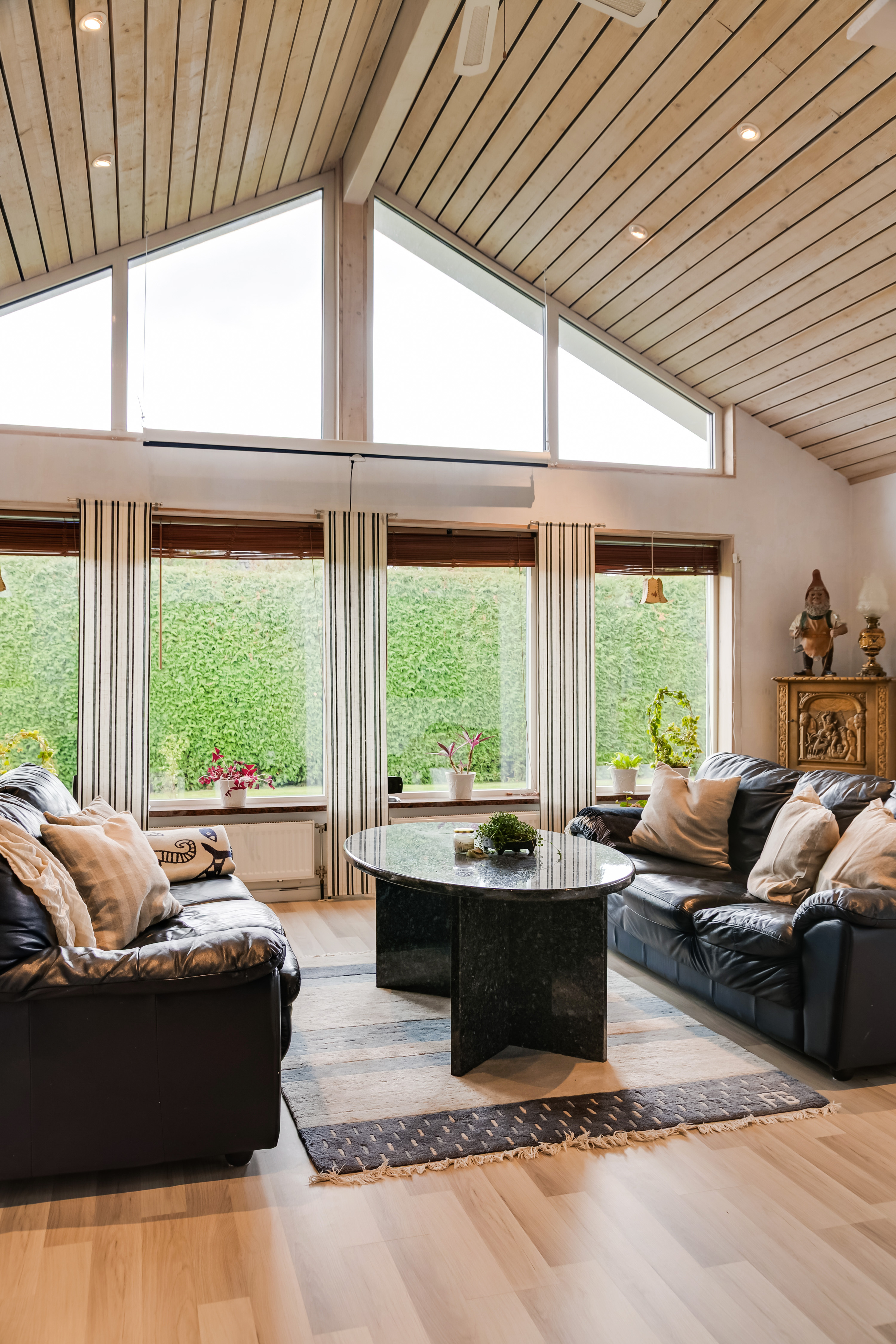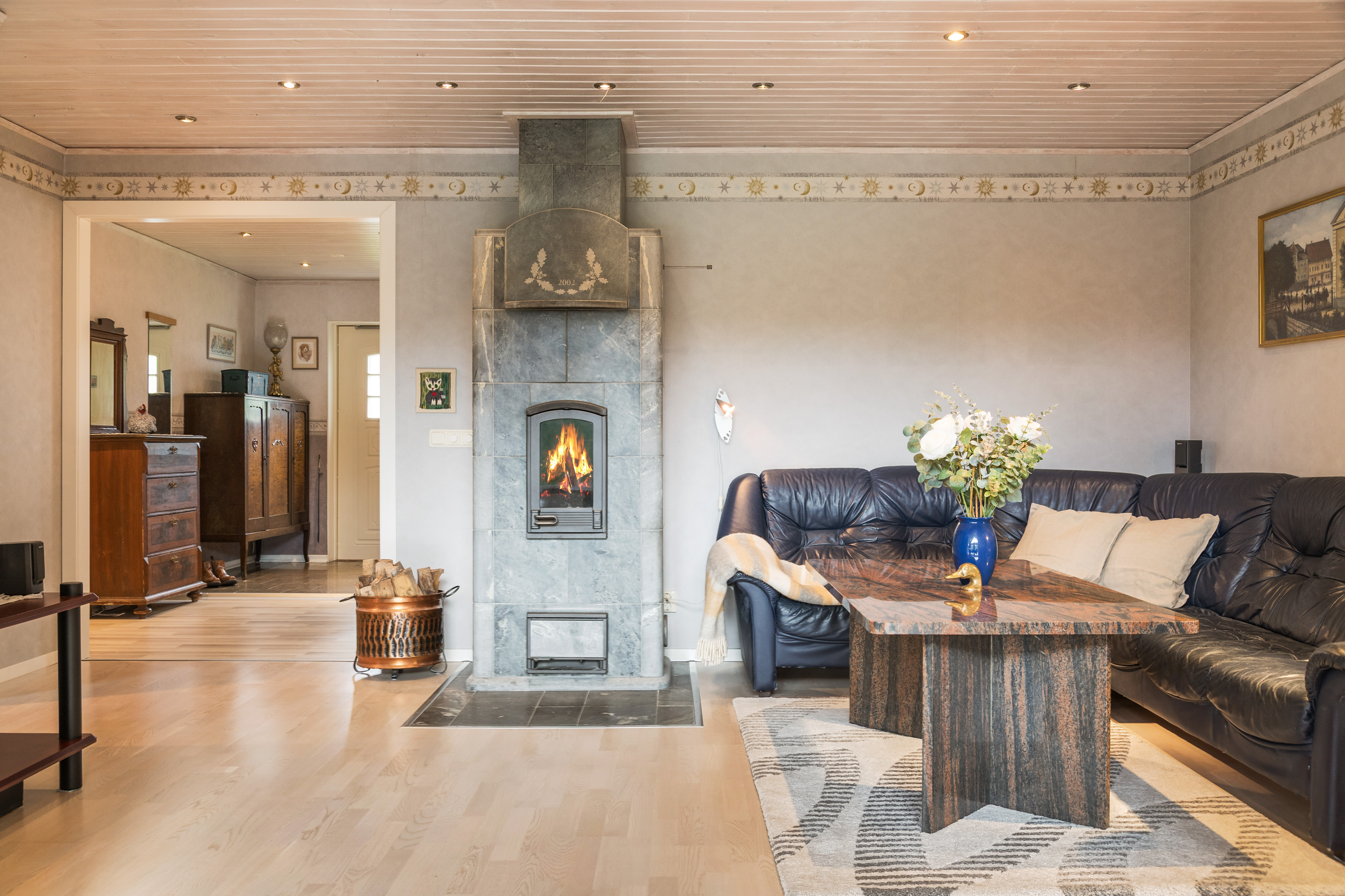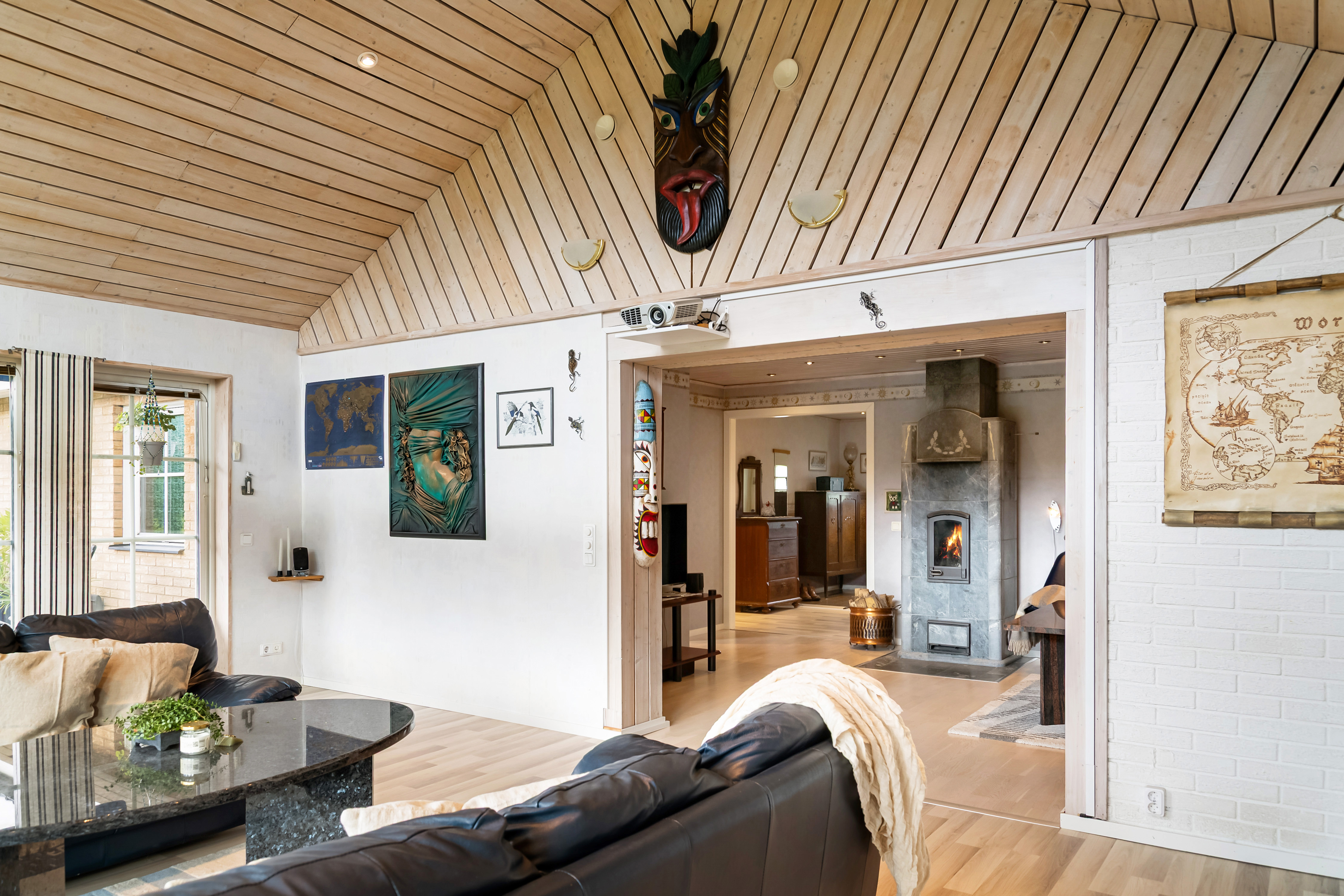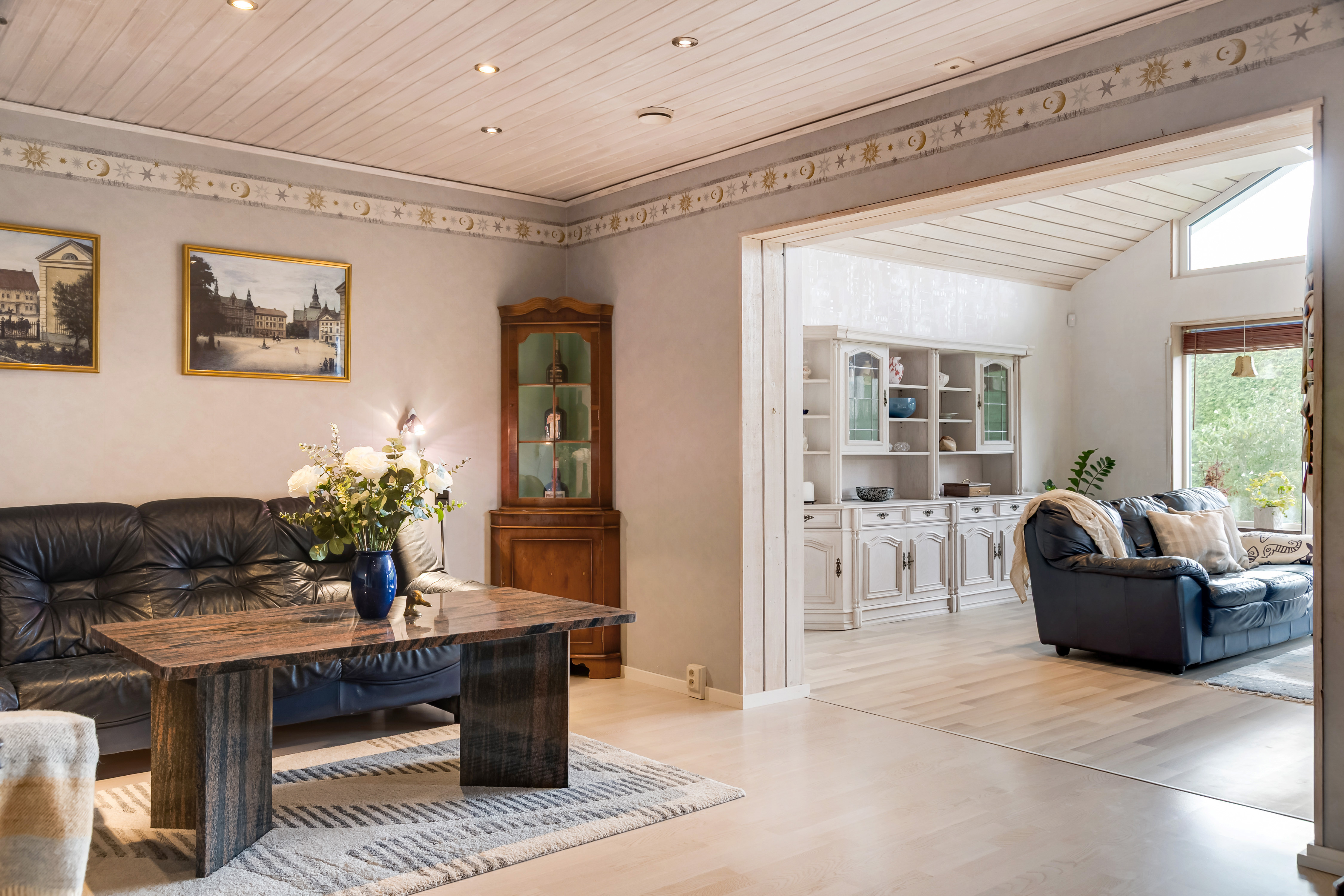 Stort vardagsrum som är öppet upp i nock. Laminatgolv och tapet. Altandörr ut till baksidans trädäck.