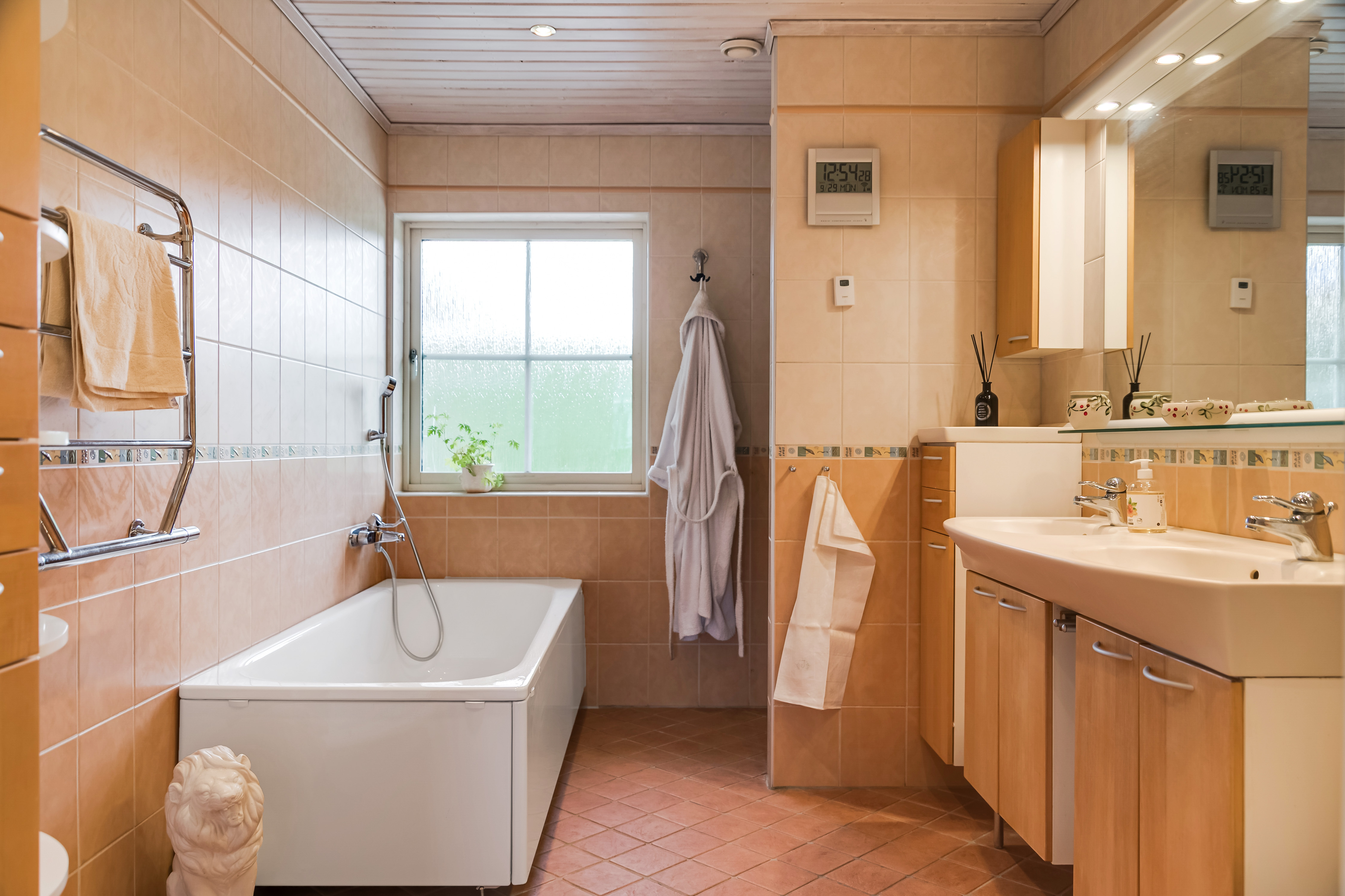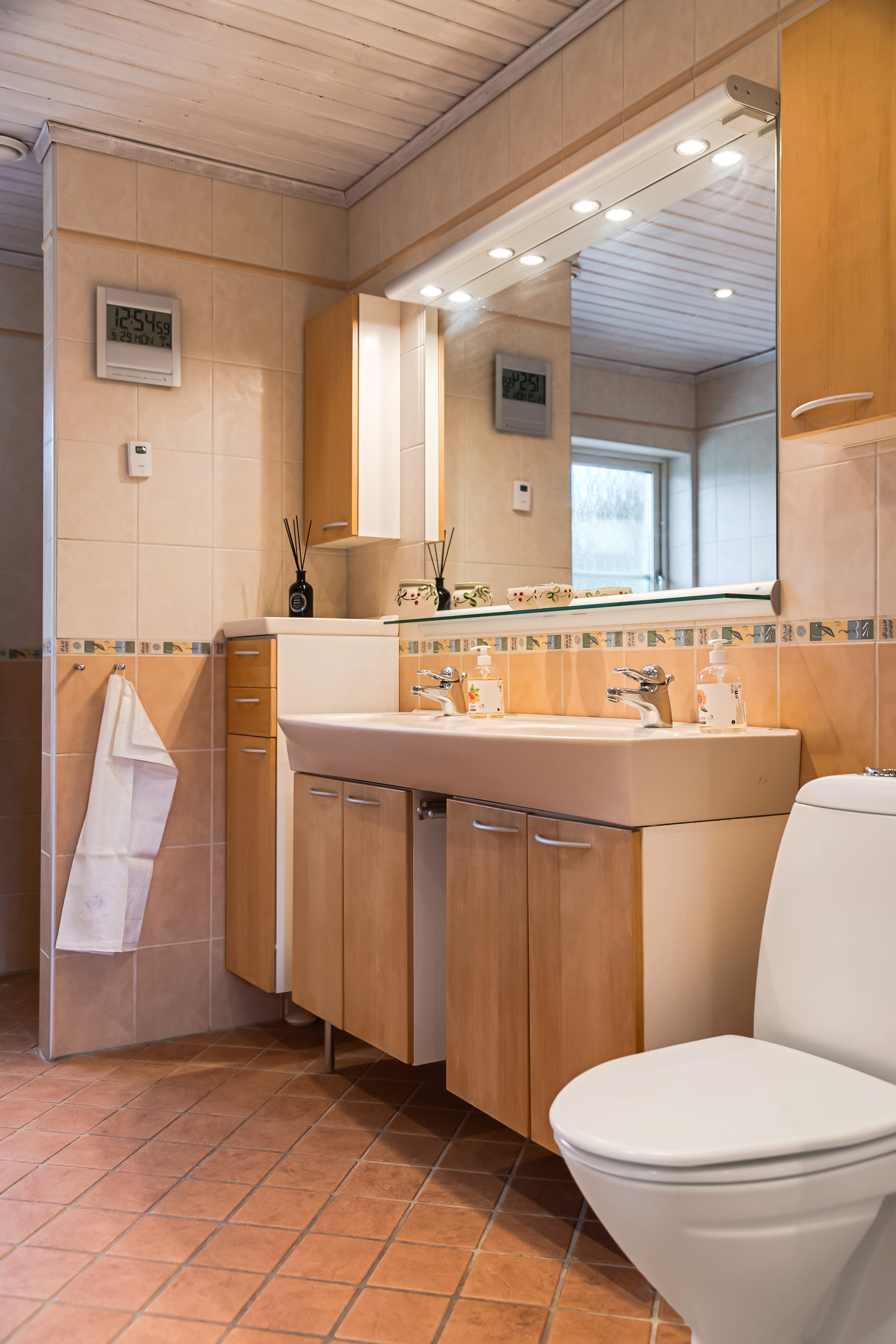 Klinkergolv med golvvärme och kaklade väggar. WC, dusch, badkar, dubbelhandfat med kommod, skåp för förvaring, stor spegel med spotlights samt handdukstork med värme.