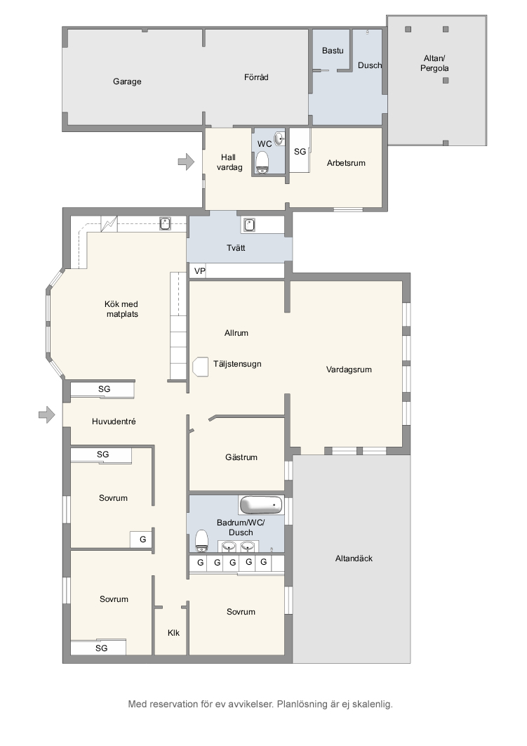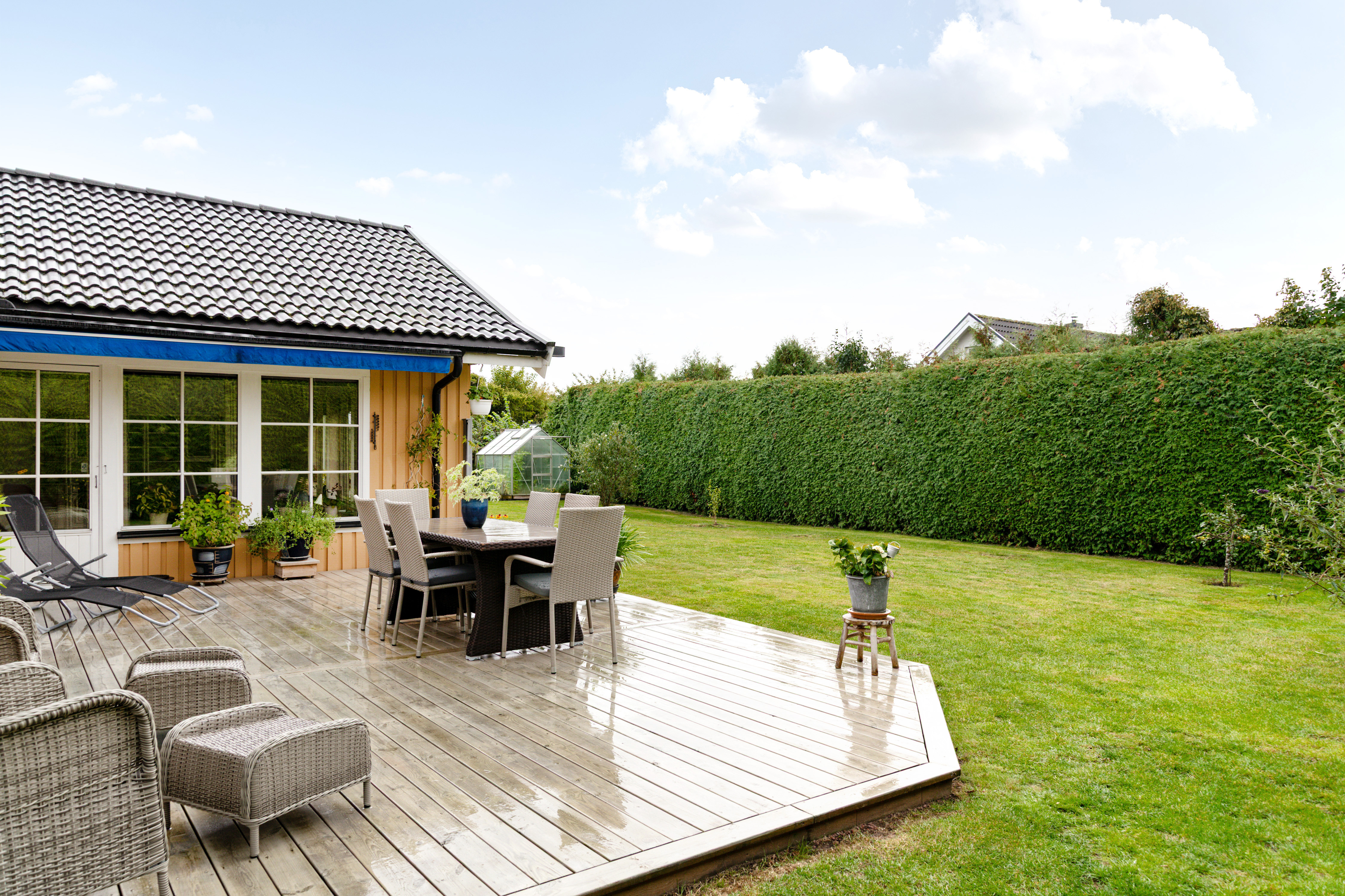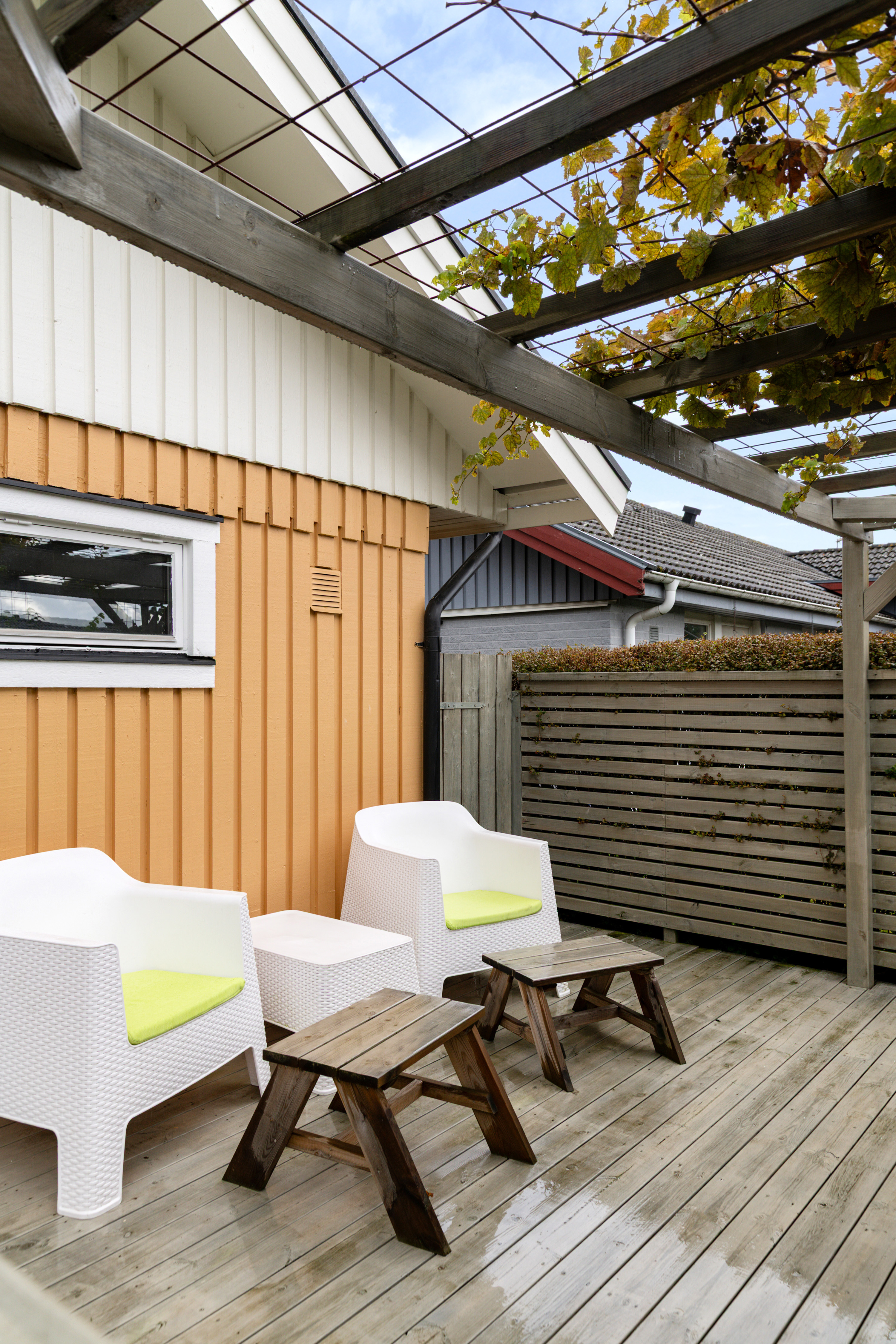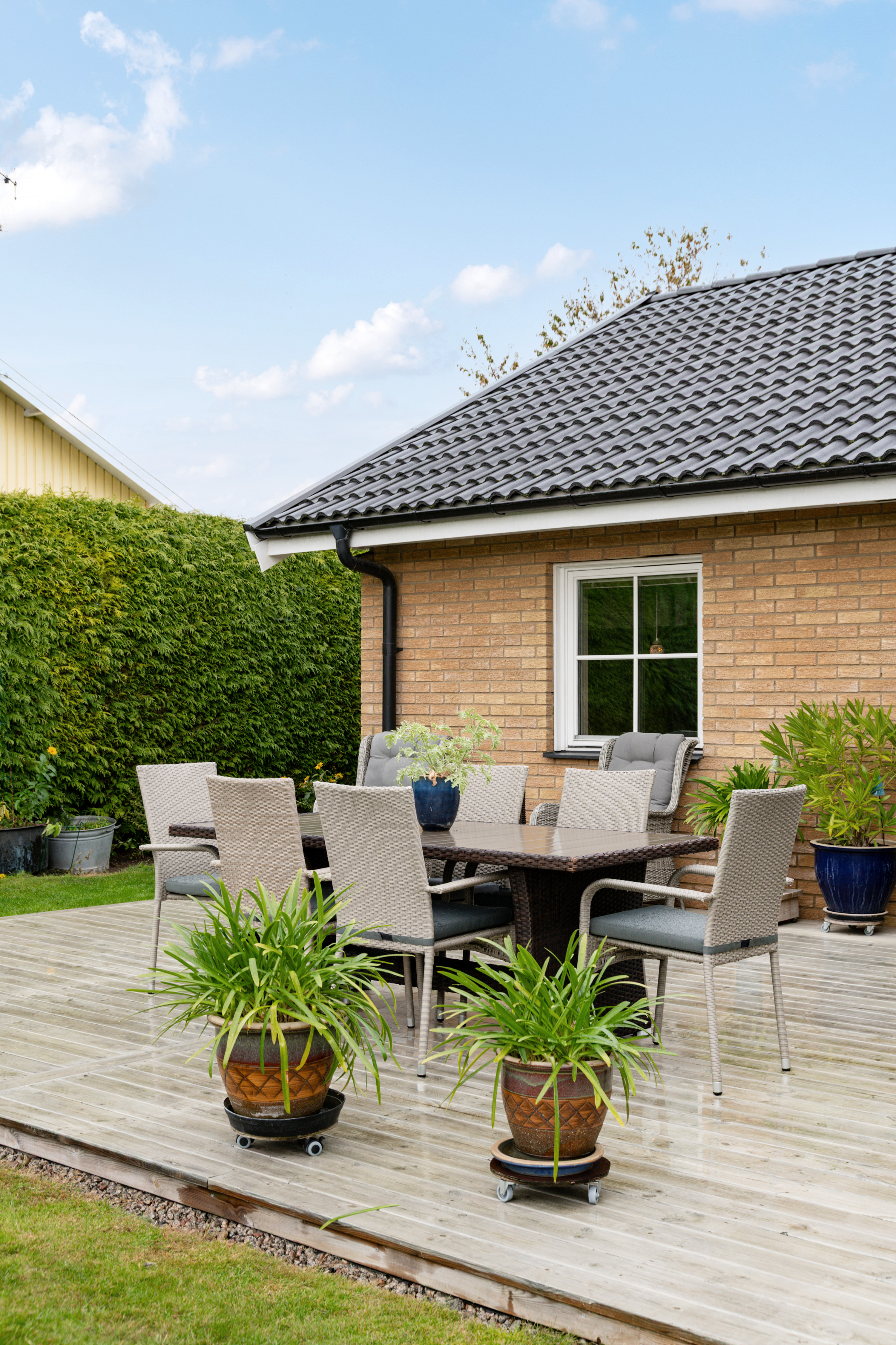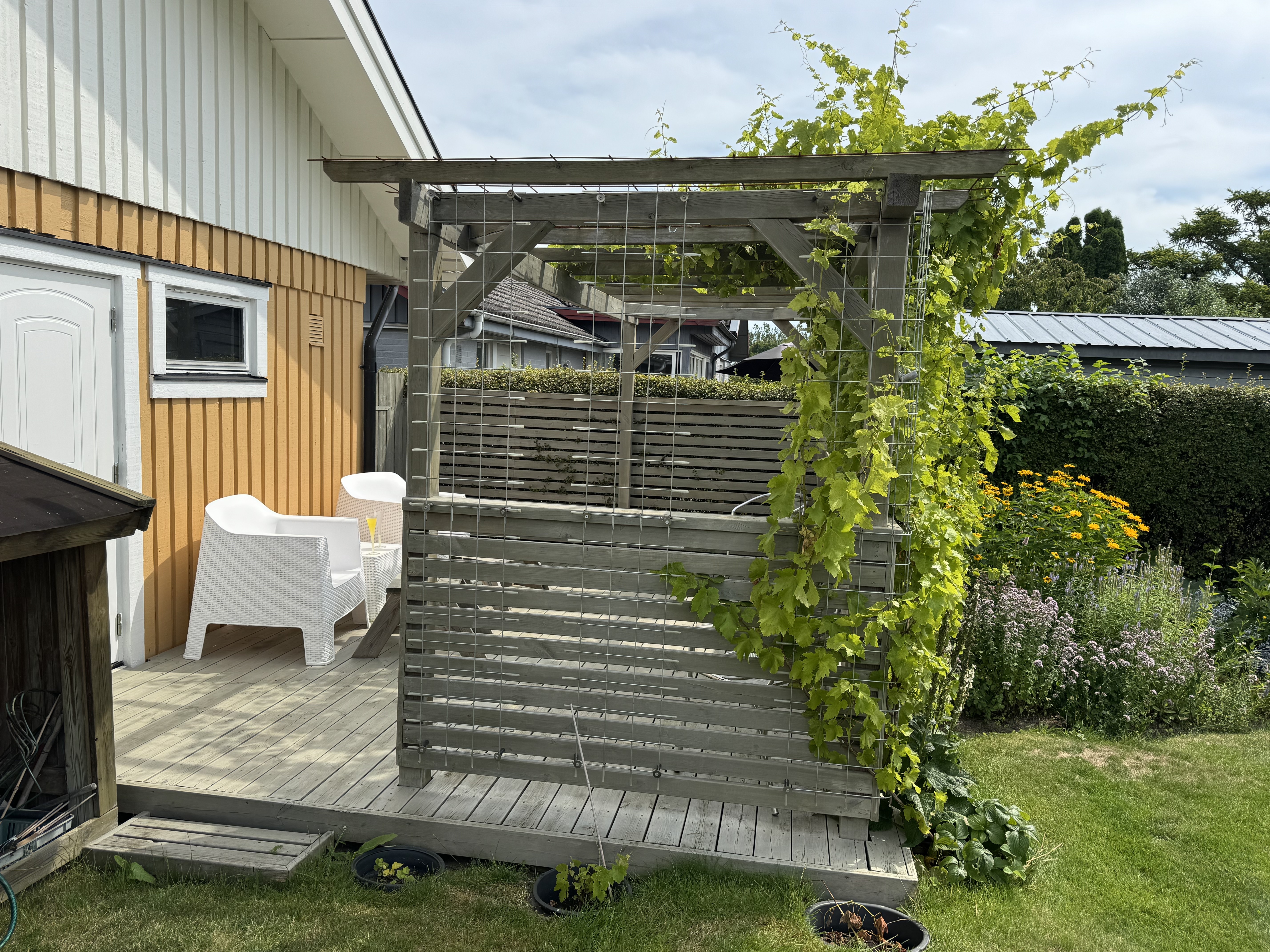 Stort trädäck i söderläge och därtill Pergola i sydöstläge på husets baksida. Pergola i anslutning till dusch och bastu i garage/förråd.