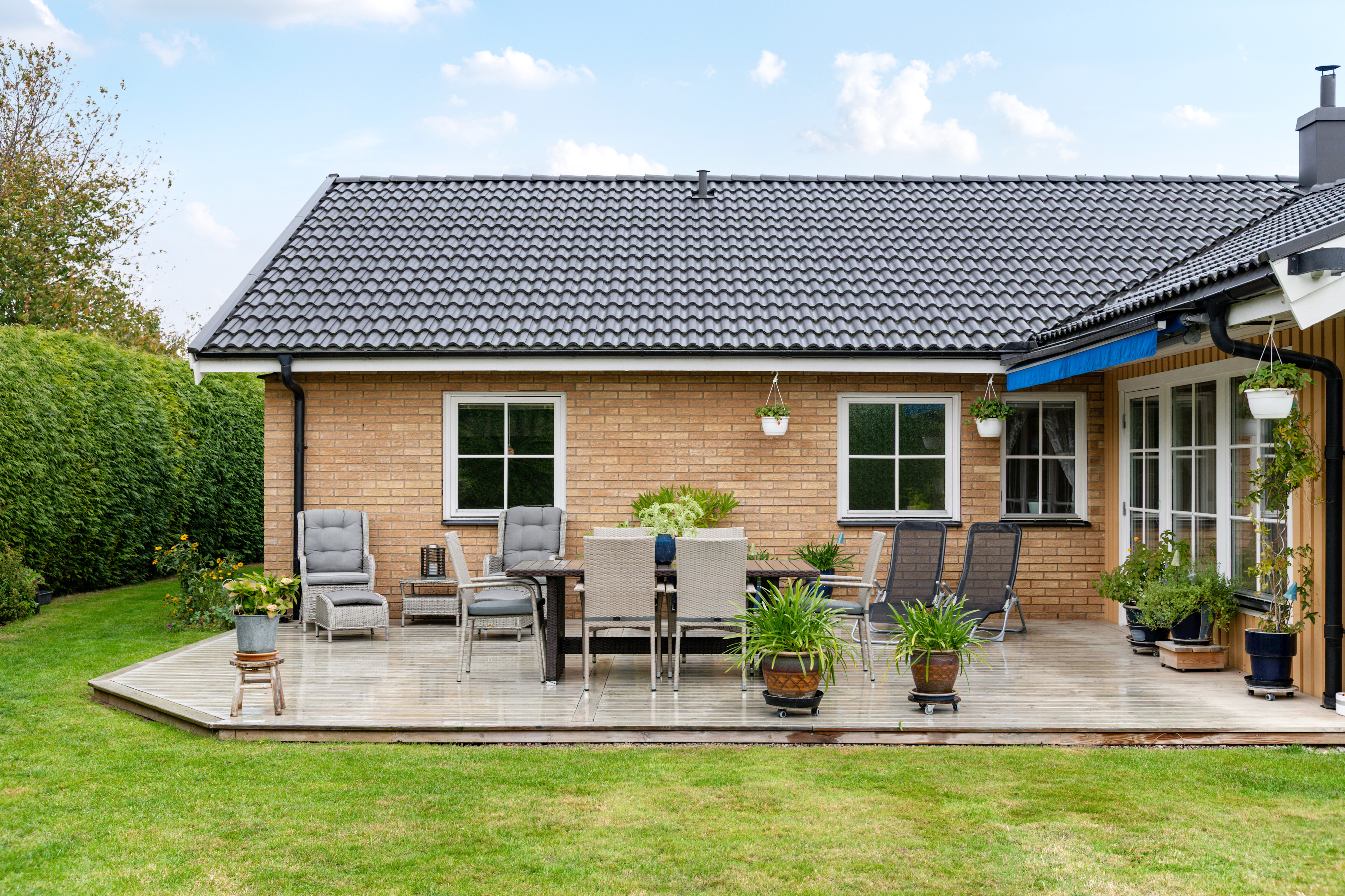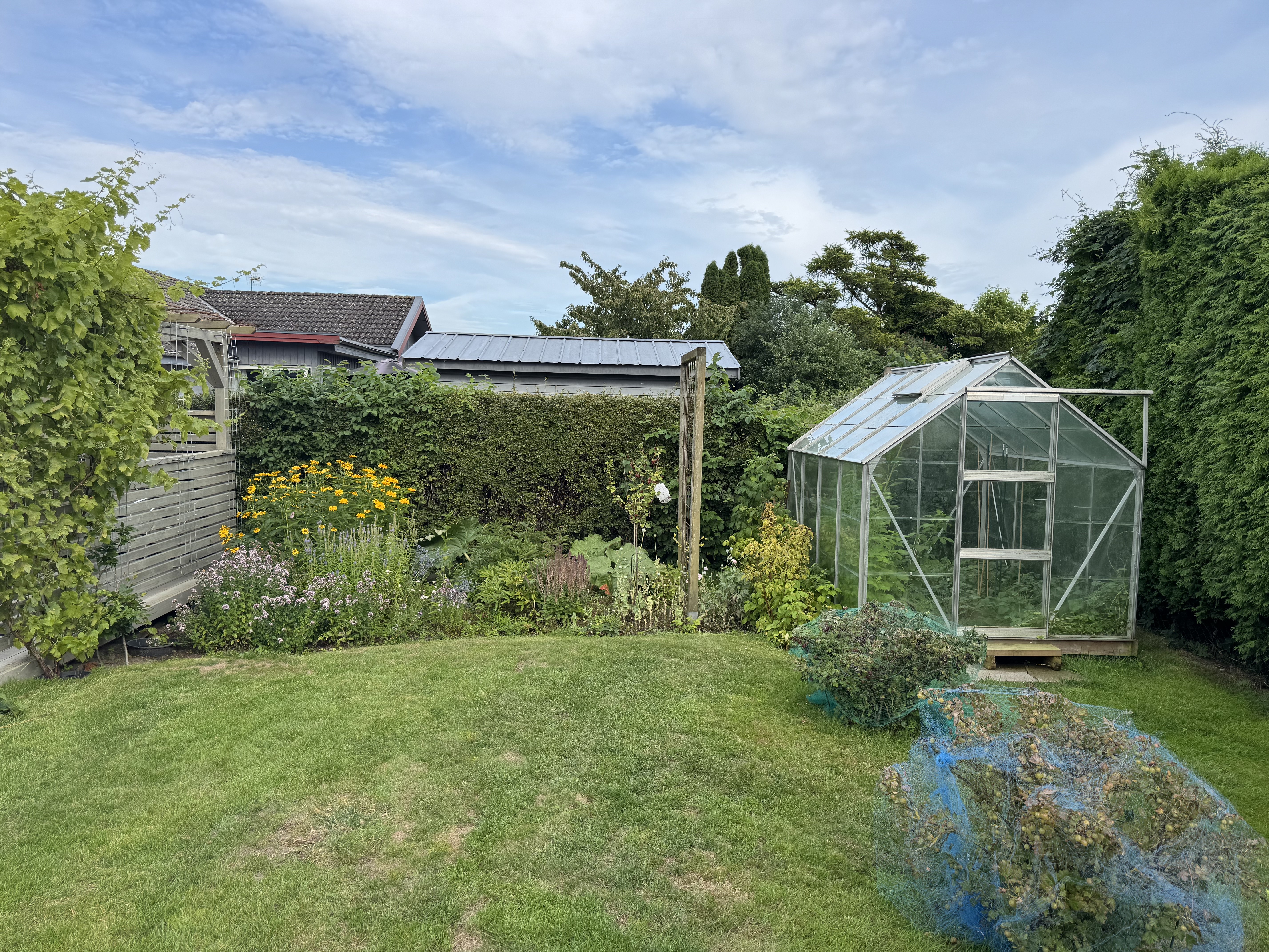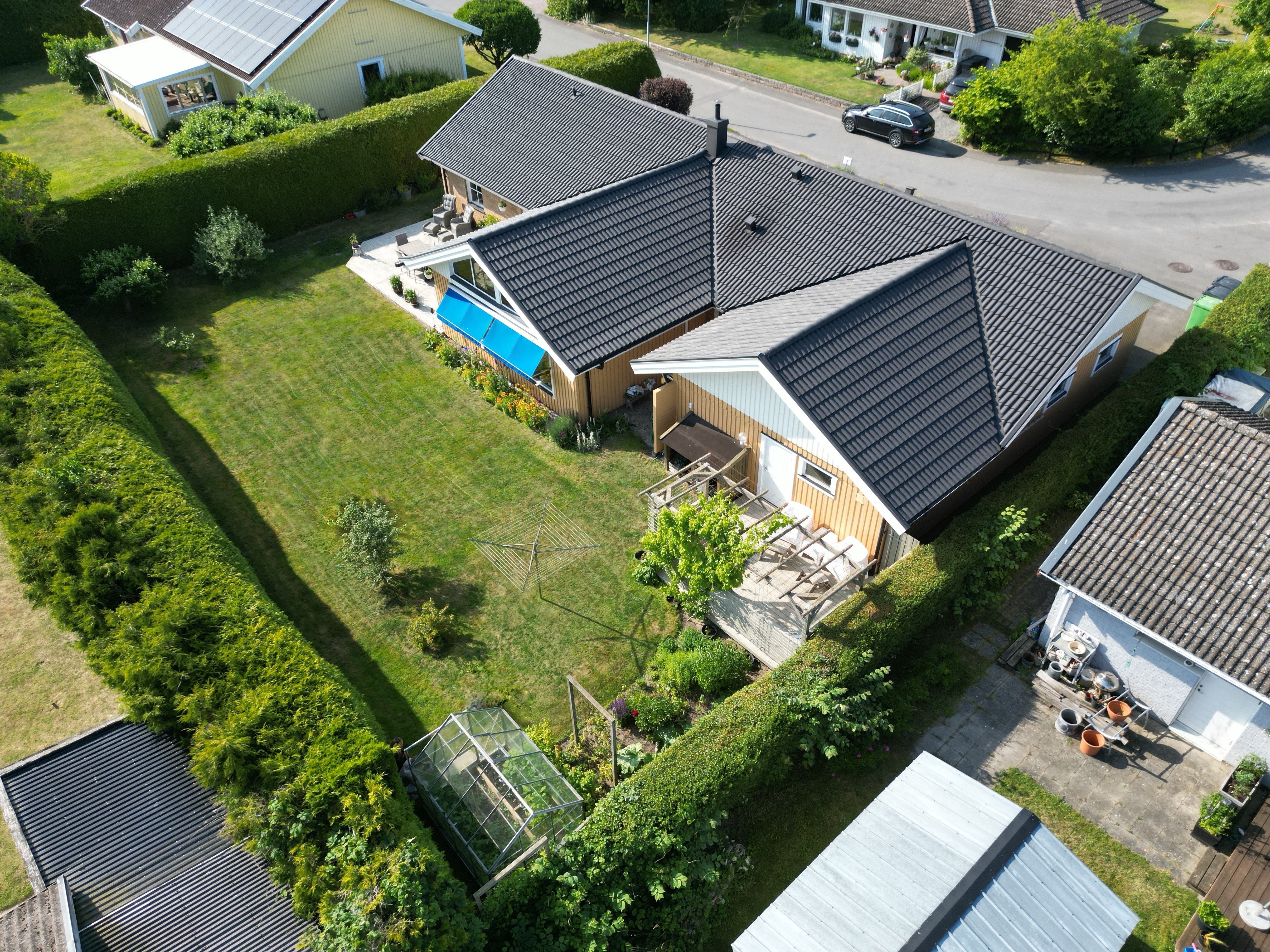 Exteriört så ligger huset fint i området och baksidan är insynsskyddad med skönt solläge och två fina trädäck. Det finns även ett litet växthus för hemma-odlaren.
