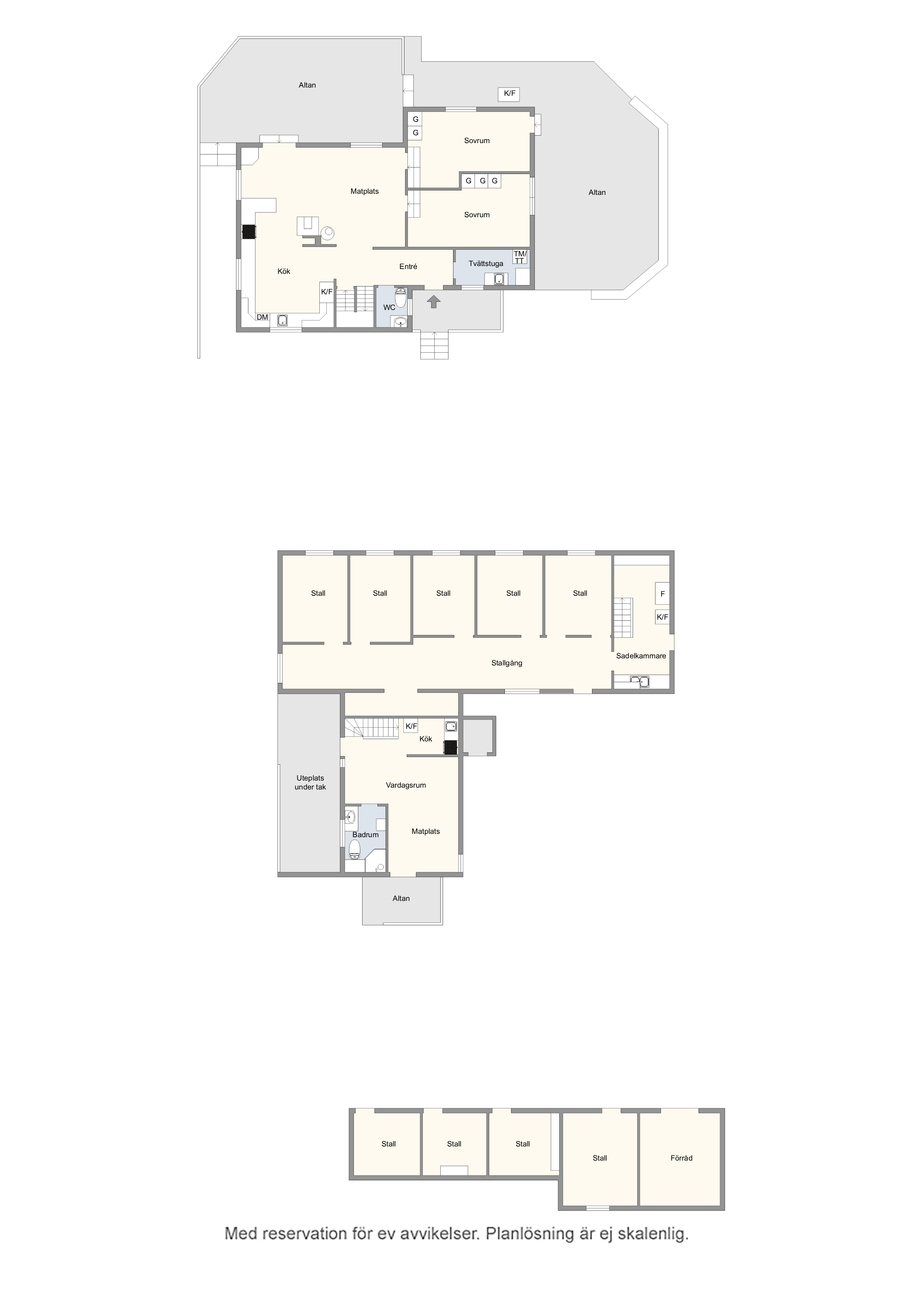 Ett stort och ett mindre stall, totalt 9 boxar, det stora stallet med 5 boxar, sadelkammare samt varmt & kallt vatten. Det andra utestallet med 4 boxar och mindre maskinhall.