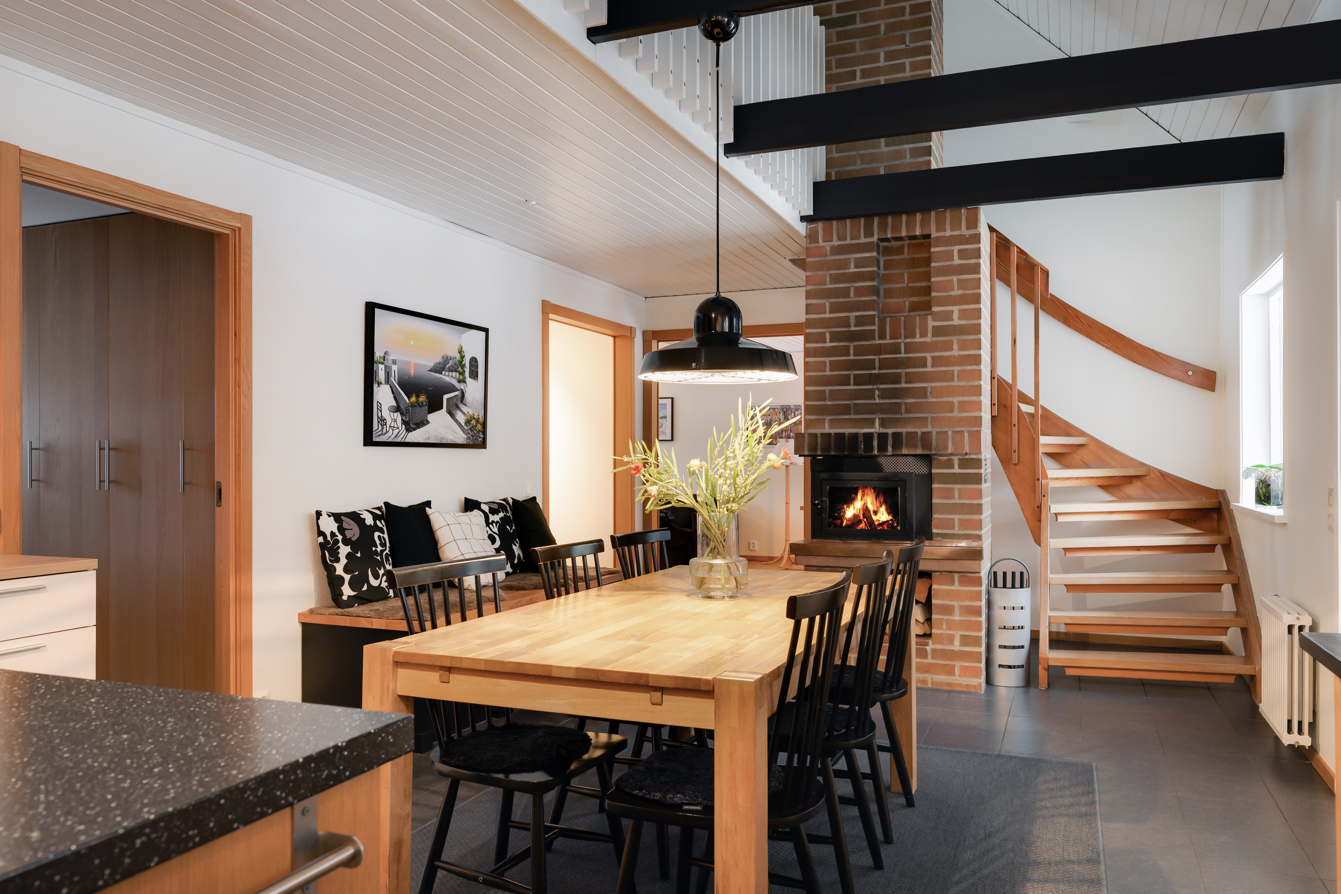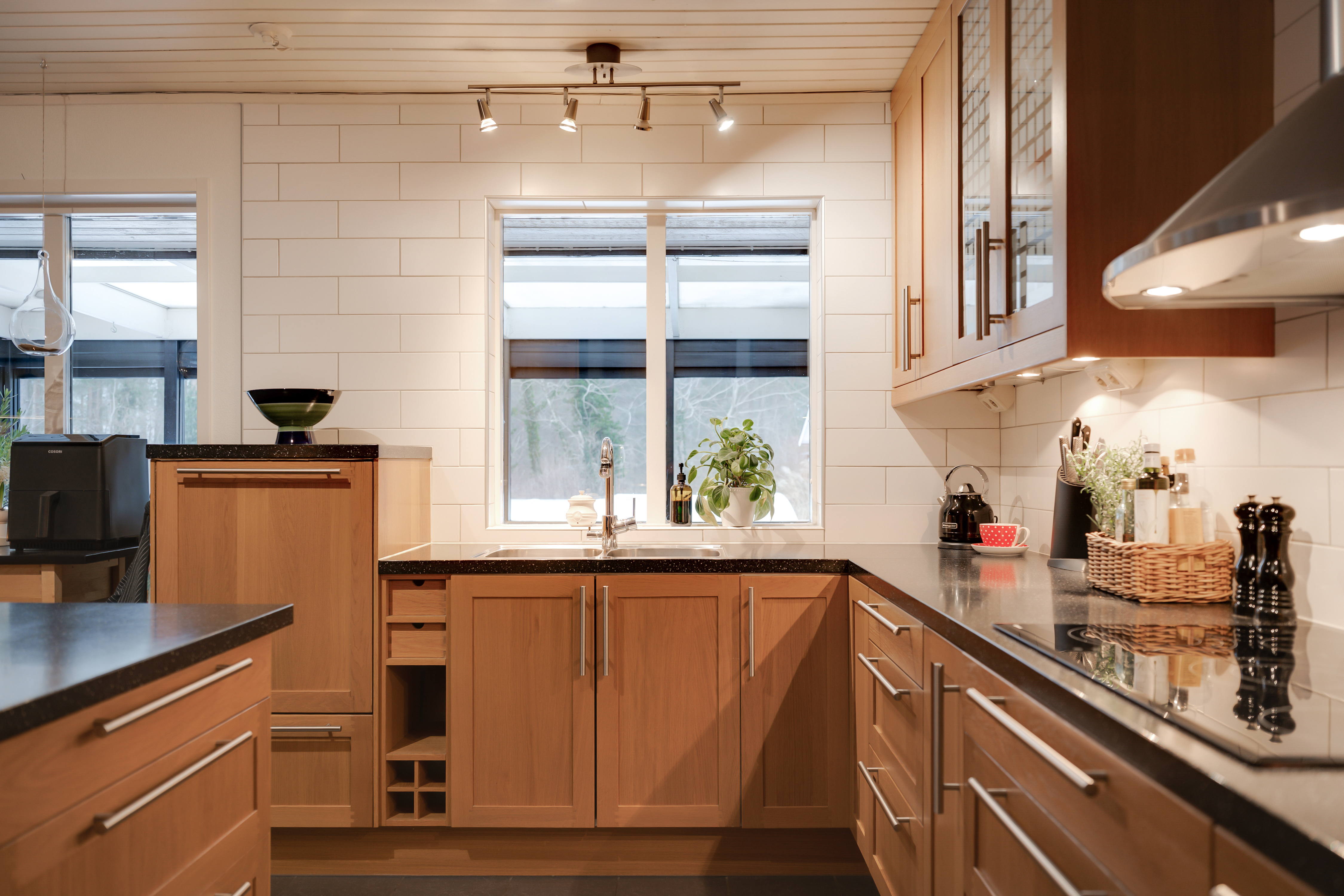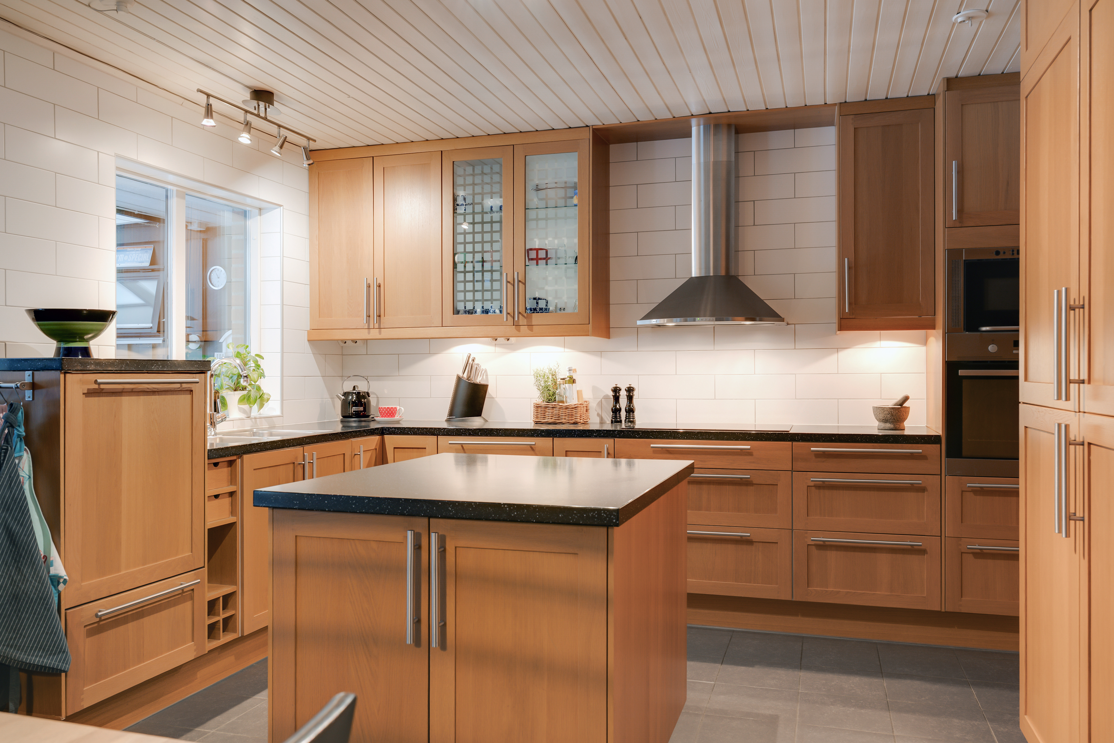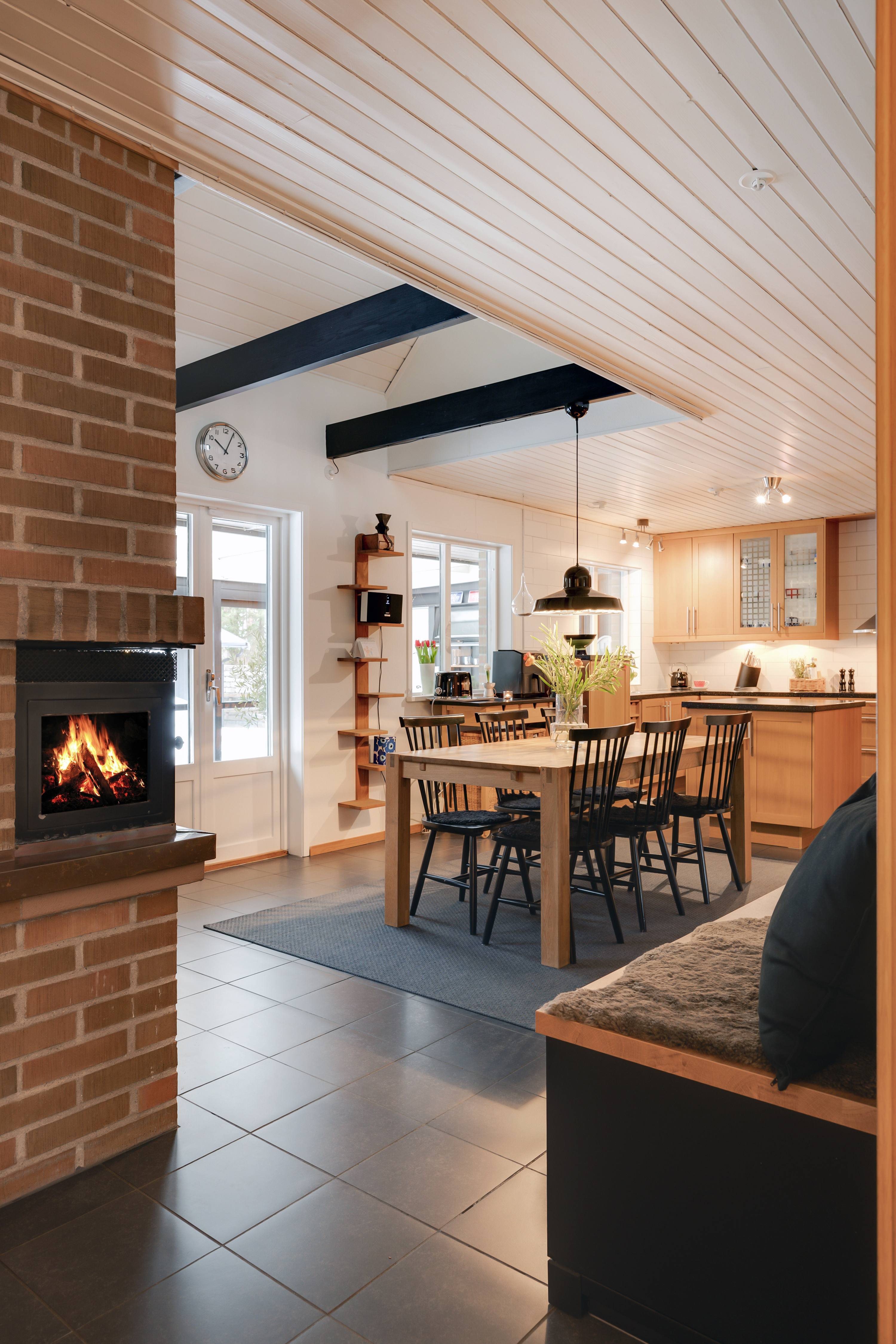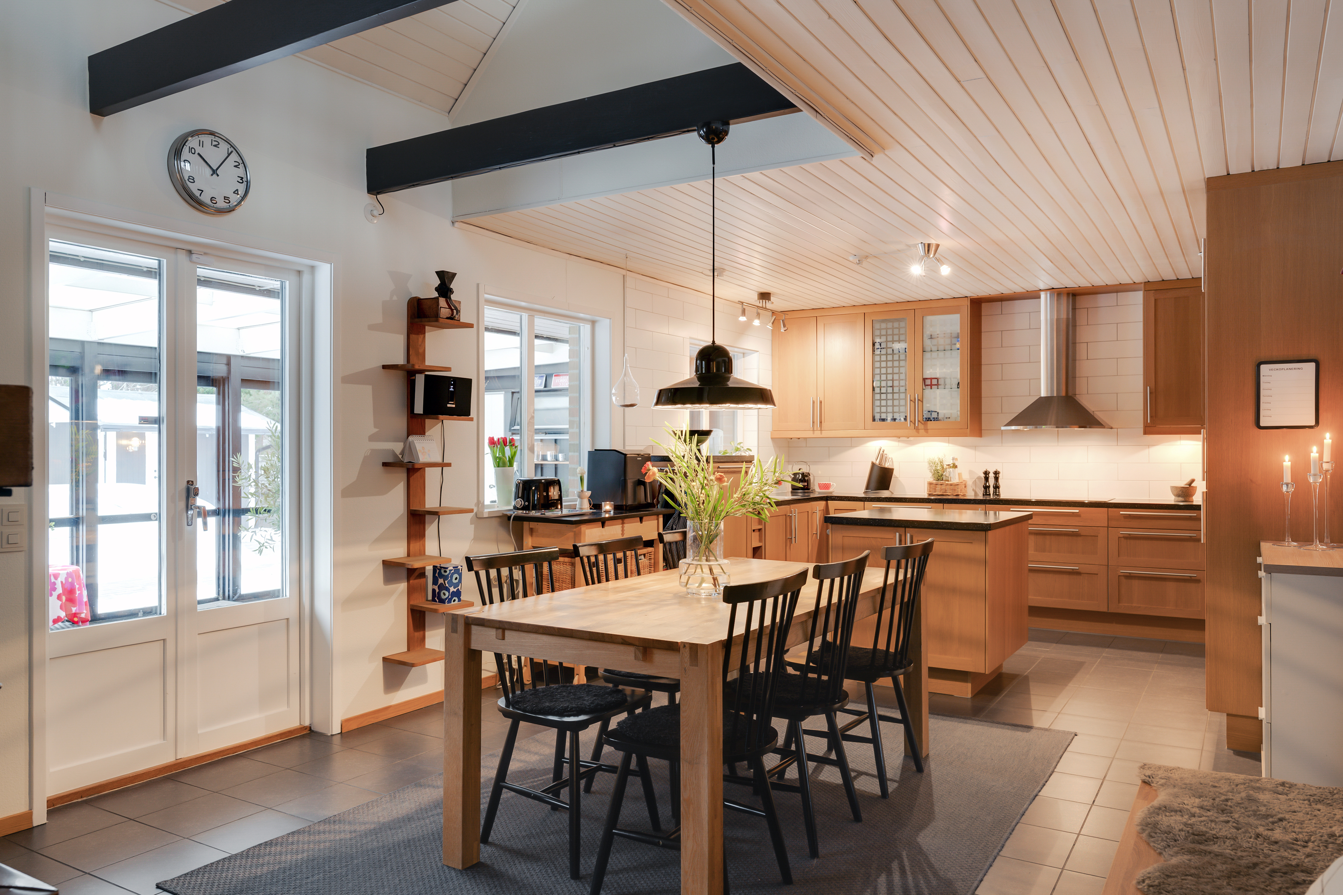 - Klinkergolv och ljus vägg. - Delvis öppet upp i nock. - Köksinredning från Ikea med luckor i ek och mörk stenbänkskiva. - Diskho, spishäll, rostfri köksfläkt, inbyggd ugn, inbyggd micro, integrerad diskmaskin, integrerad kyl och frys.
