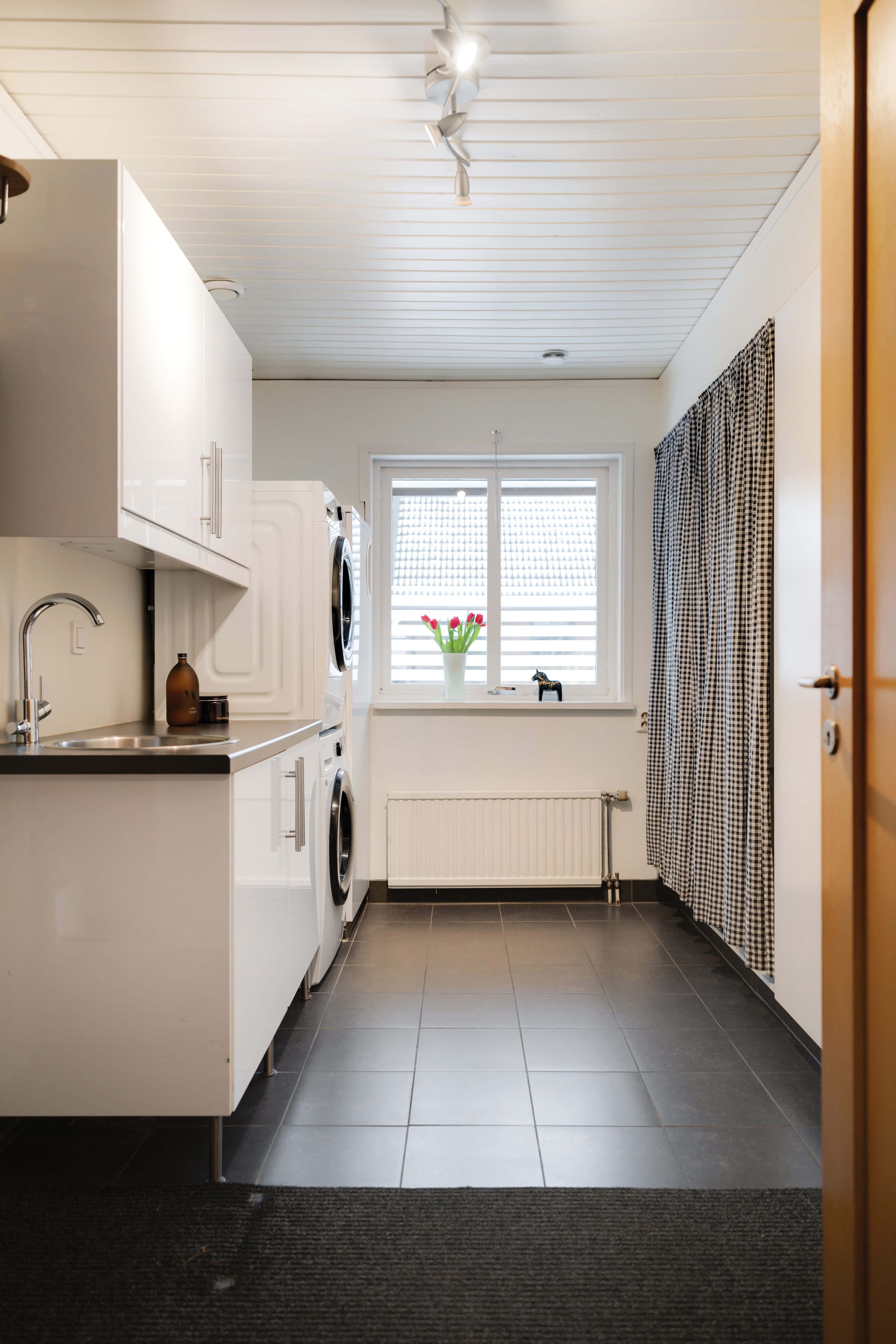 - Klinkergolv och ljus vägg. - Inredning med vita luckor. - Tvättmaskin, torktumlare och vask. - Förvaring.