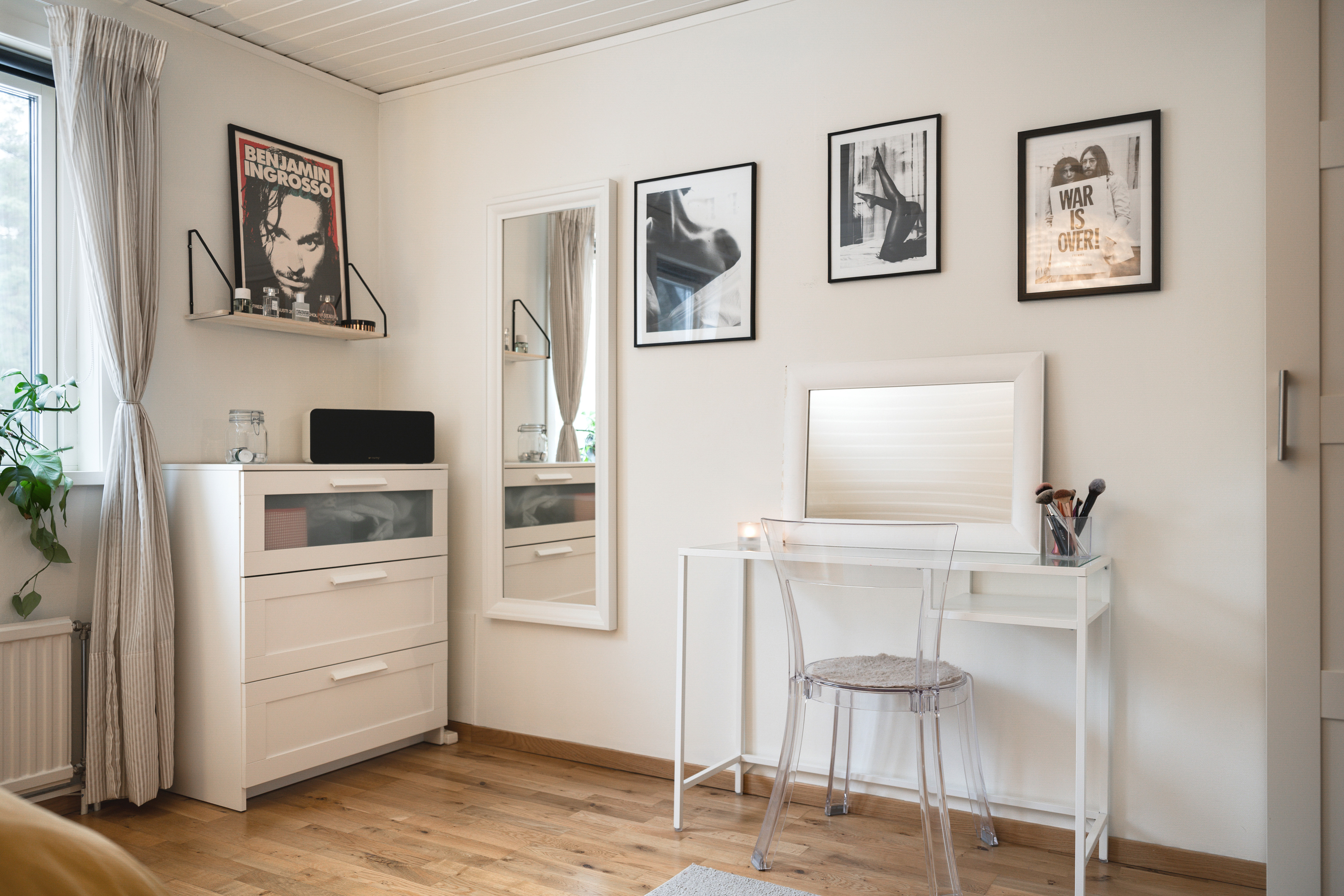 - Parkettgolv och ljus vägg. - Garderober.