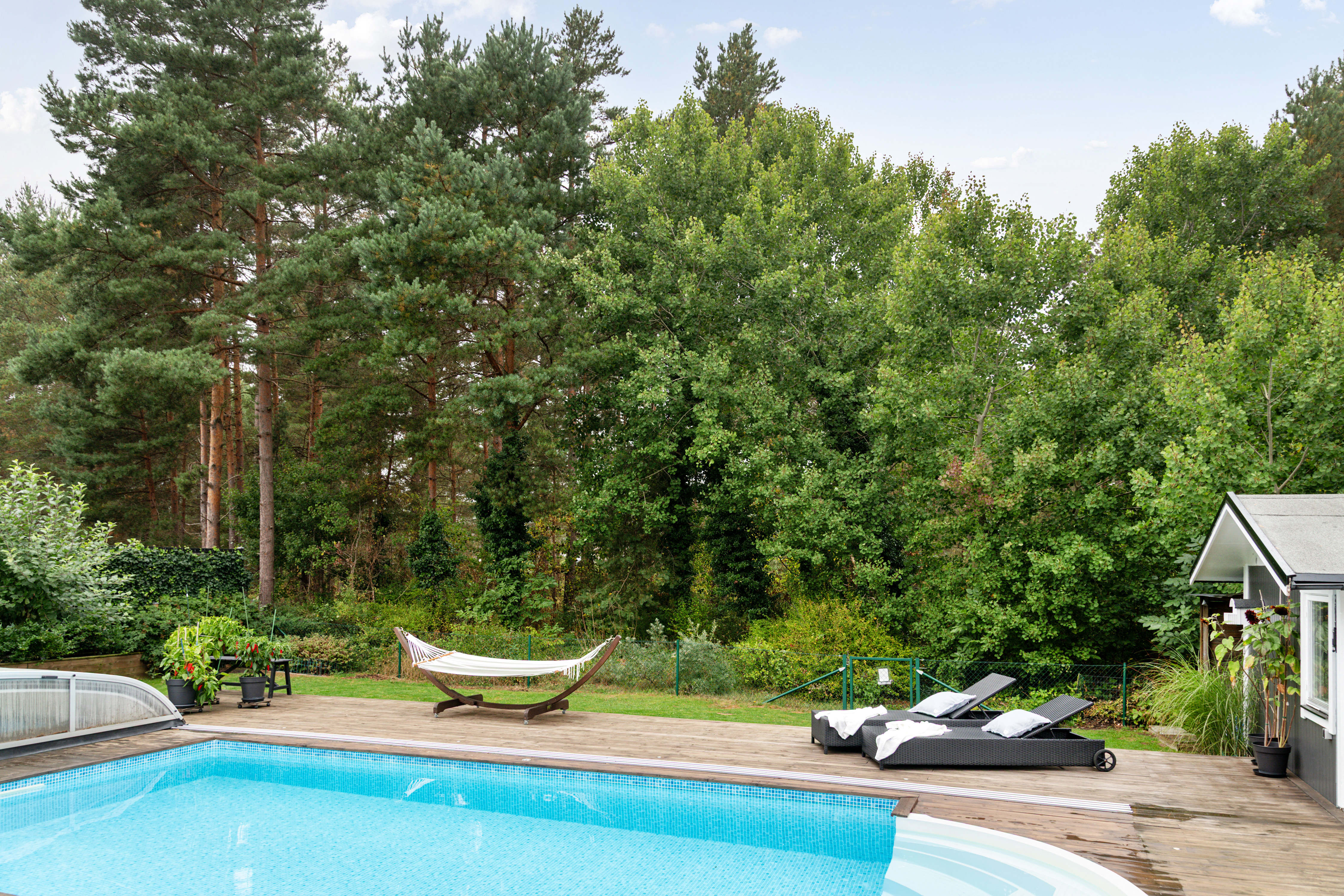 Trädgårdstomt med uterum, trädäck och pool på baksidan. Växthus med odlingslådor. Skönt läge med baksida mot litet grönområde. Bevattningspump till trädgårdsbevattning. Sprinklersystem i gräsmattan. (Poolen har ett litet, litet hål någonstans, troligtvis vid trappan. Det har varit där sedan poolen köptes och ägarna har ej lyckats hitta var).