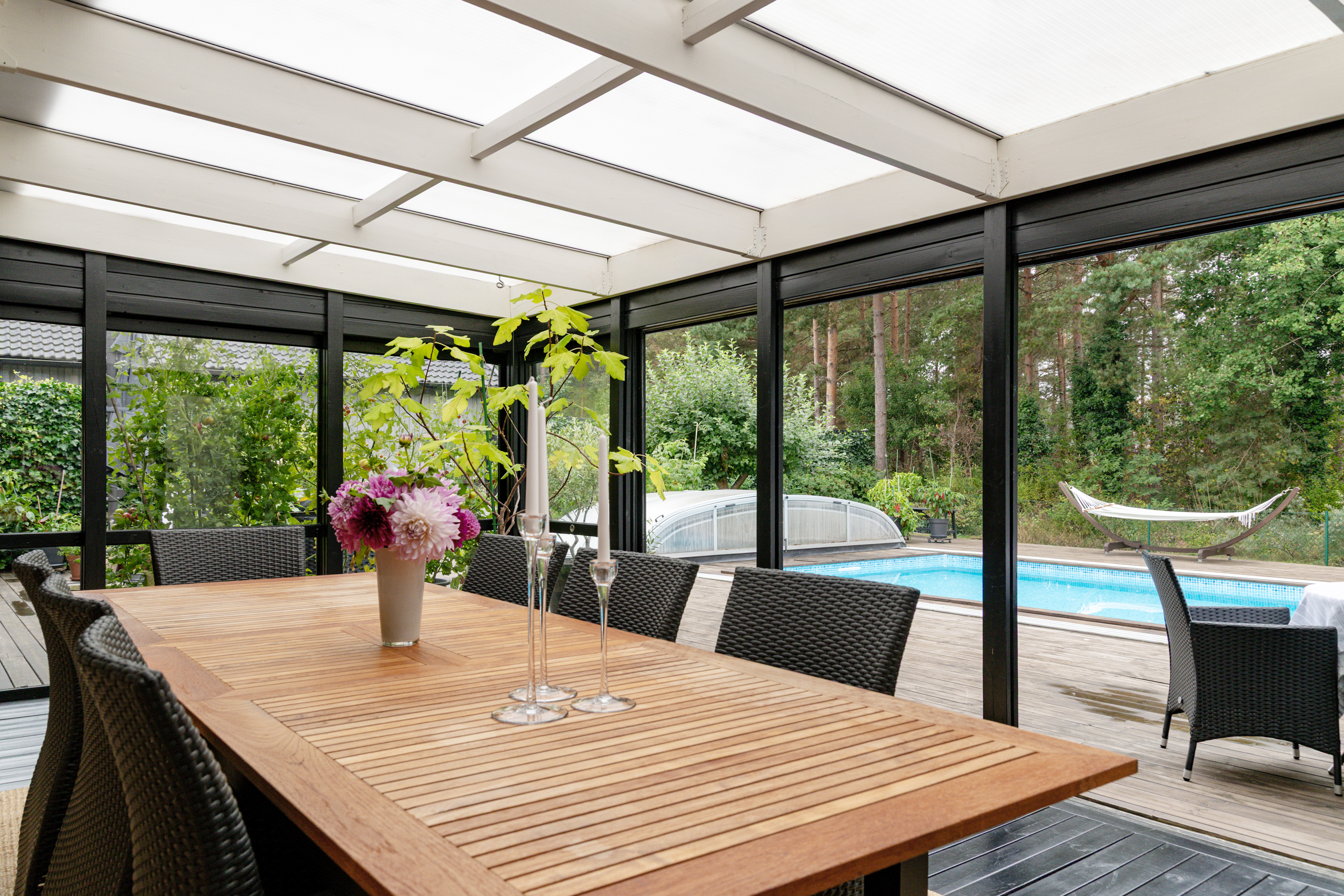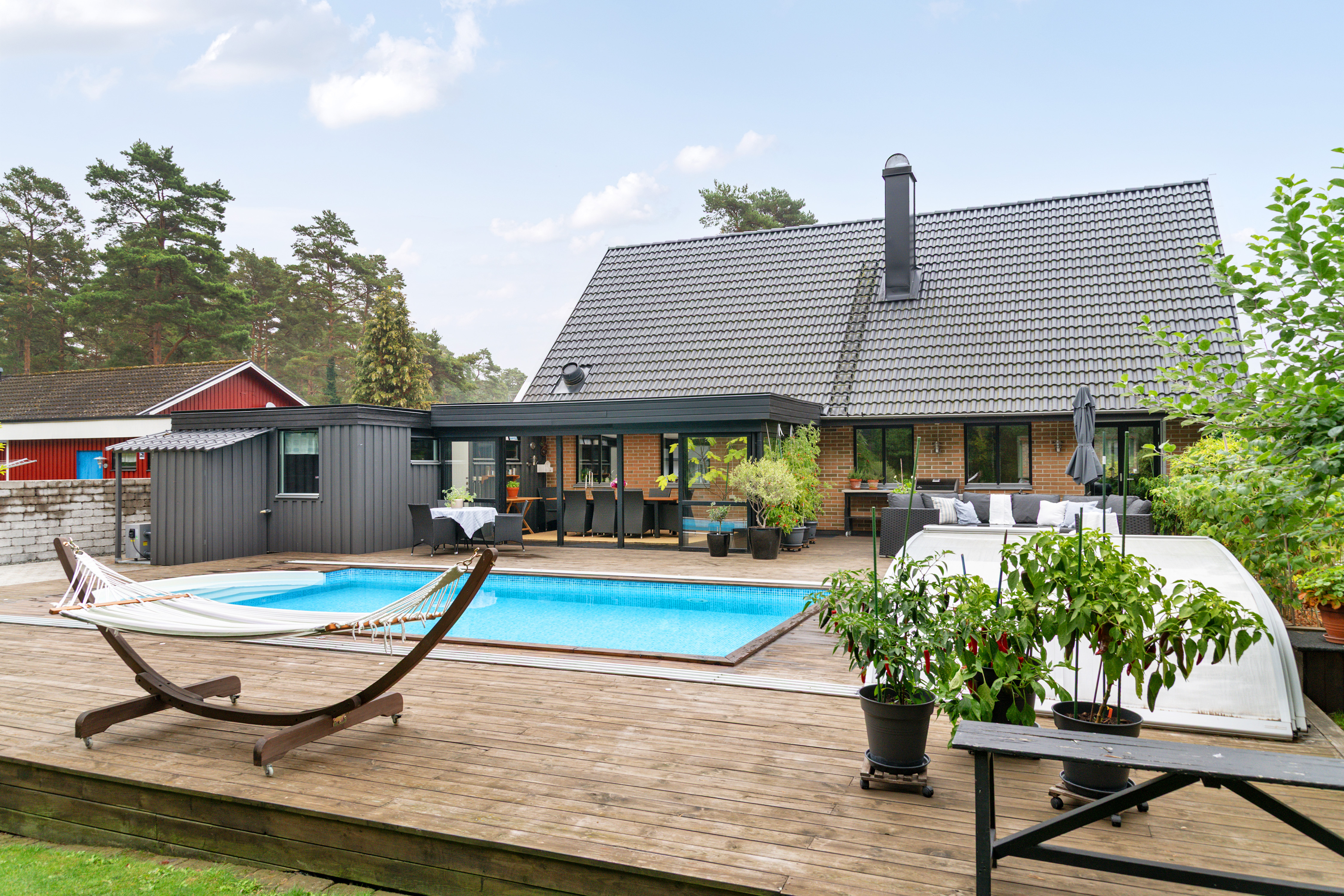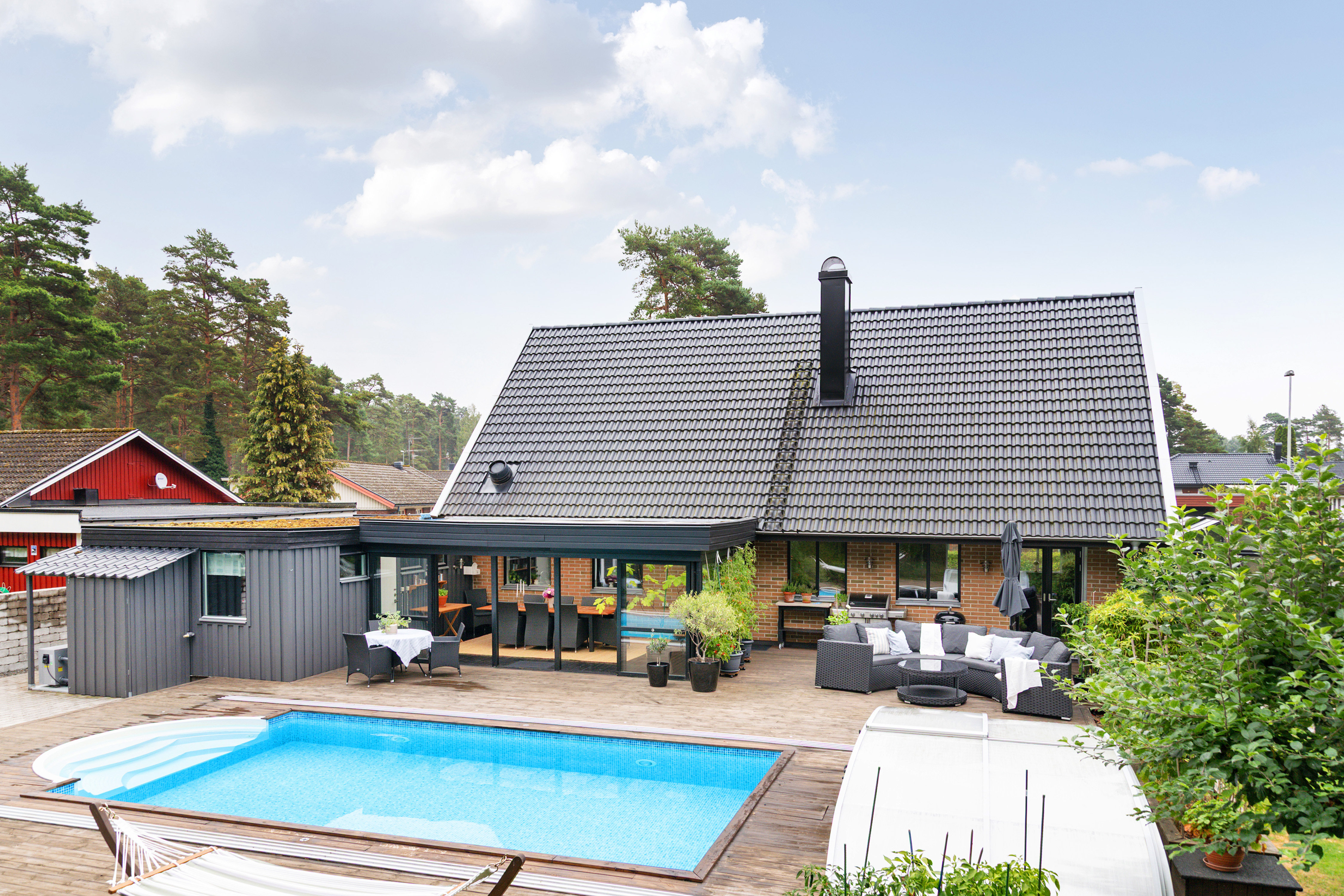 Skön baksida med uterum, uteplats och pool