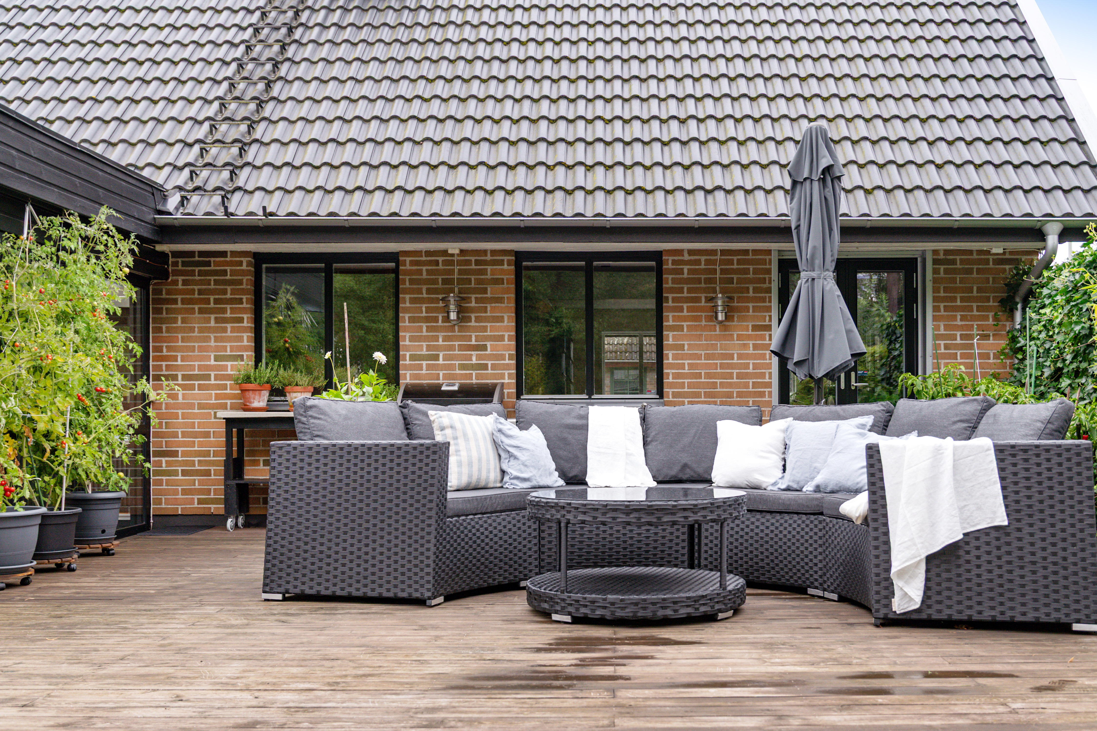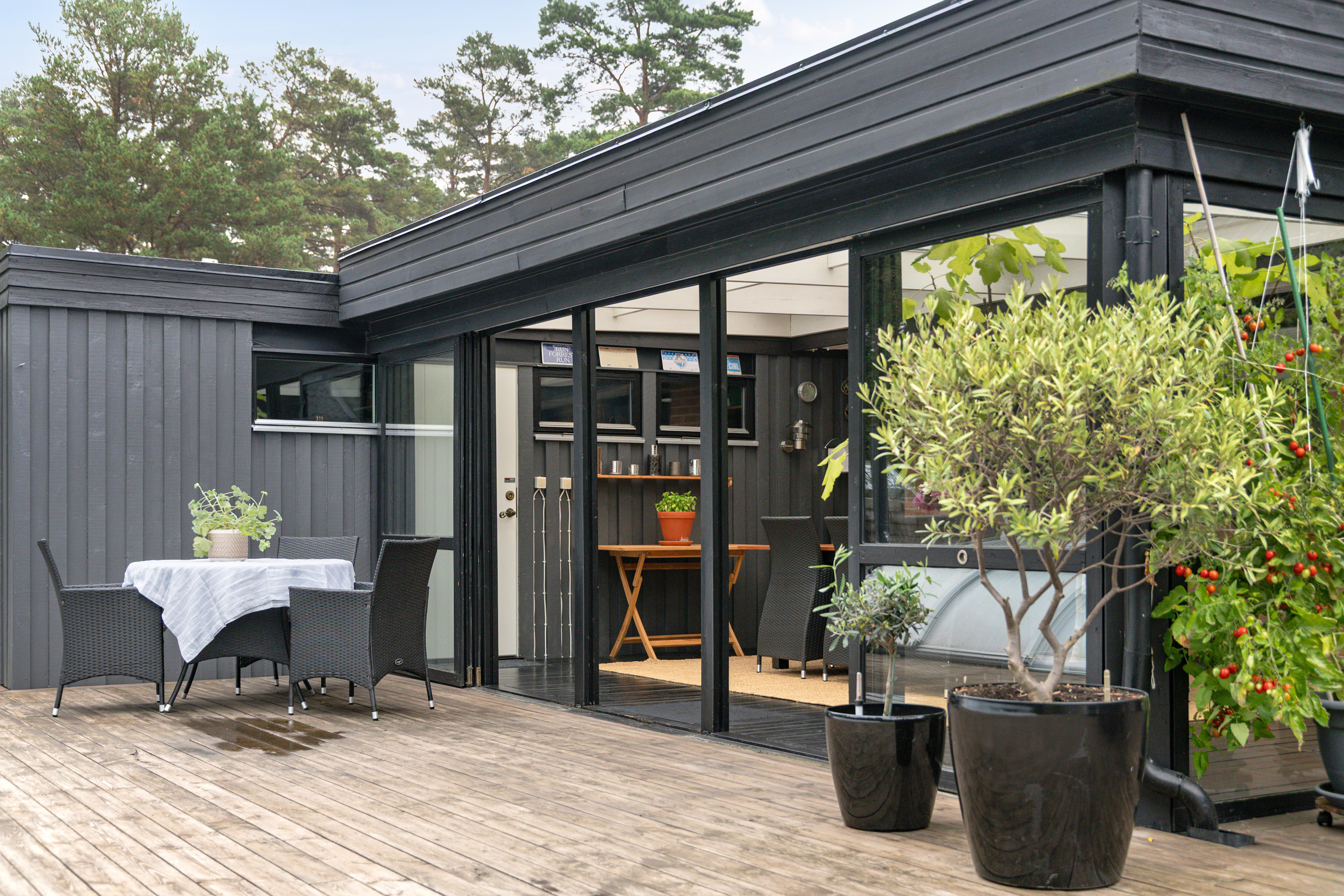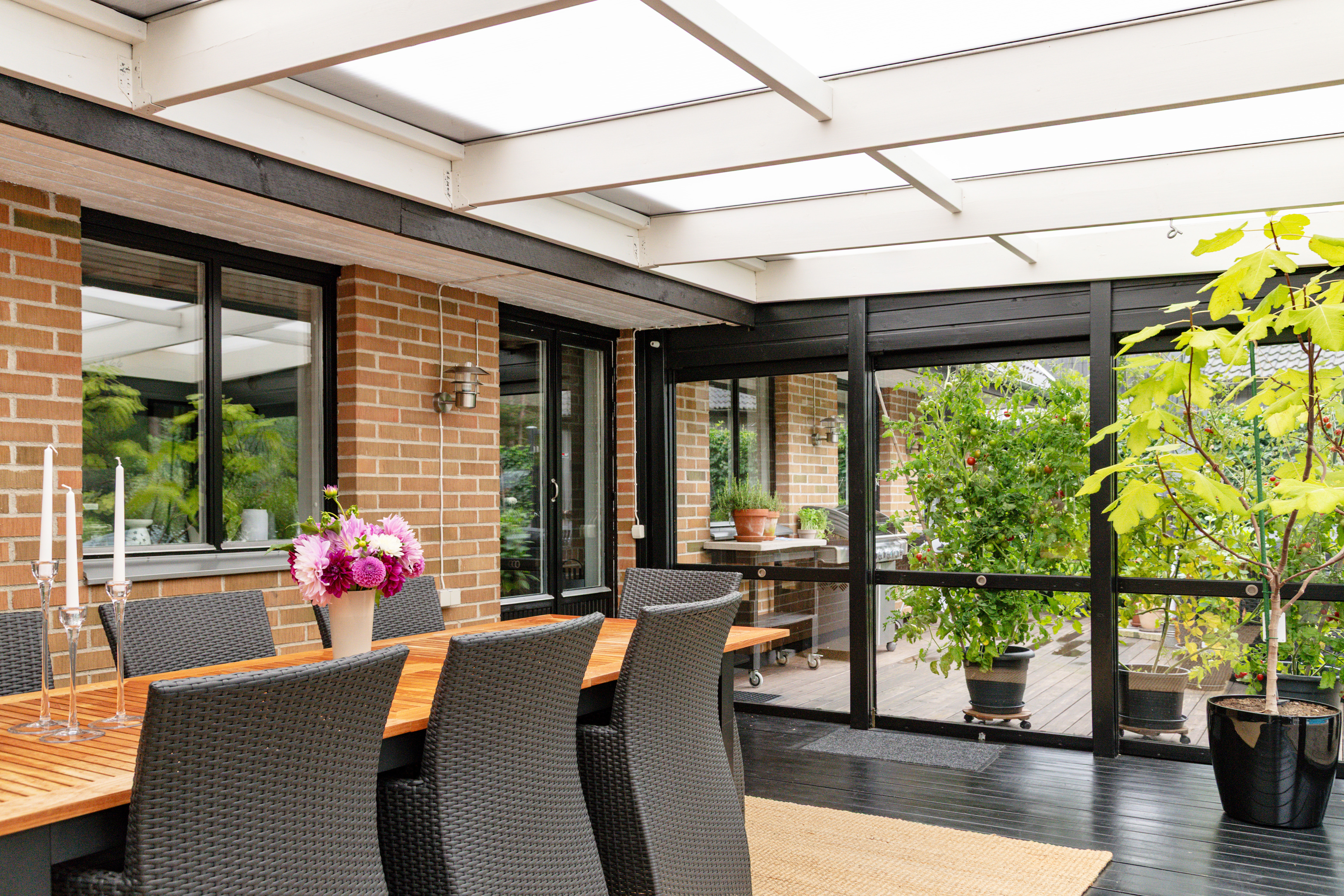 Skön baksida med uterum, uteplats och pool