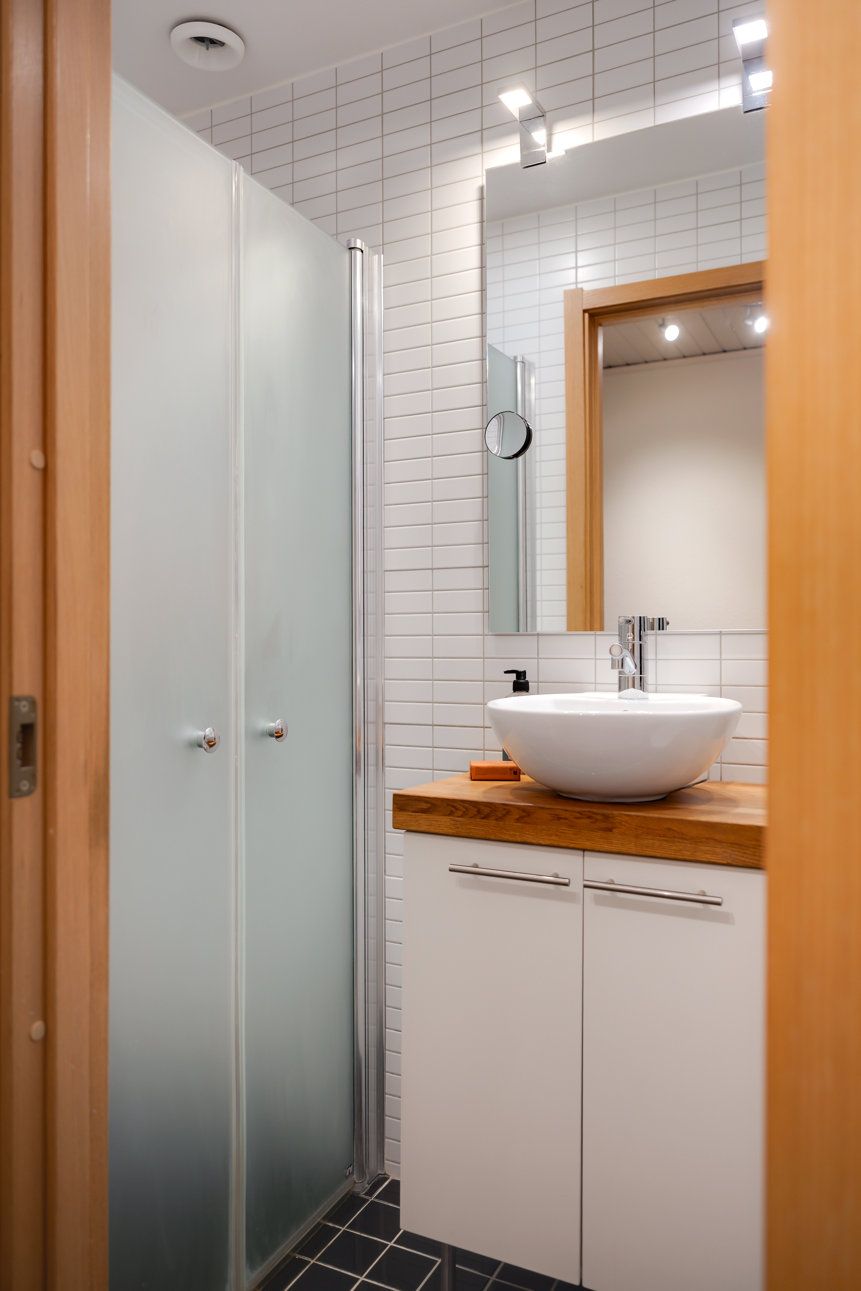 - Klinkergolv och kakel på väggarna. - Elgolvvärme. - WC-stol, handfat med skåp, dusch med glasdörrar, spegel med belysning samt handdukstork.