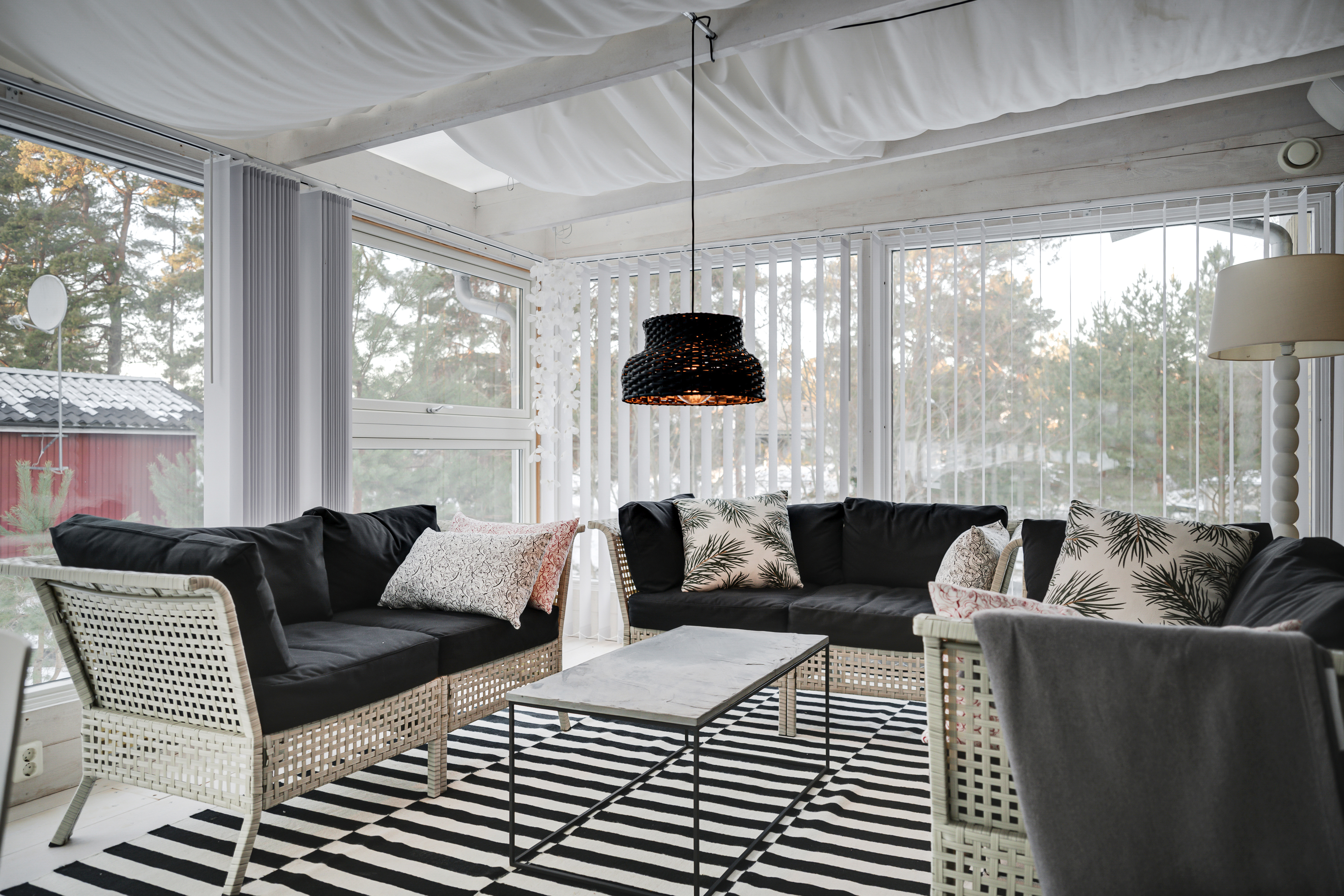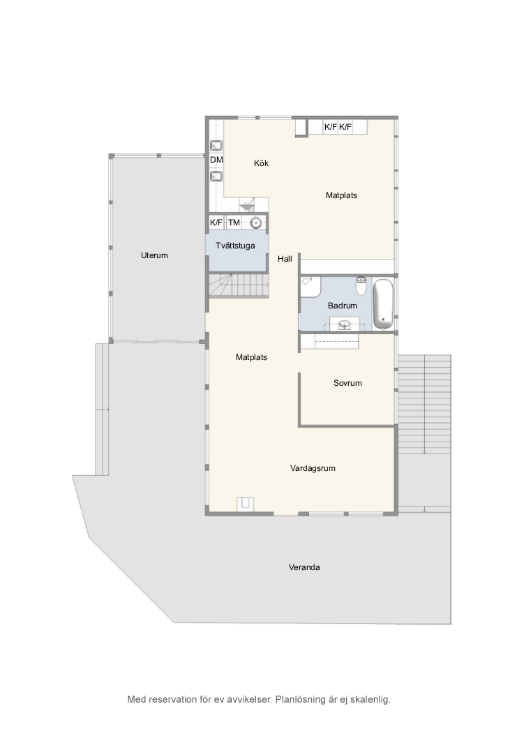 Stora trädäck på två sidor av huset som ansluter till uterummet. Uterummet c:a 25 kvm har trägolv och stora fönsterpartier varav ett öppningsbart och gavelsidan är skjutbar mot trädäcket utanför. Utanför uterum och trädäck på långsidan finns det ett utekök med vattenanslutning till det kommunala vattnet. In & utgång via matrummet.