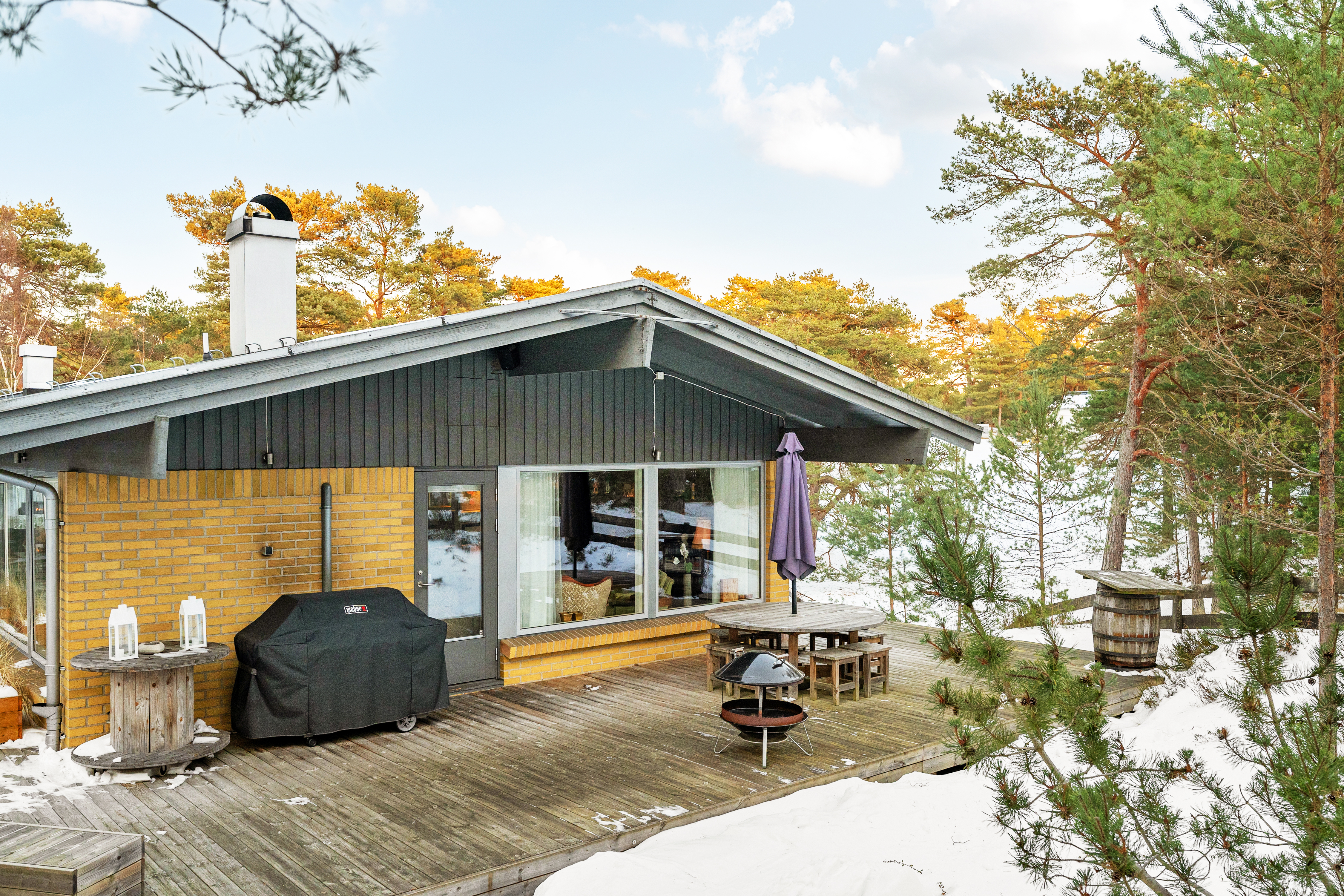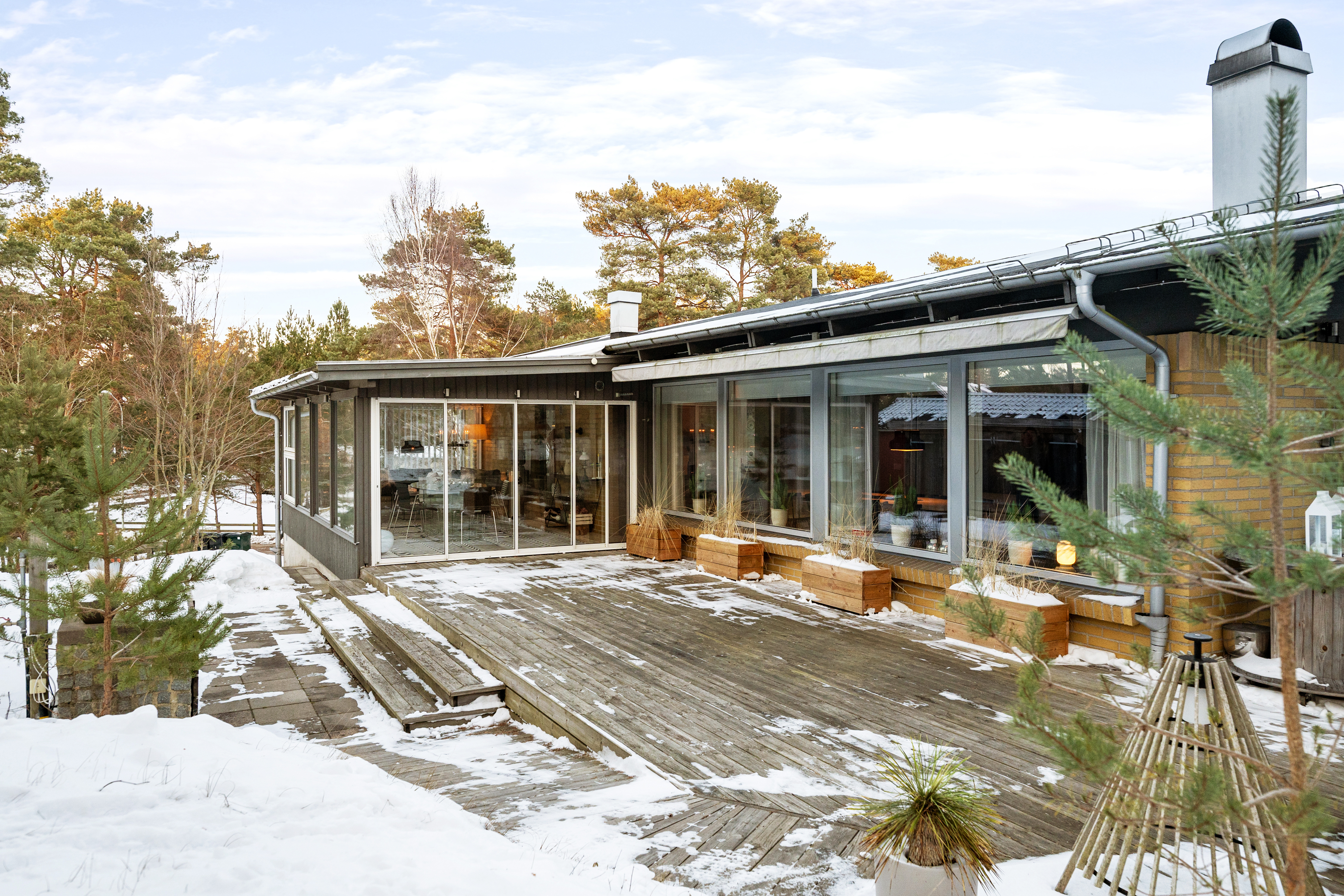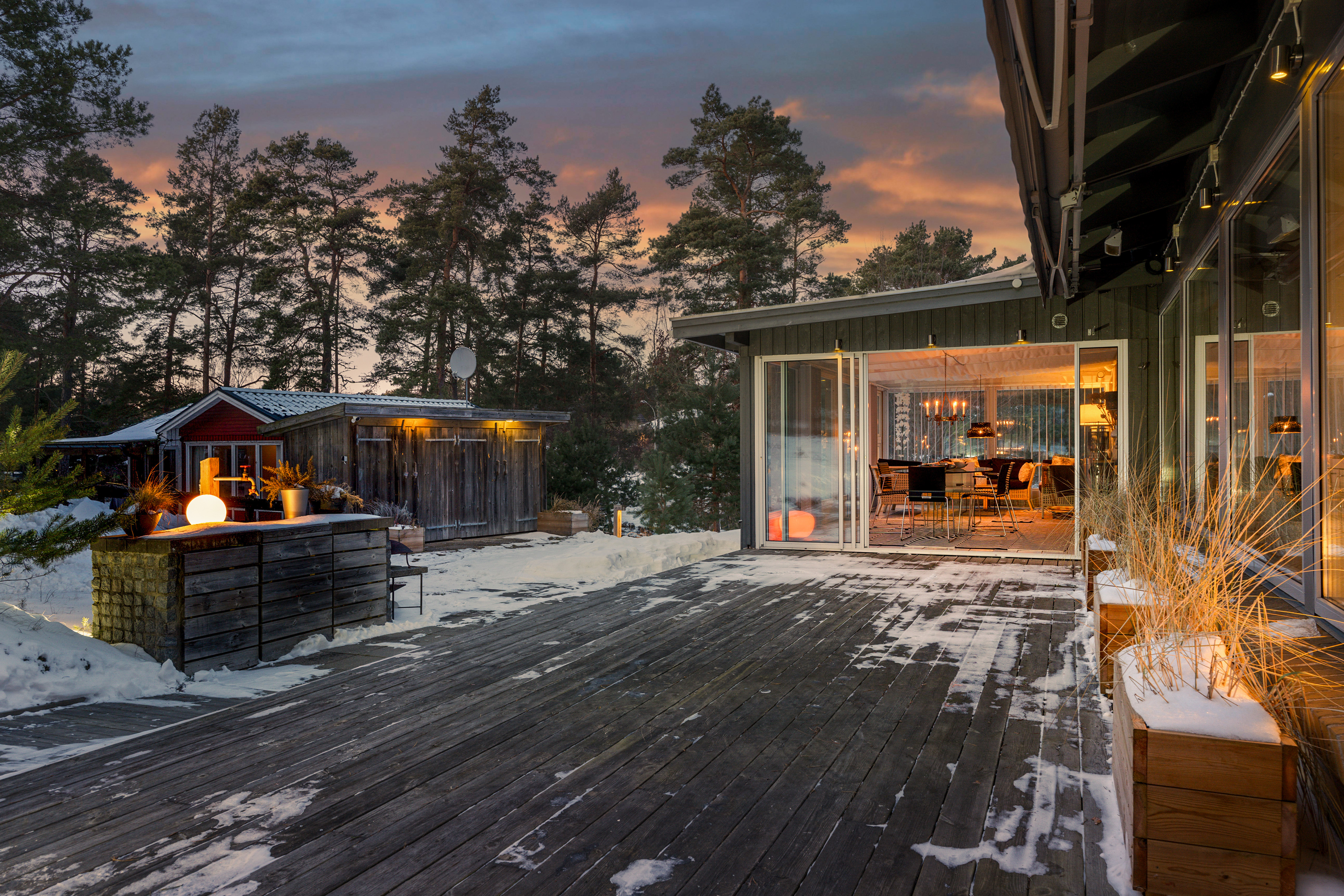 Det har byggts till ett fint uterum i anslutning till stora trädäck med både markis och stort takutsprång samt enklare utekök. Under uterummet finns en smart förrådskällare som kan användas till hobbyverkstad och förvaring.
