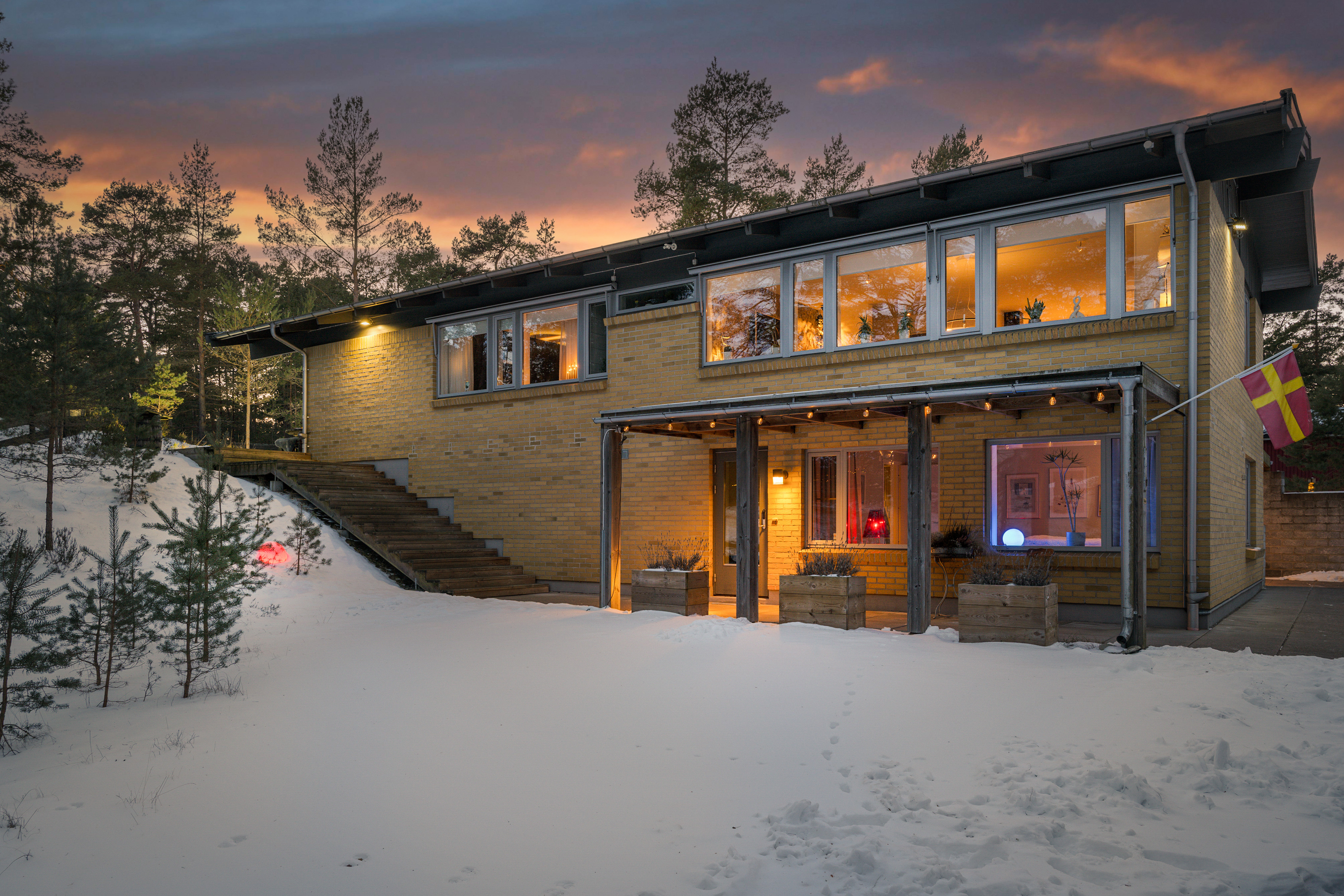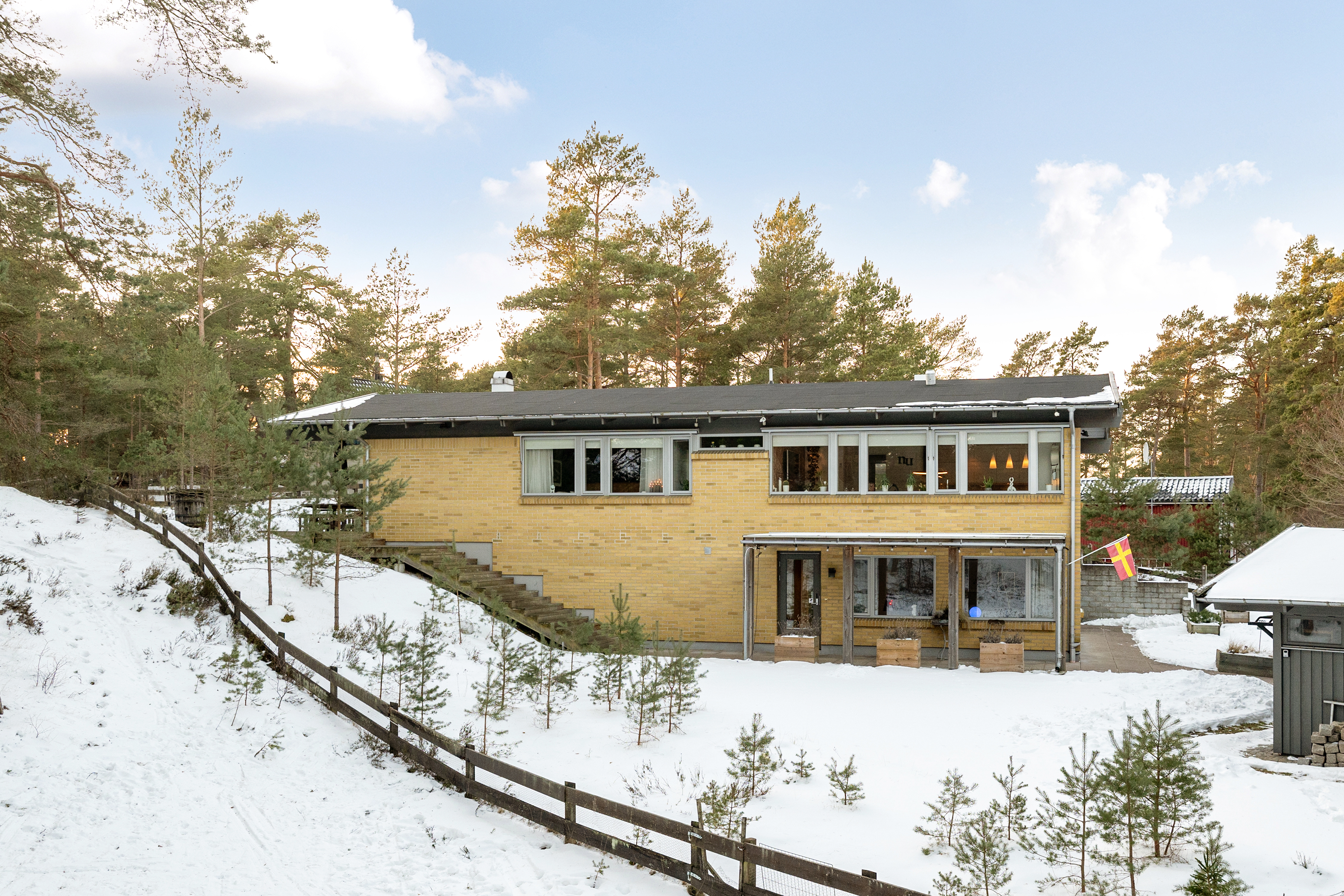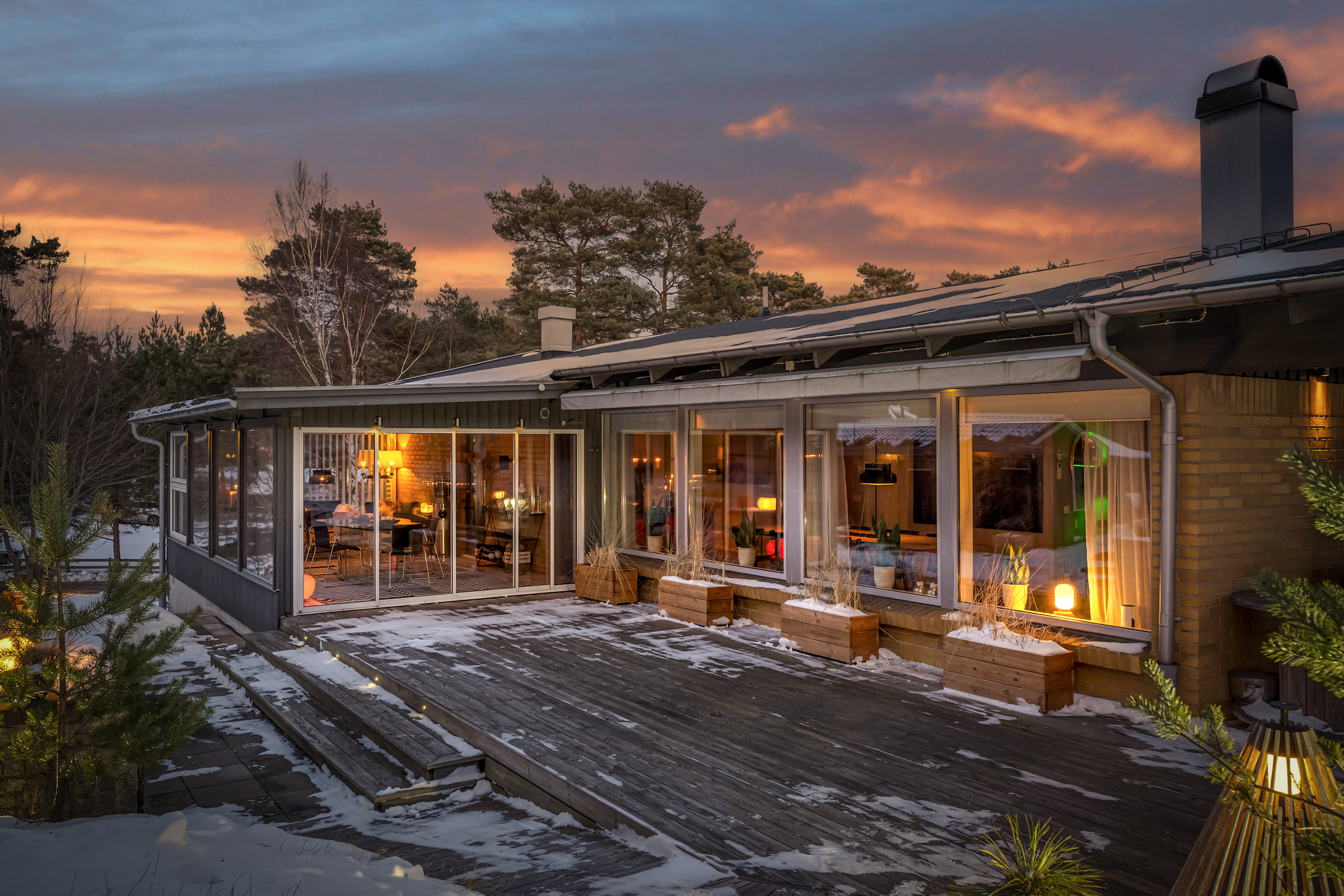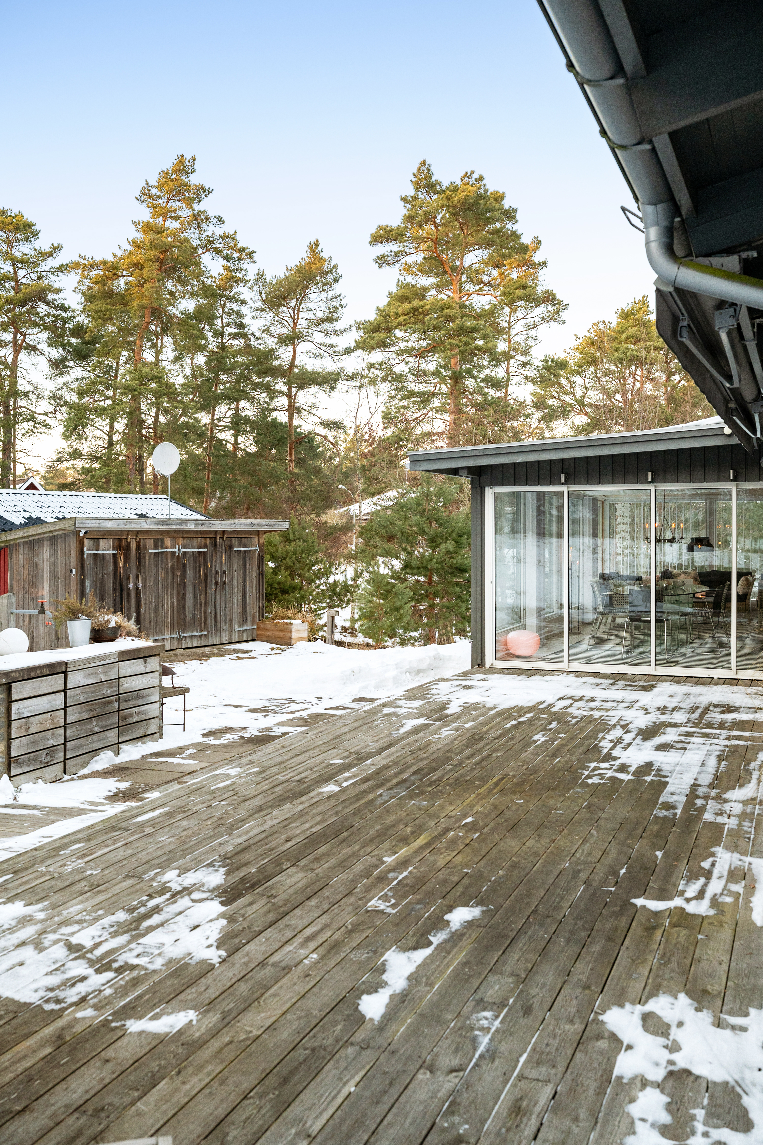 Det har byggts till ett fint uterum i anslutning till stora trädäck med både markis och stort takutsprång samt enklare utekök. Under uterummet finns en smart förrådskällare som kan användas till hobbyverkstad och förvaring.
