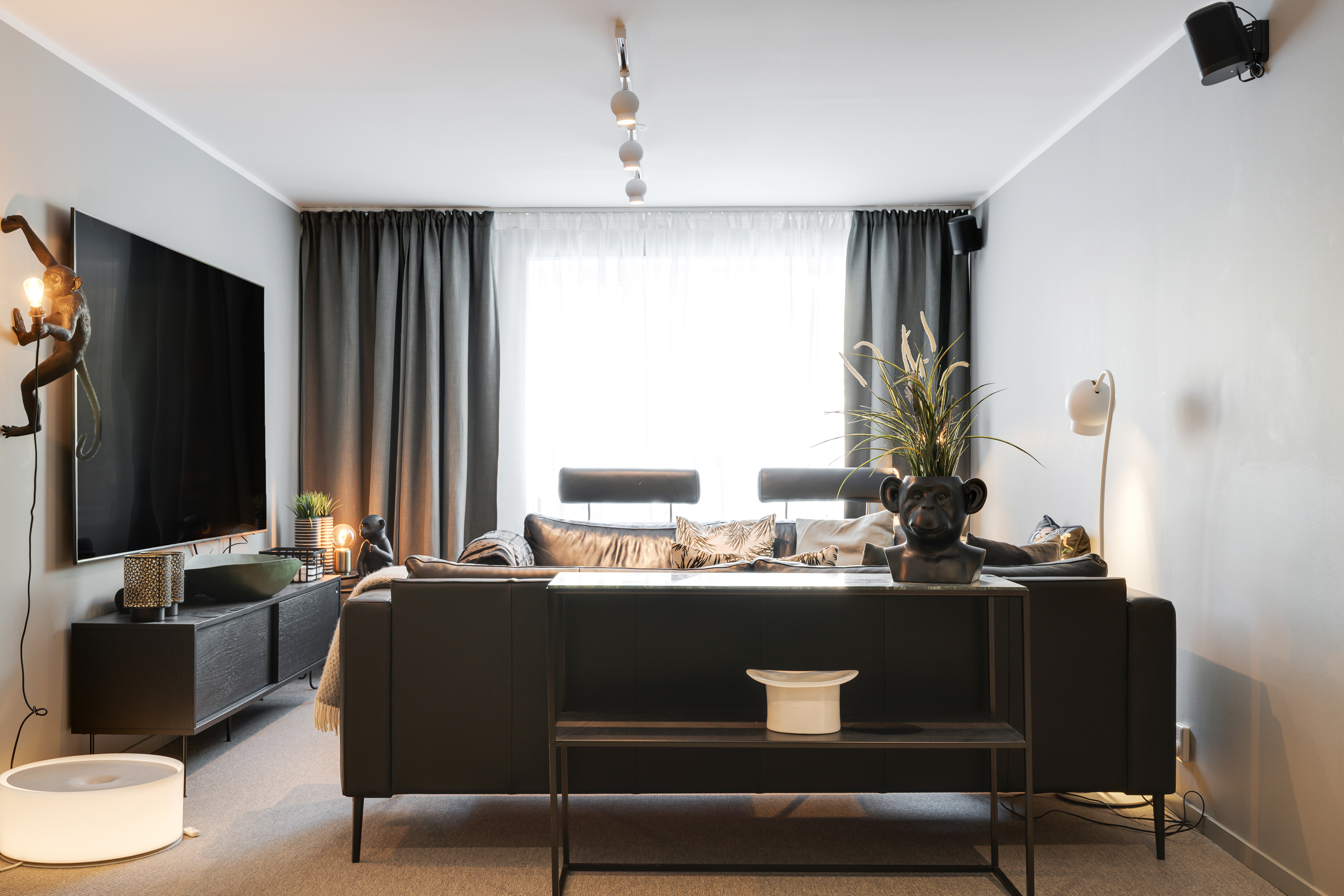 Matta och målad vägg. Infällda spotlights i tak.