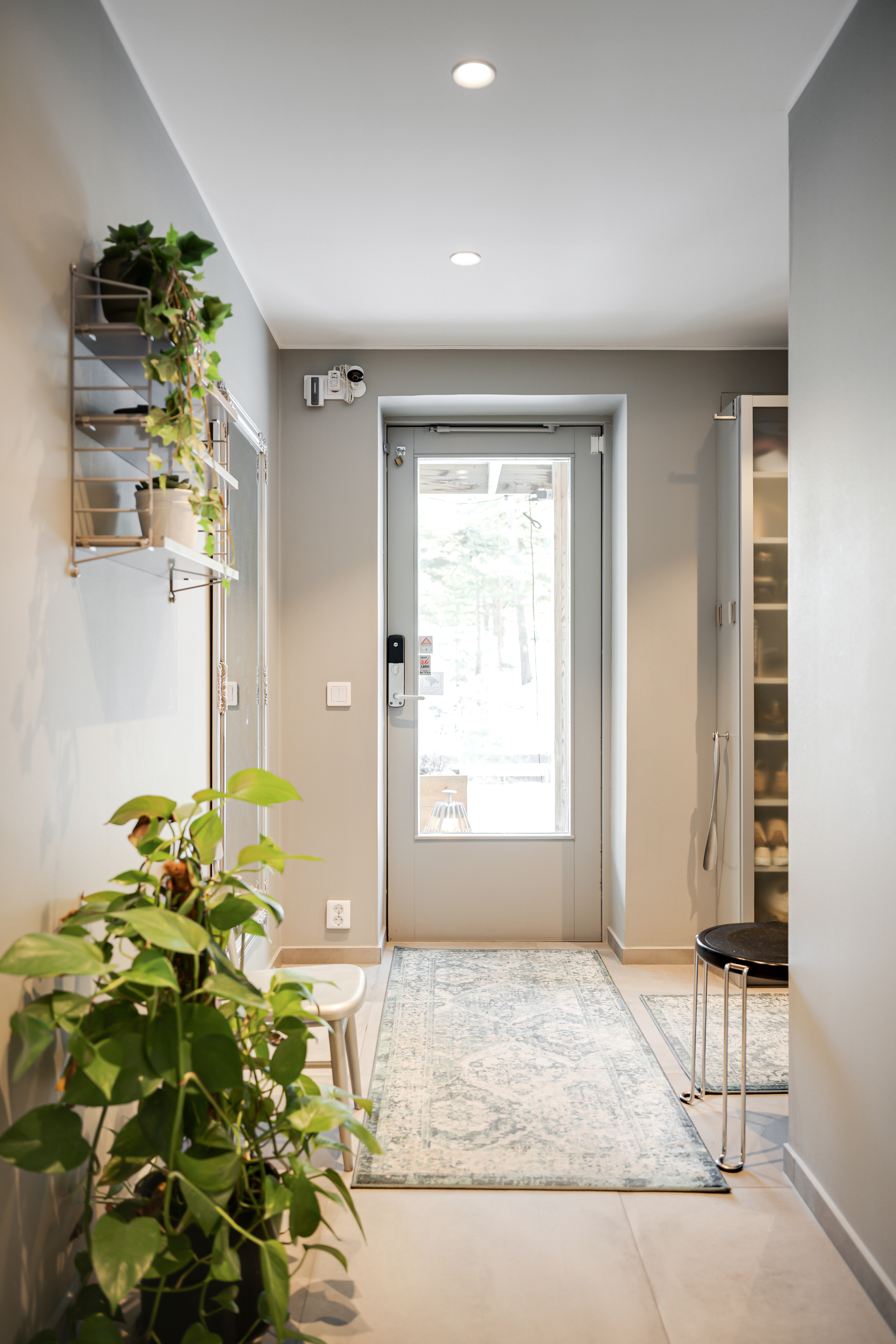 Matta och målad vägg. Luft/luft-värmepump. Infällda spotlights i tak vid trappuppgång.