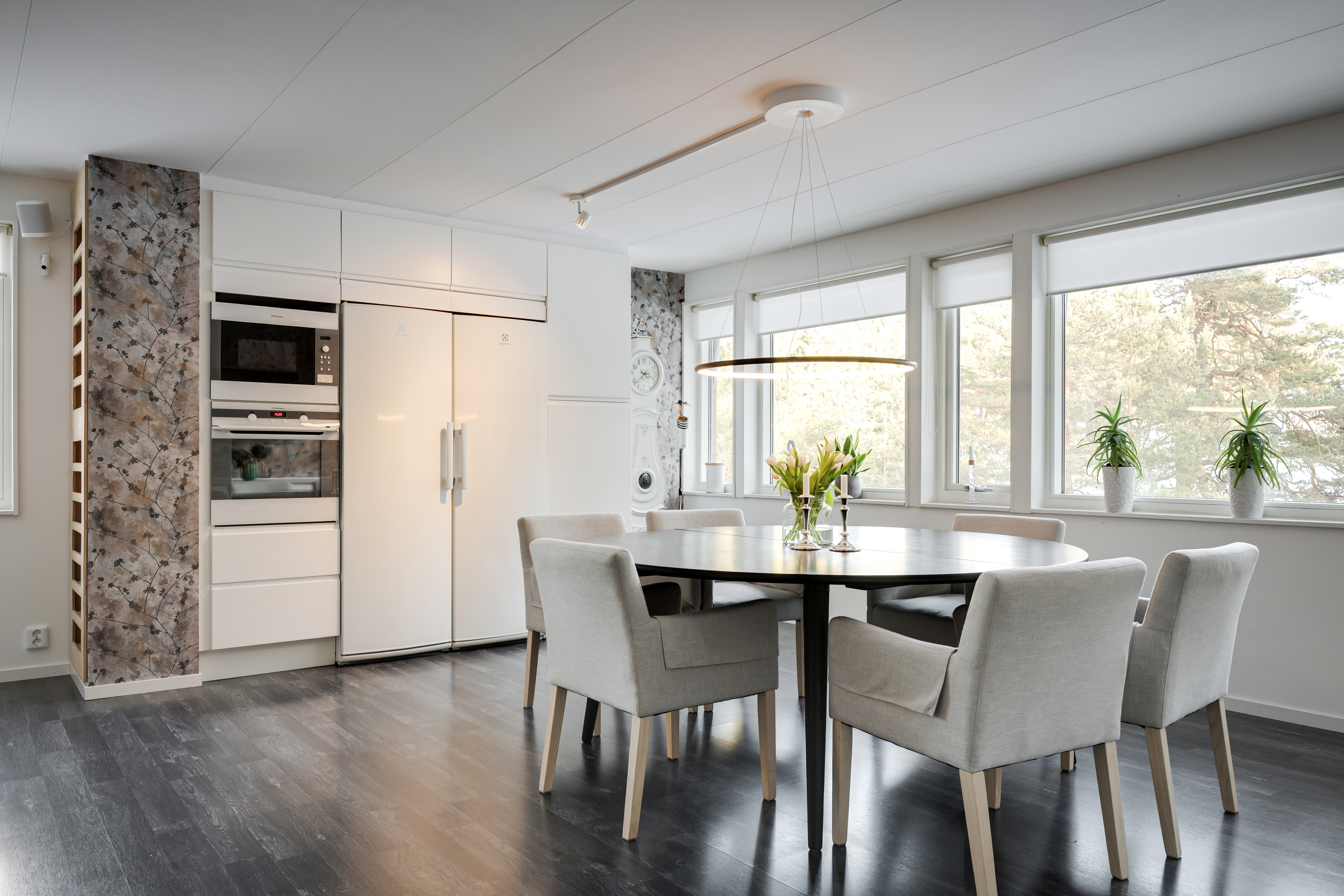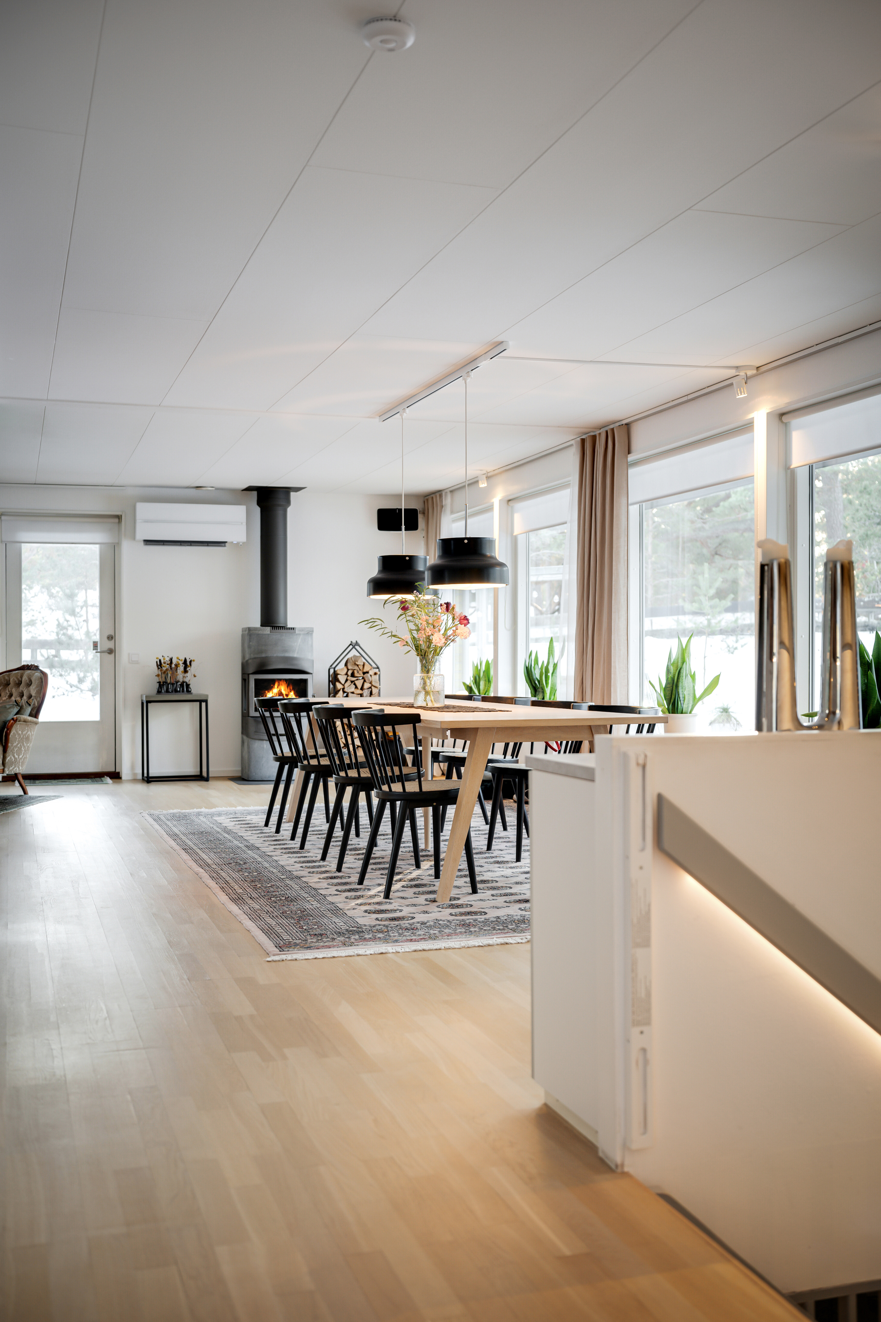 Ekparkett och målad vägg. Contura braskamin och luft/luft-värmepump. Altandörr till uterum och altandörr till trädäck.