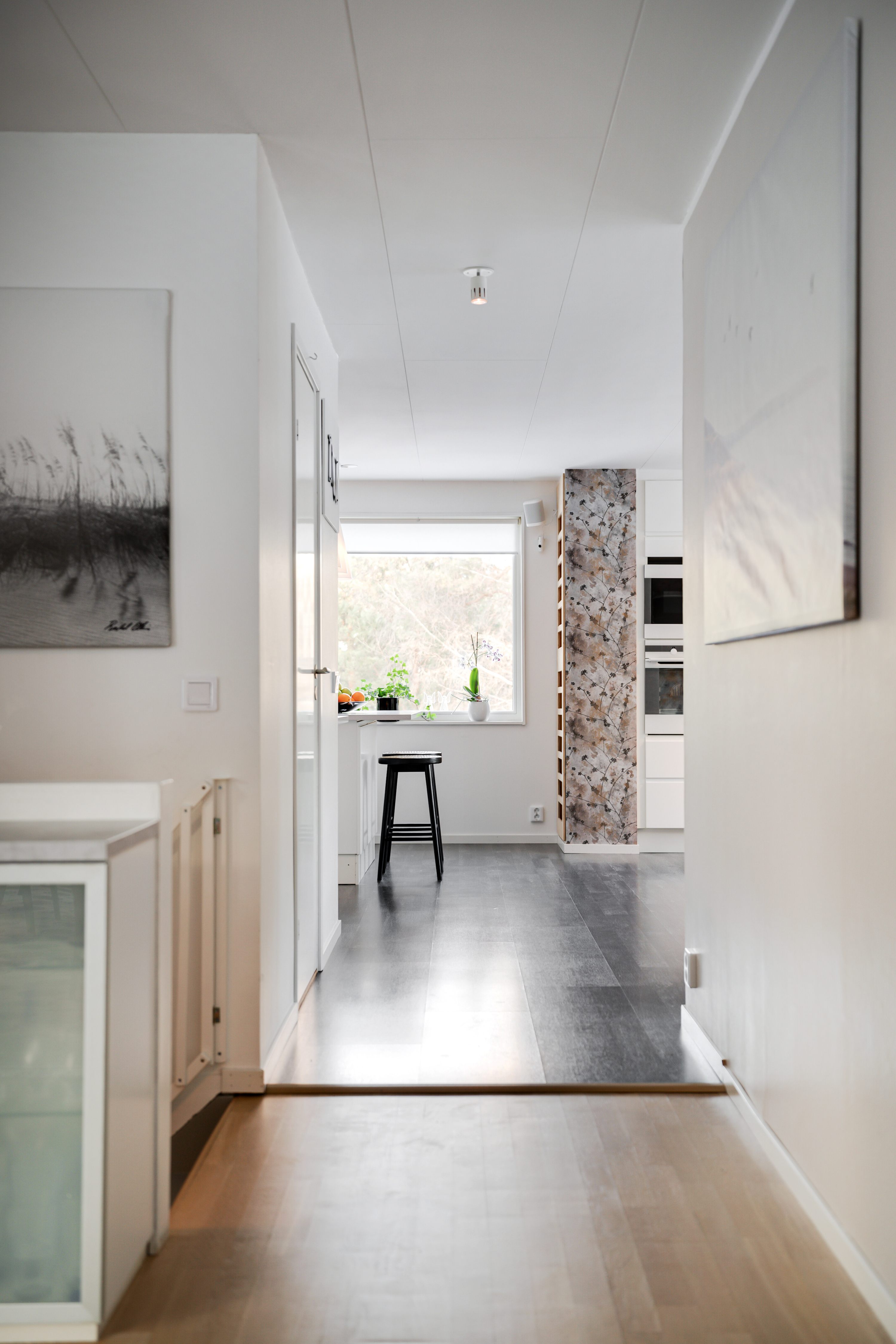 Laminatgolv och målad vägg. Köksinredning från IKEA, vitlack och laminatbänkytor liknande Perstorps "VirrVarr". Francke rostfri vask. Electrolux kyl, frys, diskmaskin, induktionshäll och Bosch köksfläkt.