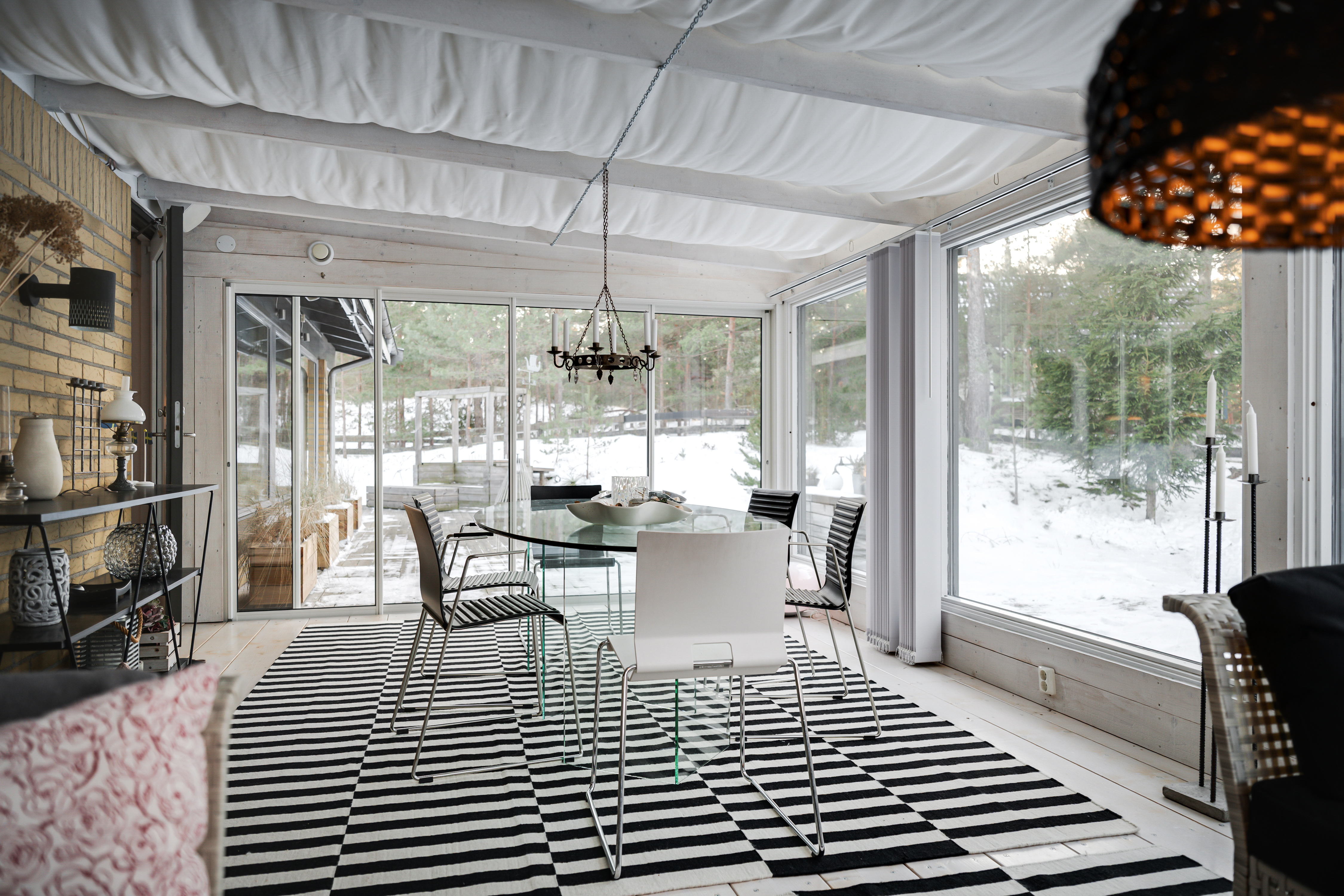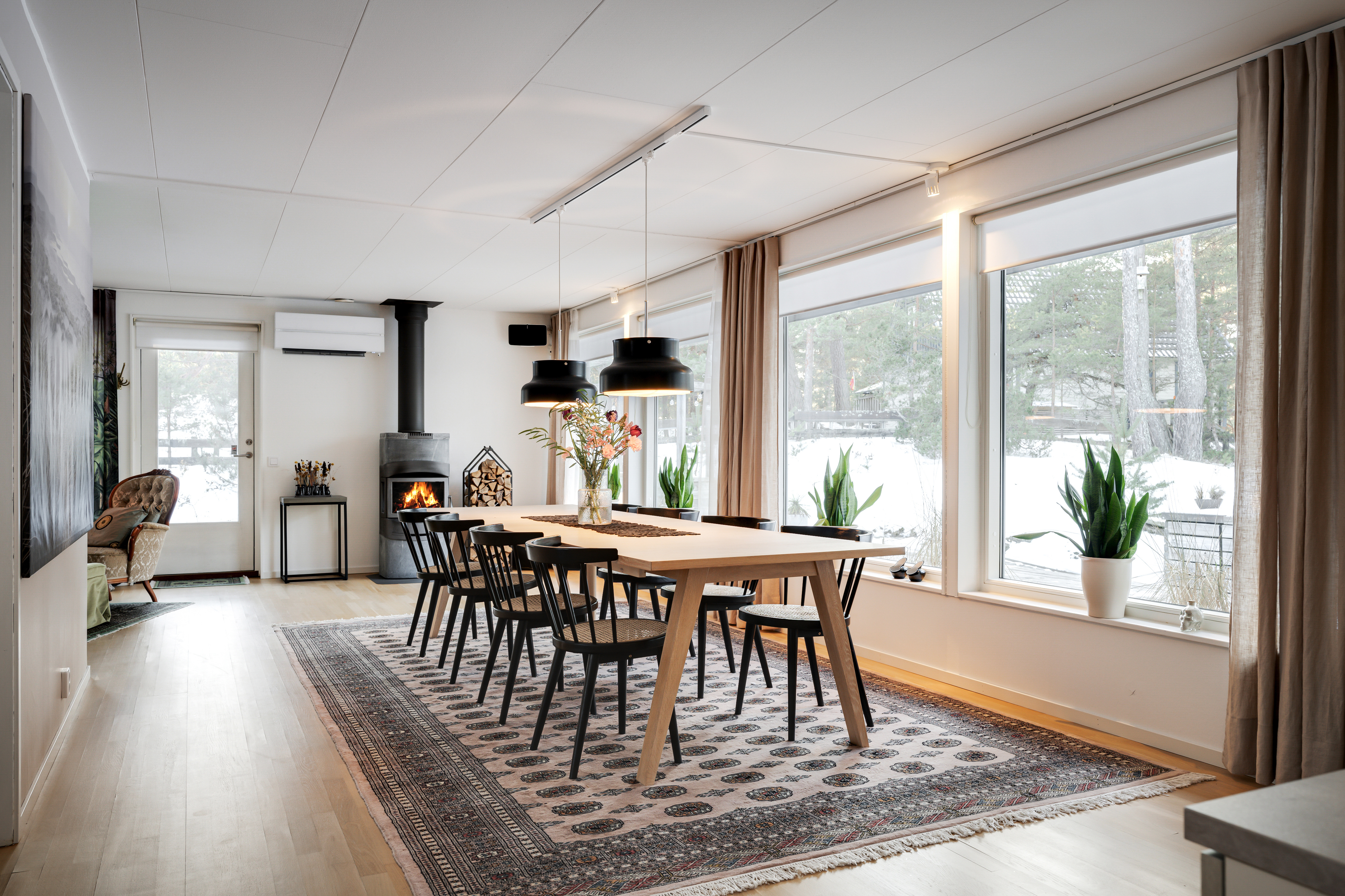 Matrum med braskamin och utgång till uterum och altan