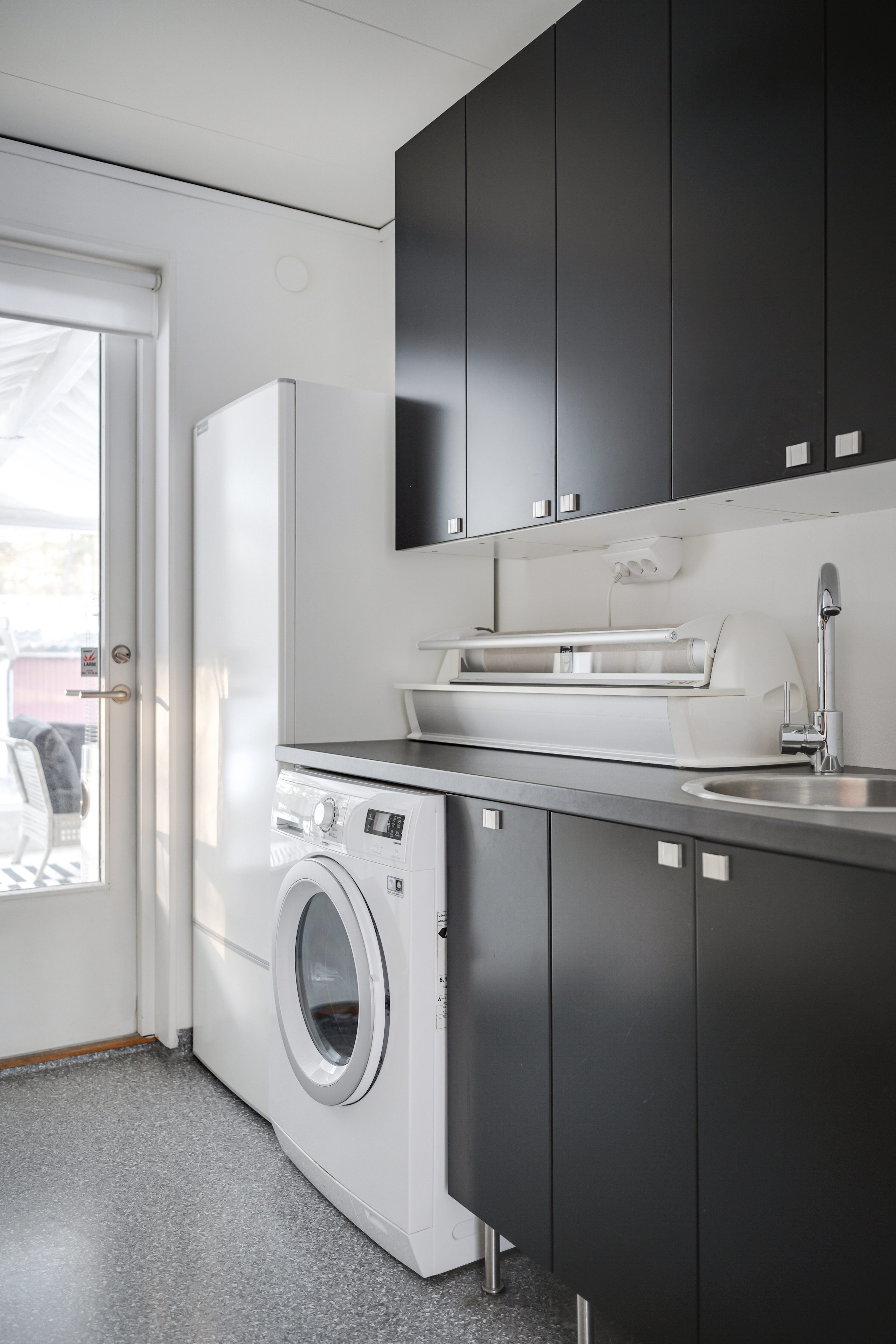 Tvättstuga på ovanplan, dörr till uterum