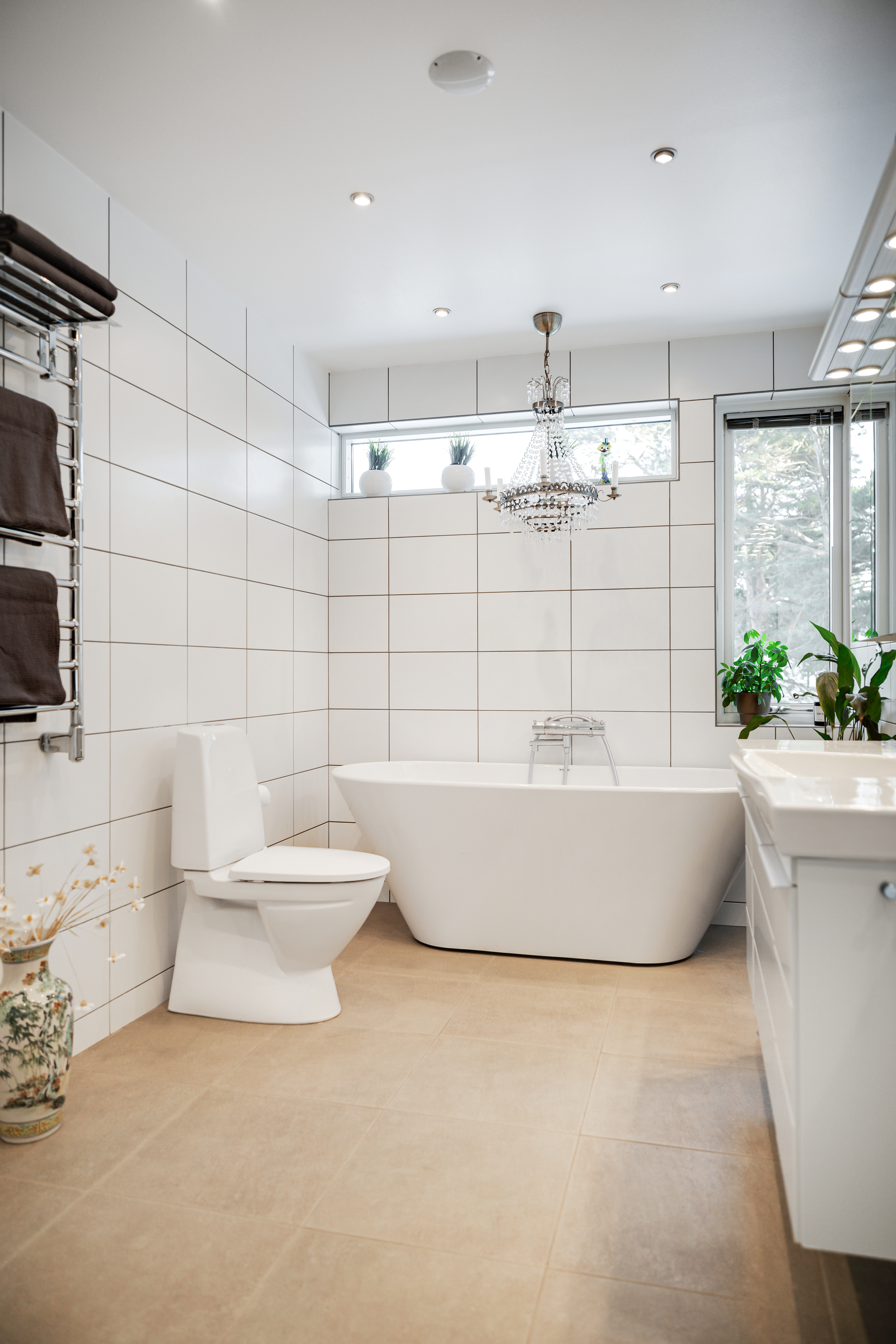 Klinkergolv med golvvärme och helkaklad vägg. Svedbergs badkar, IFÖ handfatskommod, stort spegelskåp, Dryson handduksvärmare, IDO glasväggar till dusch med takdusch, wc.
