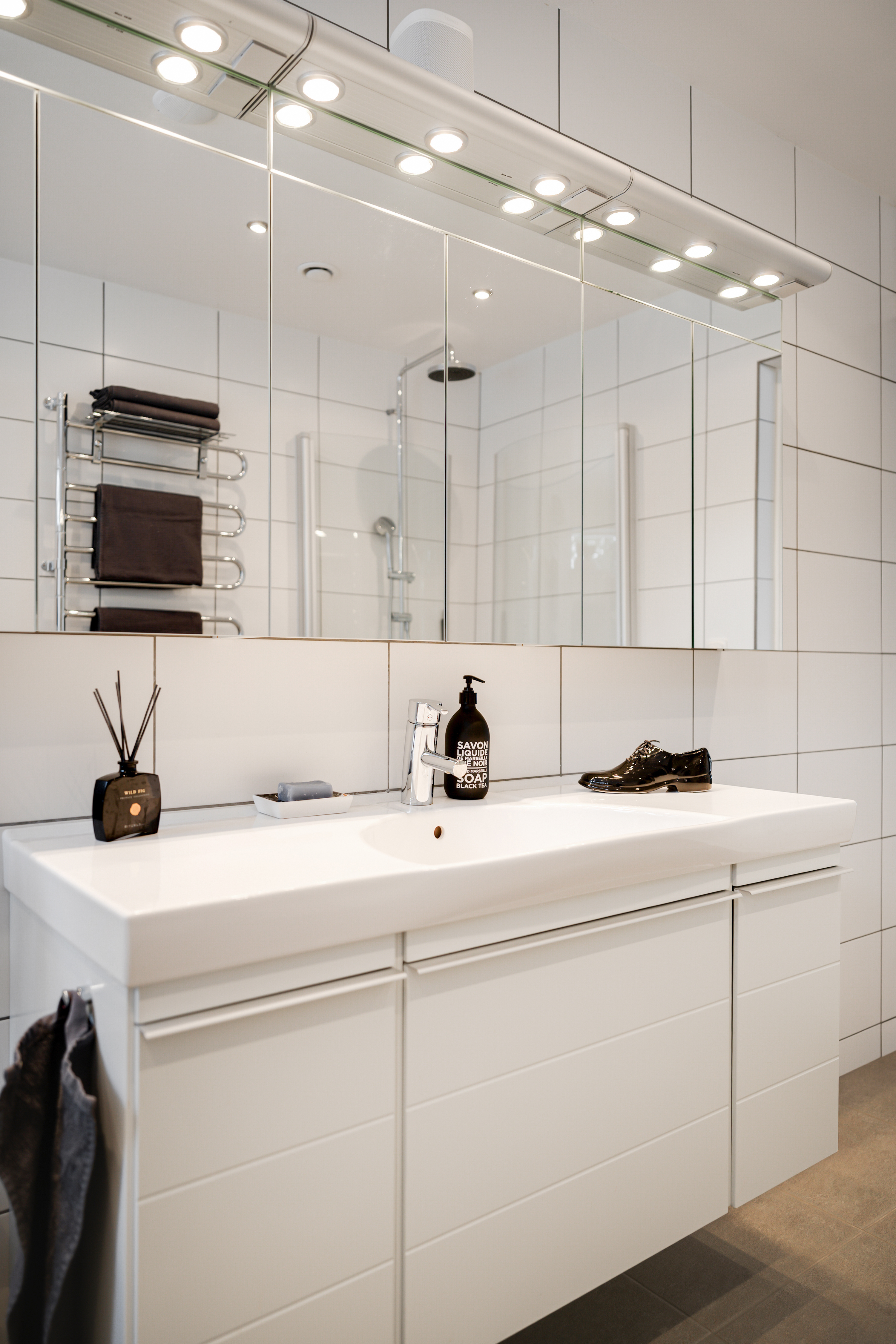 Klinkergolv med golvvärme och våtrumsmålad vägg. IFÖ Duschkabin, wc, handfatskommod och Dryson handduksvärmare. Infällda spotlights i tak.