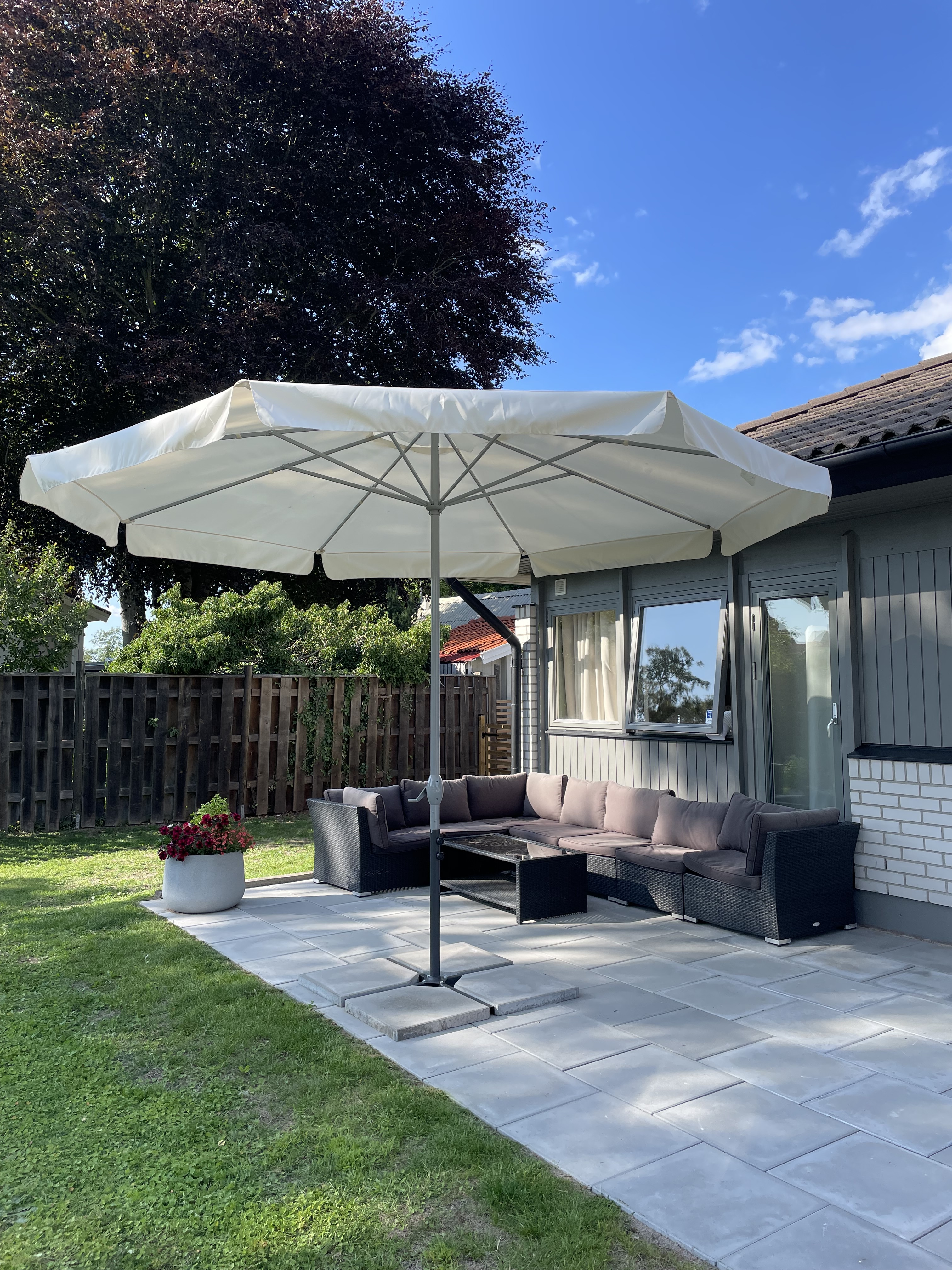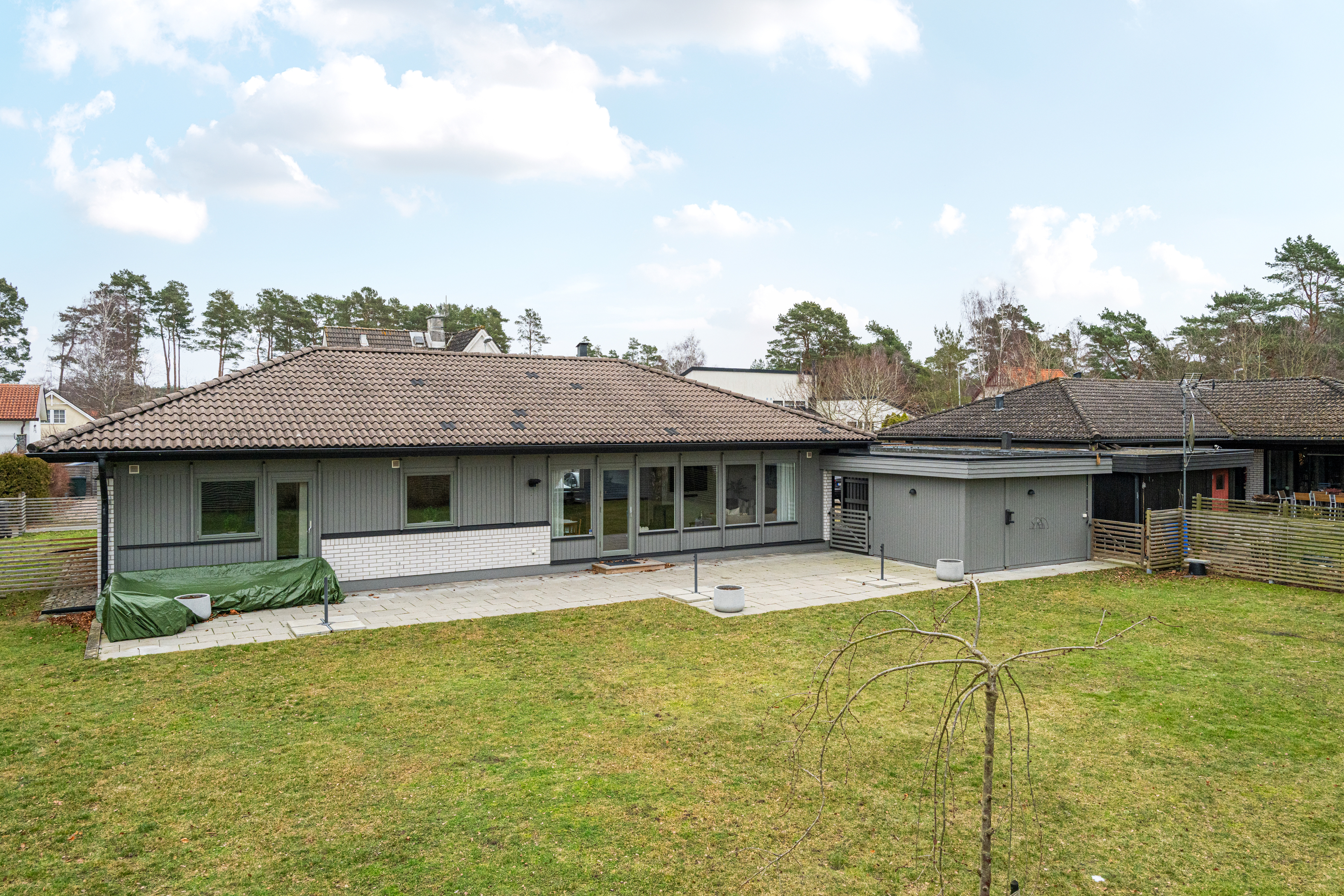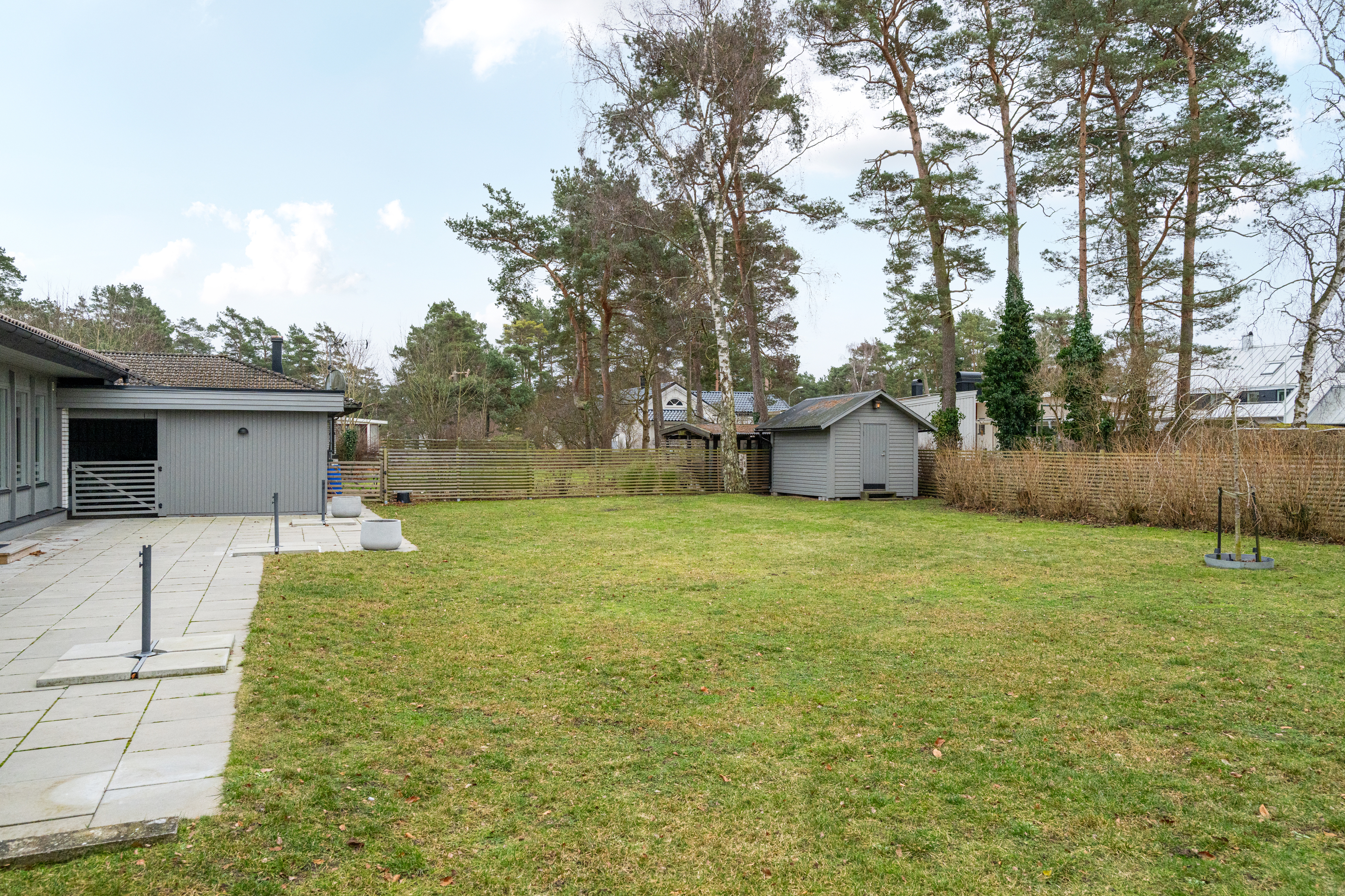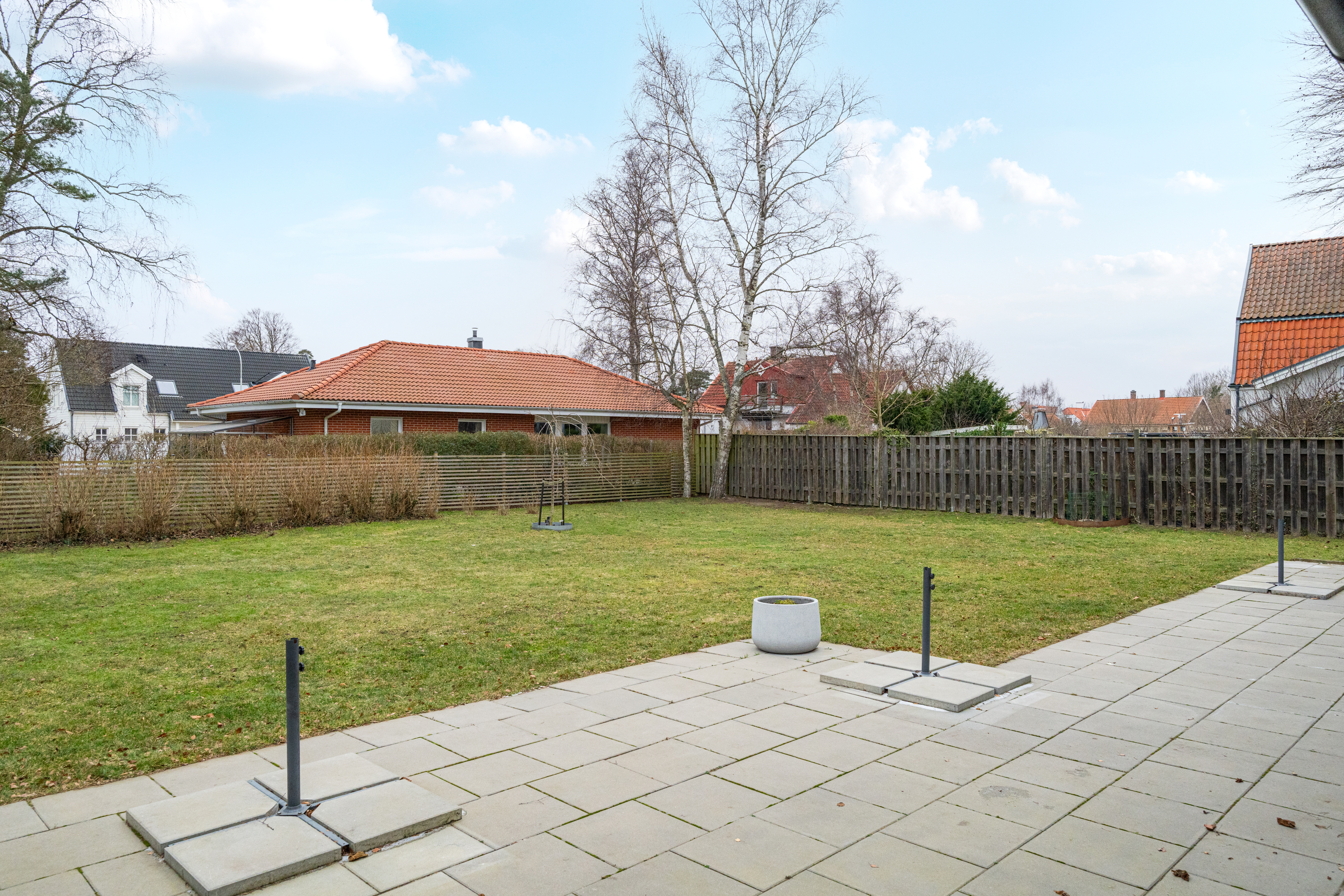 Hela baksidan med eftermiddags- och kvällssol. Utgång från vardagsrum. Trädgårdstomt med gräsmatta. Bevattningspump finns vid tomtgräns och delas med grannen på Ljungstigen 2C. Robotgräsklippare ingår ej i köpet.