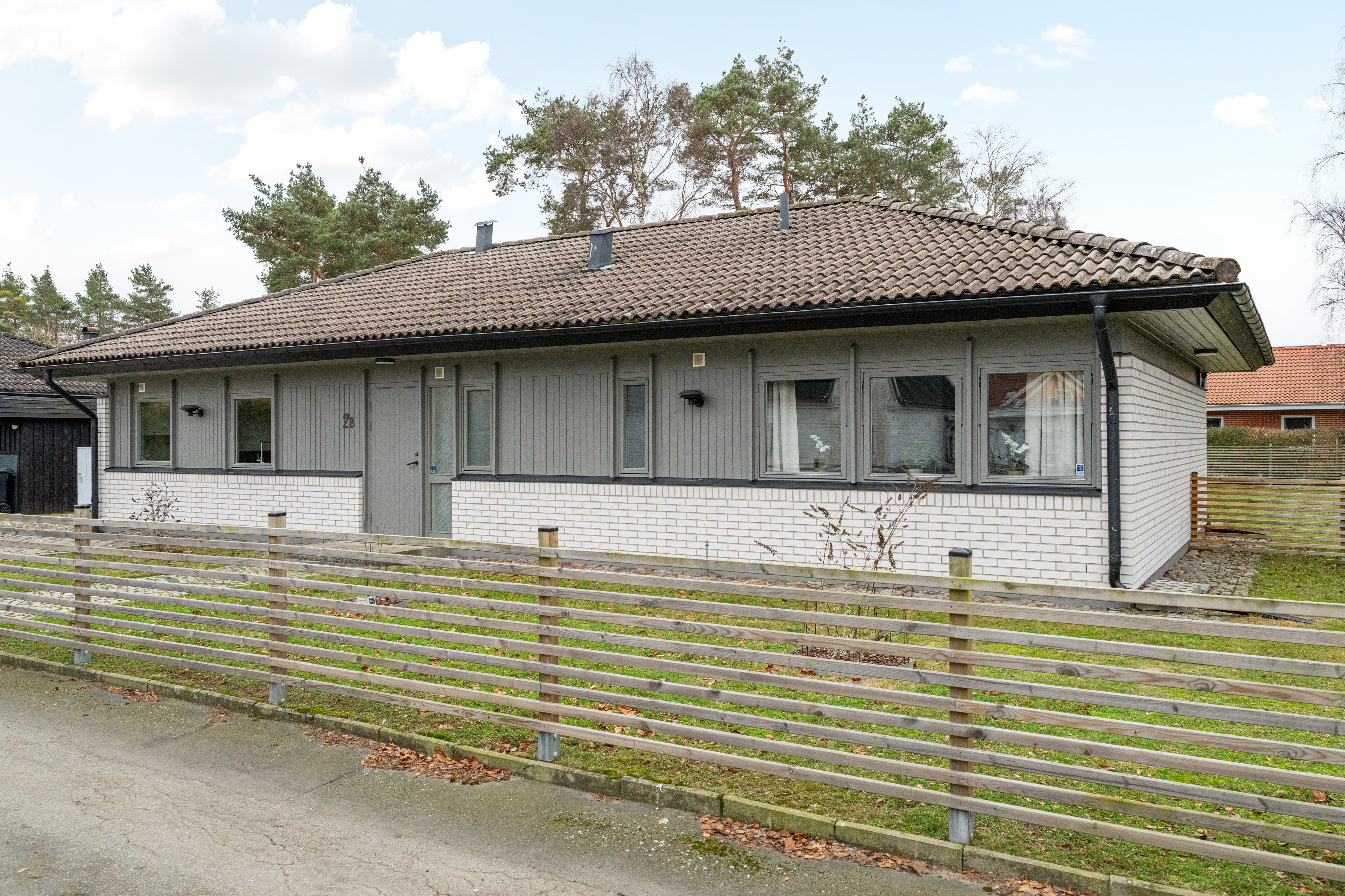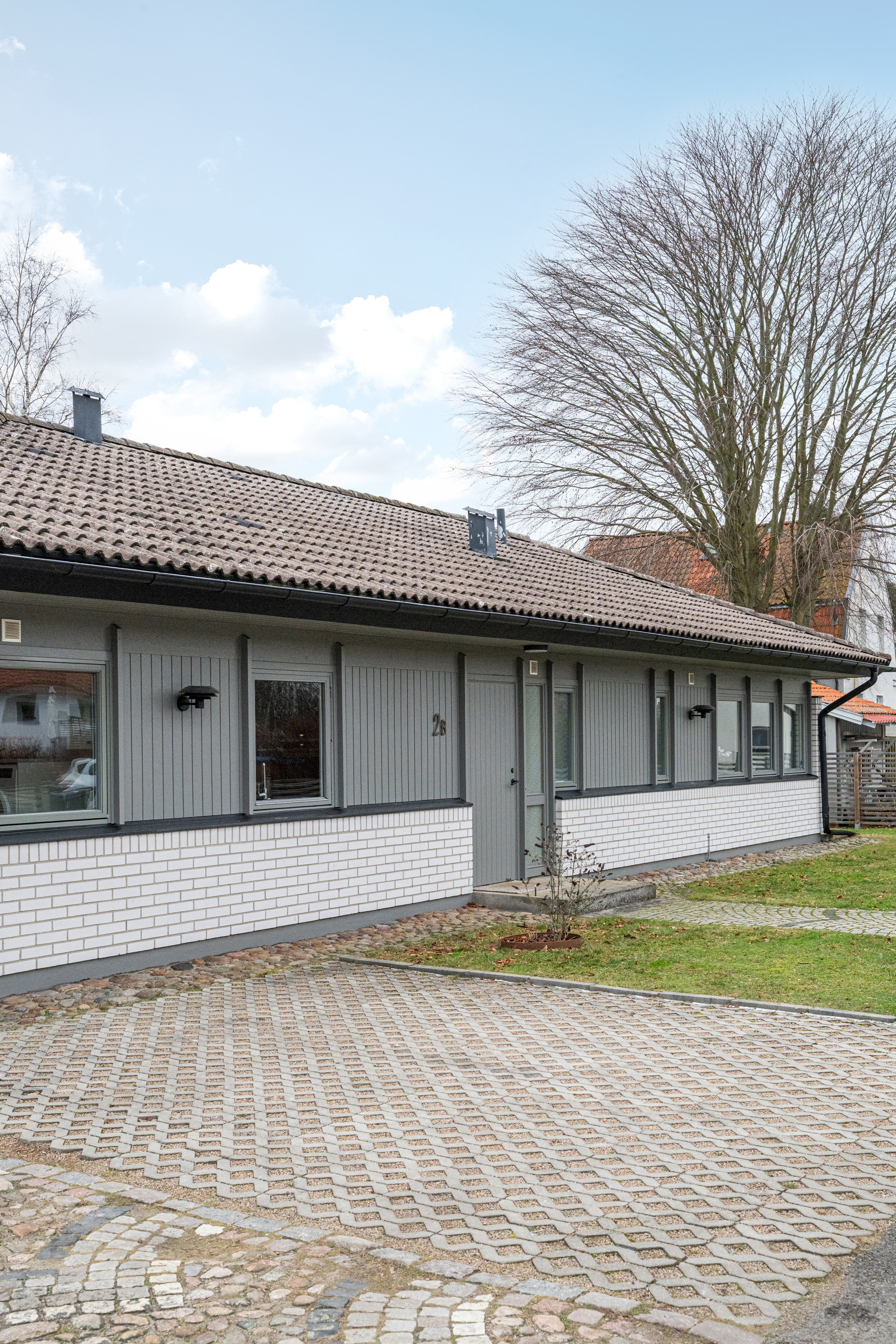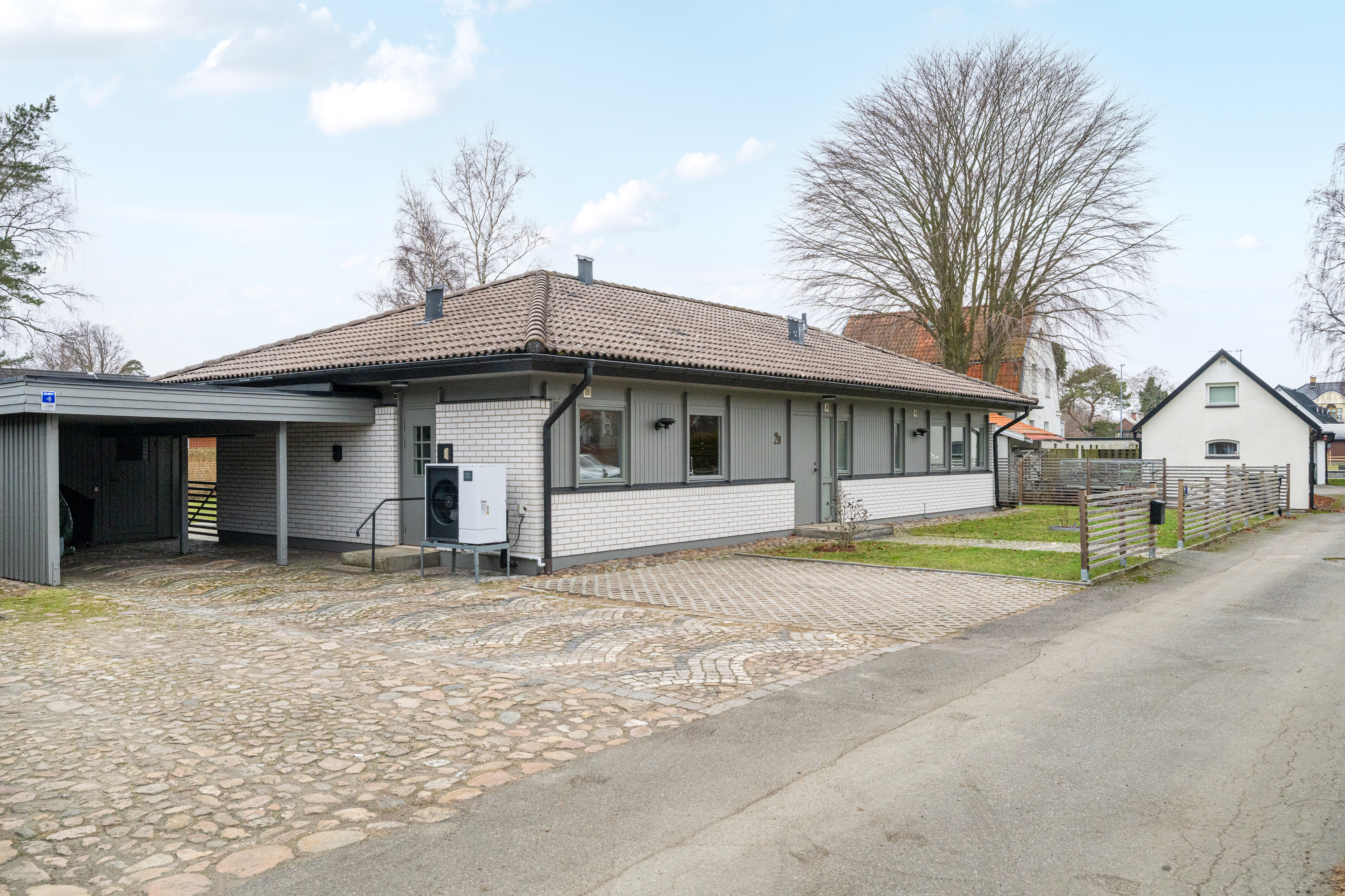 Framsida med uppfart och carport