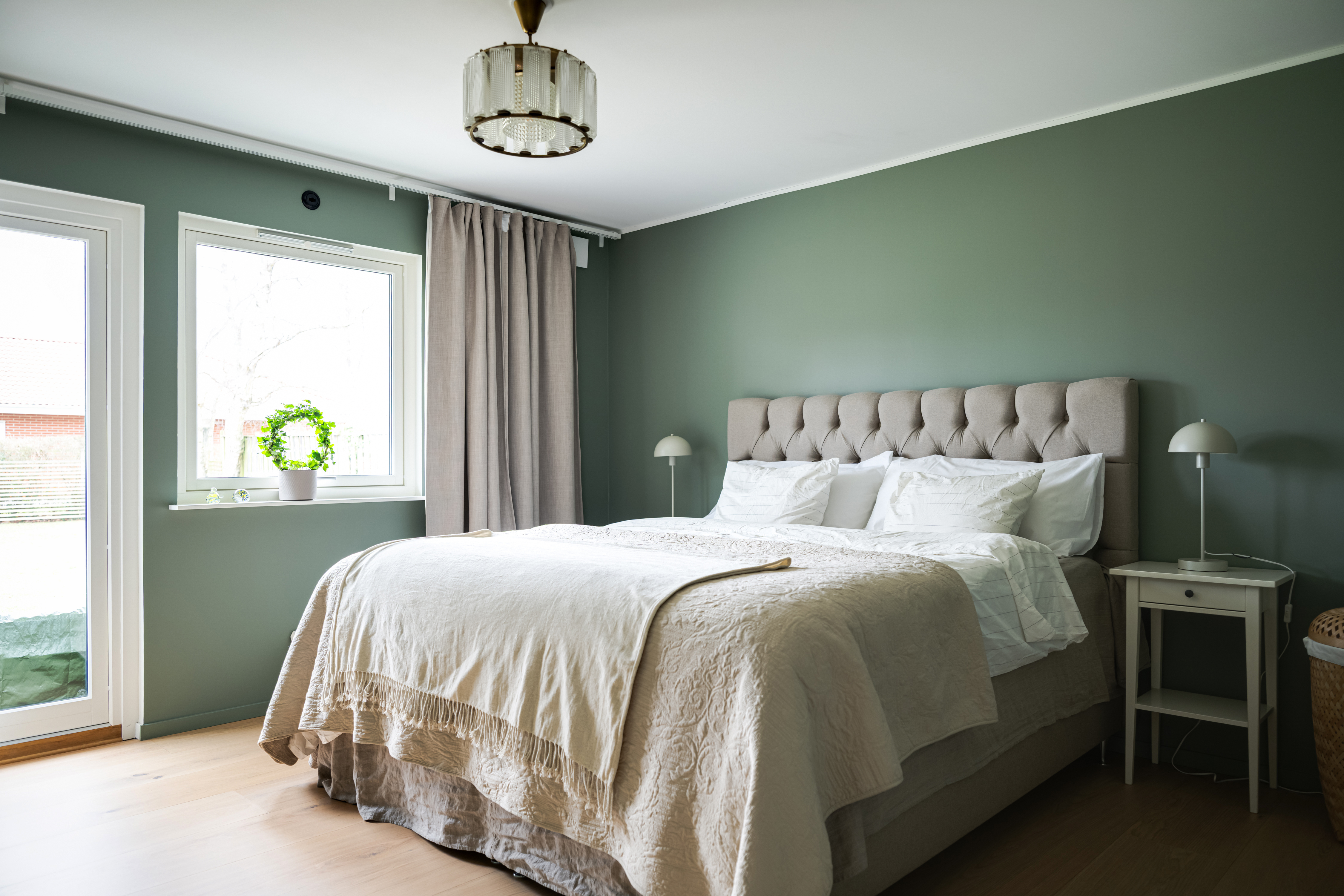 - Parkettgolv (1-stav ek) och målad vägg (grön). - Garderobsvägg. - Altandörr.