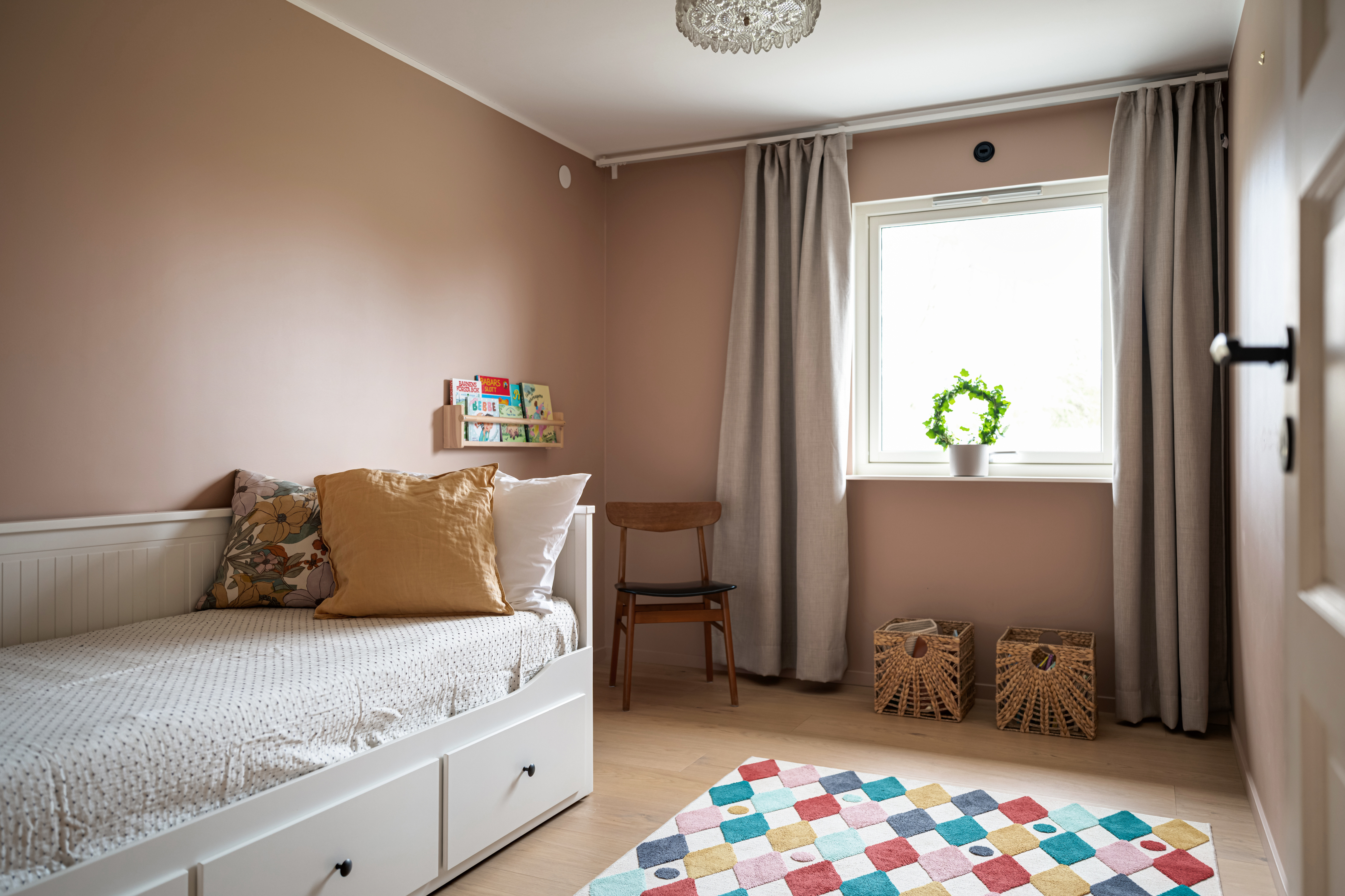 - Parkettgolv (1-stav ek) och målad vägg (rosa). - Garderob bakom dörren.