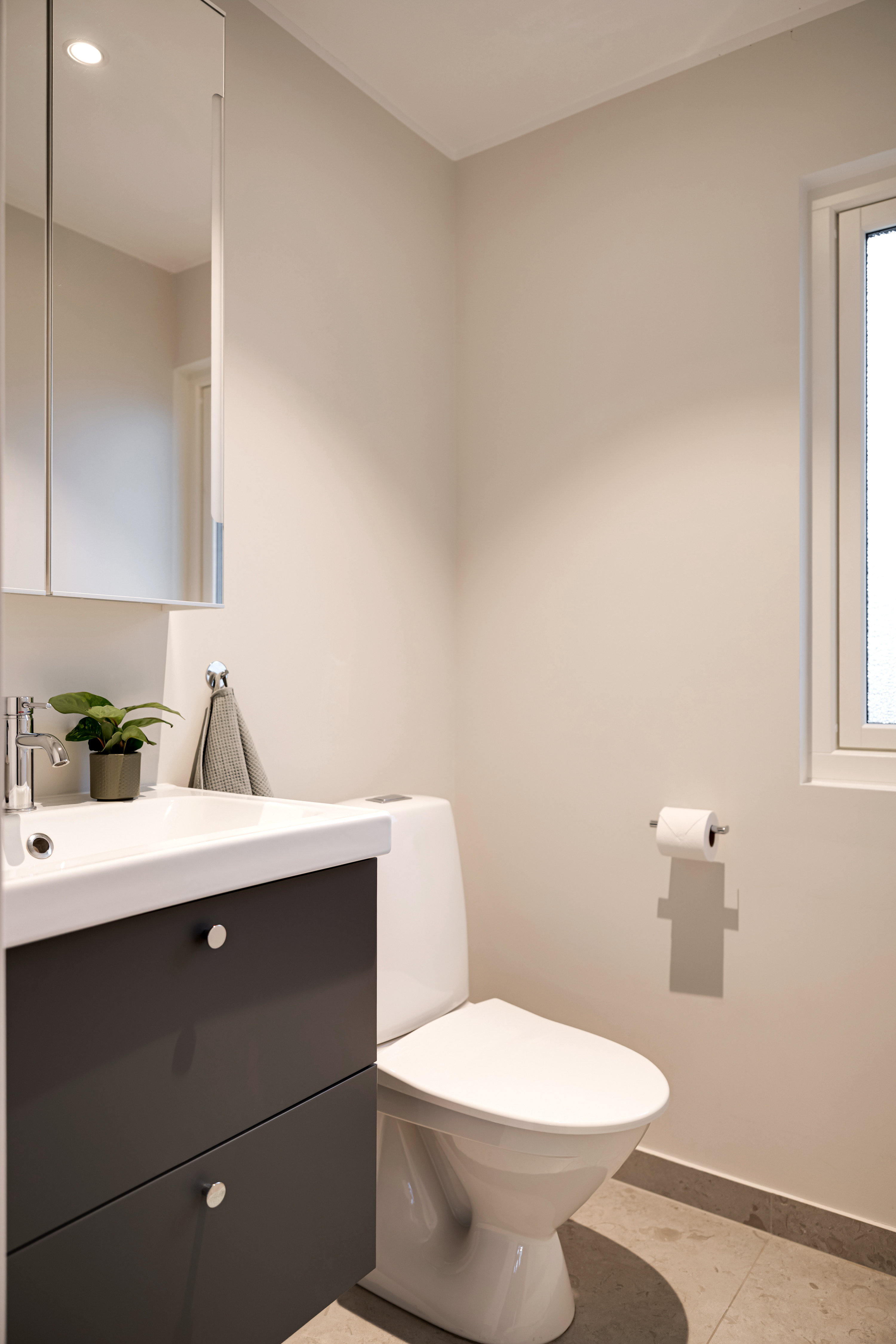 - Klinkergolv (Bricmate 60x60-plattor) och målade väggar. - WC-stol, handfat med kommod, spegelskåp. - Infällda spotlight i tak.