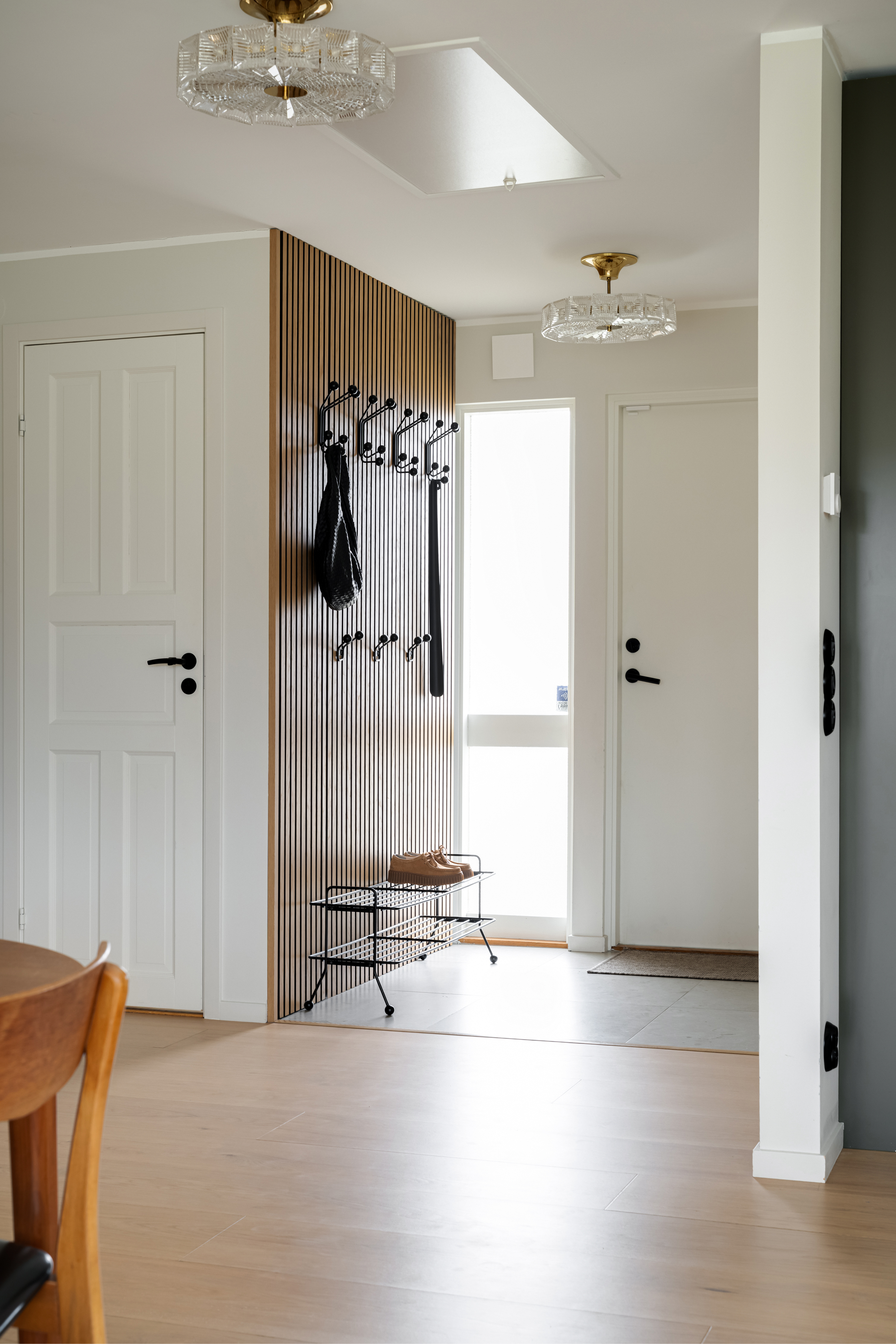 - Klinkergolv (Bricmate 60x60-plattor) och målad vägg. - Akustikpanel med krokar.