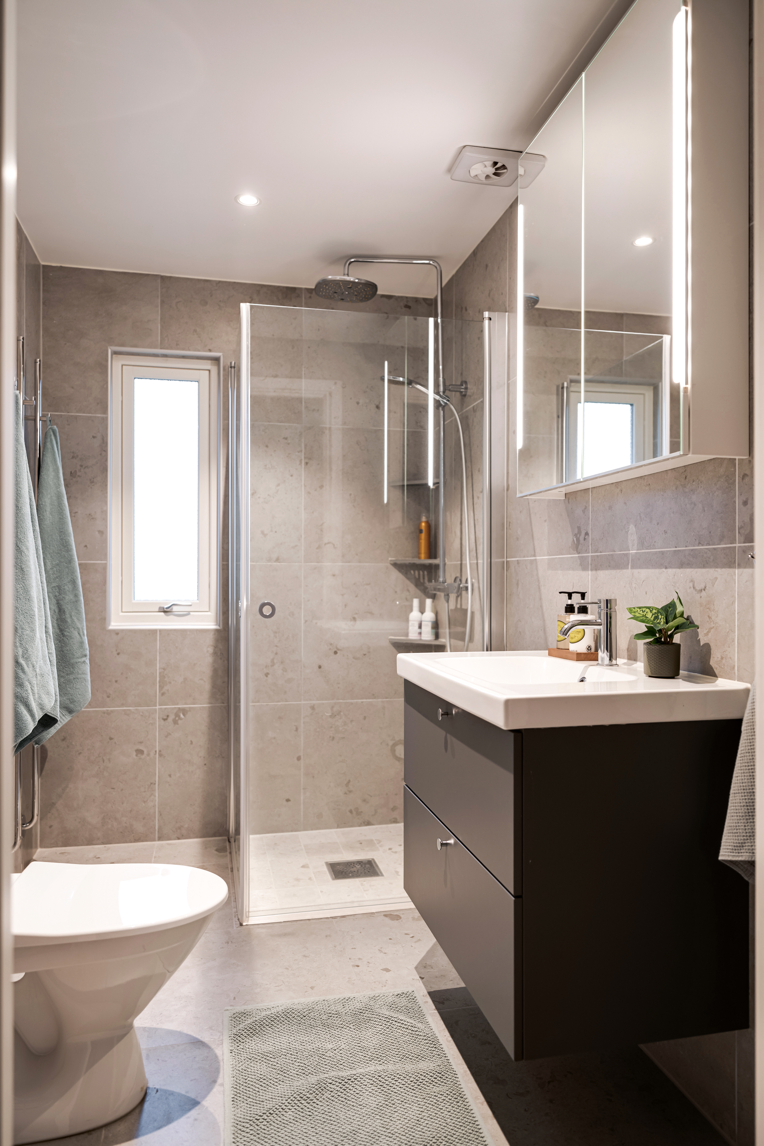 - Helkaklat med både kakel och klinker (Bricmate 60x60-plattor). - WC-stol, handfat med kommod, spegelskåp, dusch med glasdörrar samt 4 st handdukstork. - Infällda spotlights i tak.