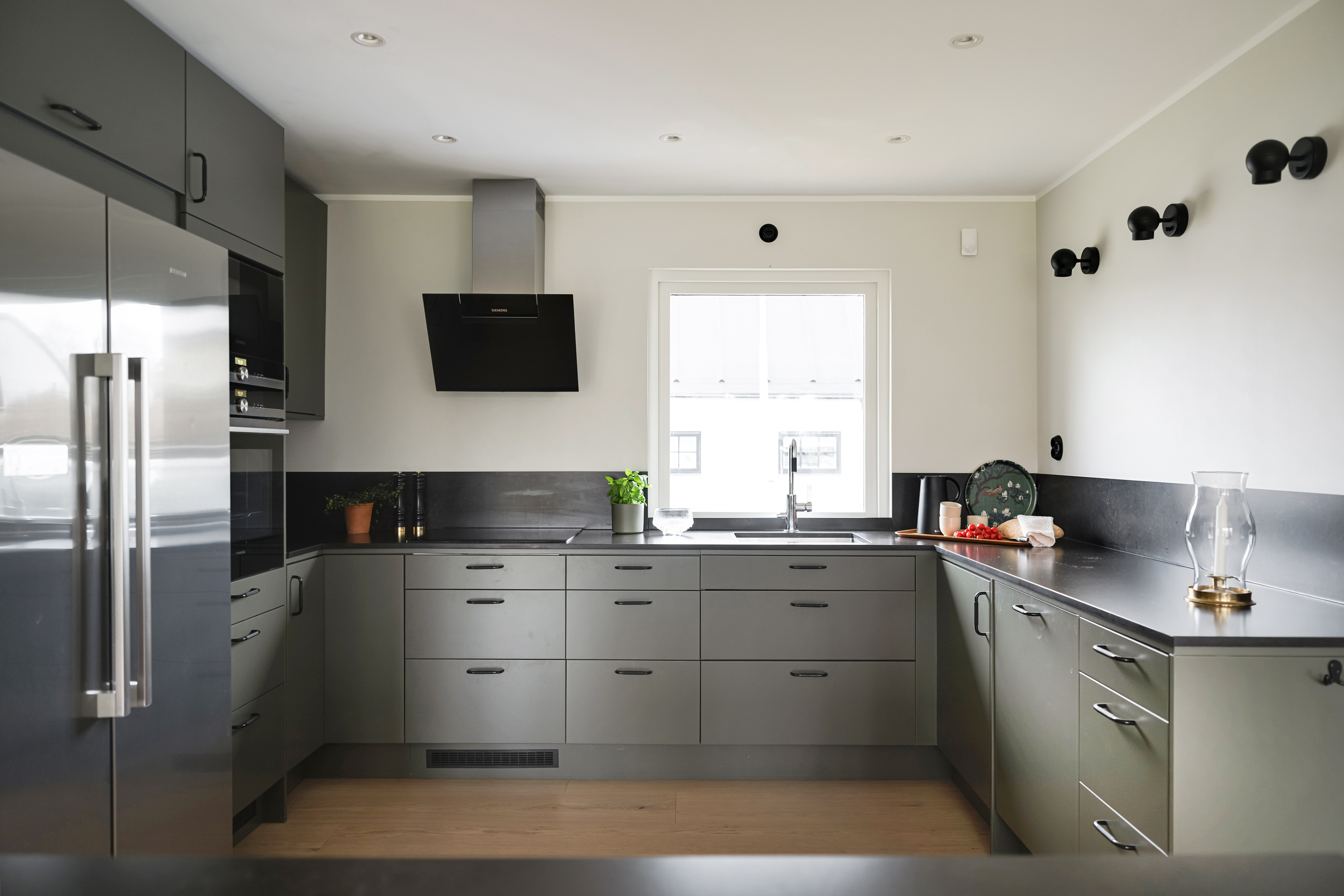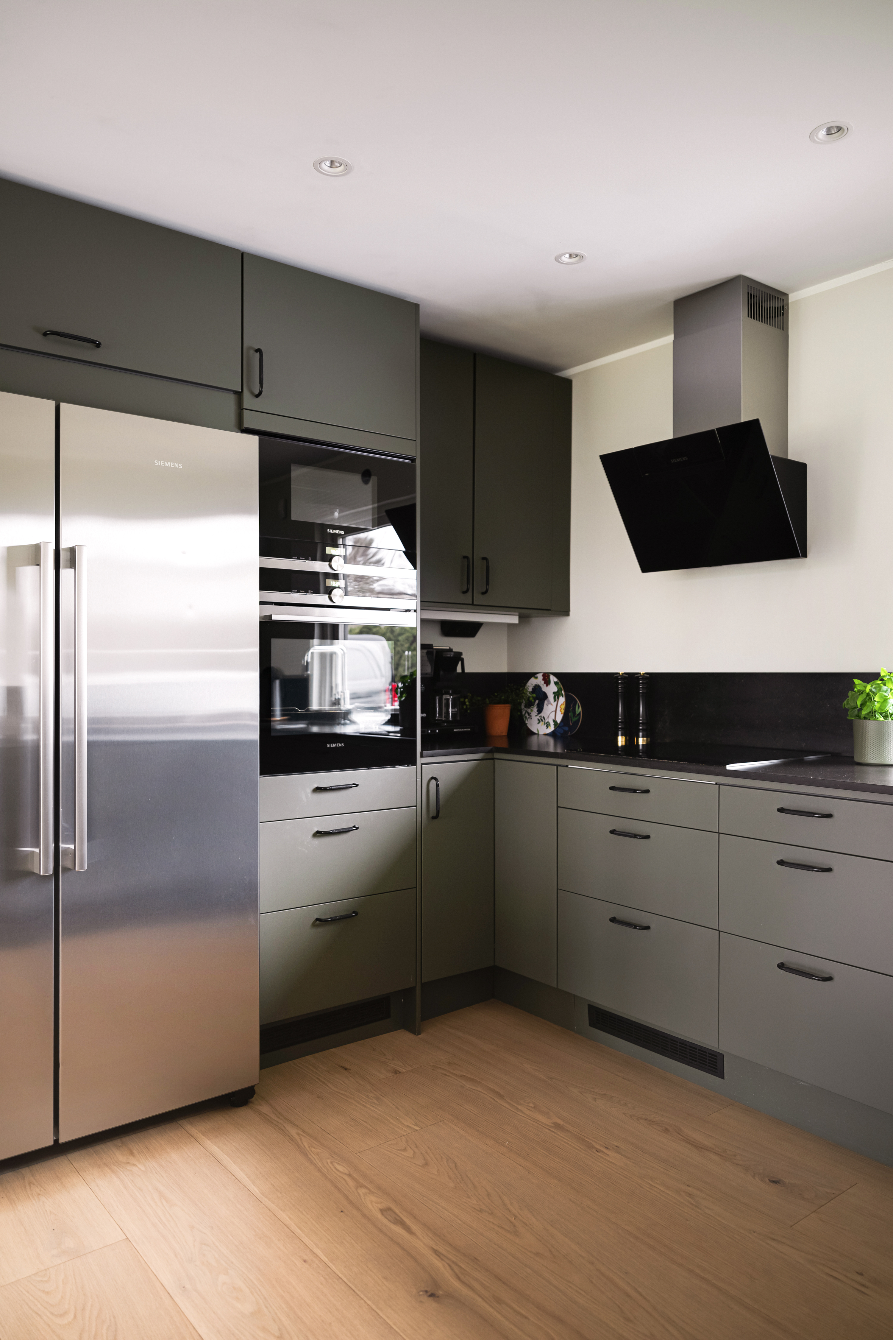 - Köksinredning från Epoq. - Gröna luckor och mörk stenbänkskiva samt stänkskydd. - Vitvaror från Siemens: kyl/frys, ugn, micro, spishäll, köksfläkt samt integrerad diskmaskin. - Köksö med vinkyl. - Väggbelysning Ogle från Ateljé Lyktan. - Infällda spotlights i tak.