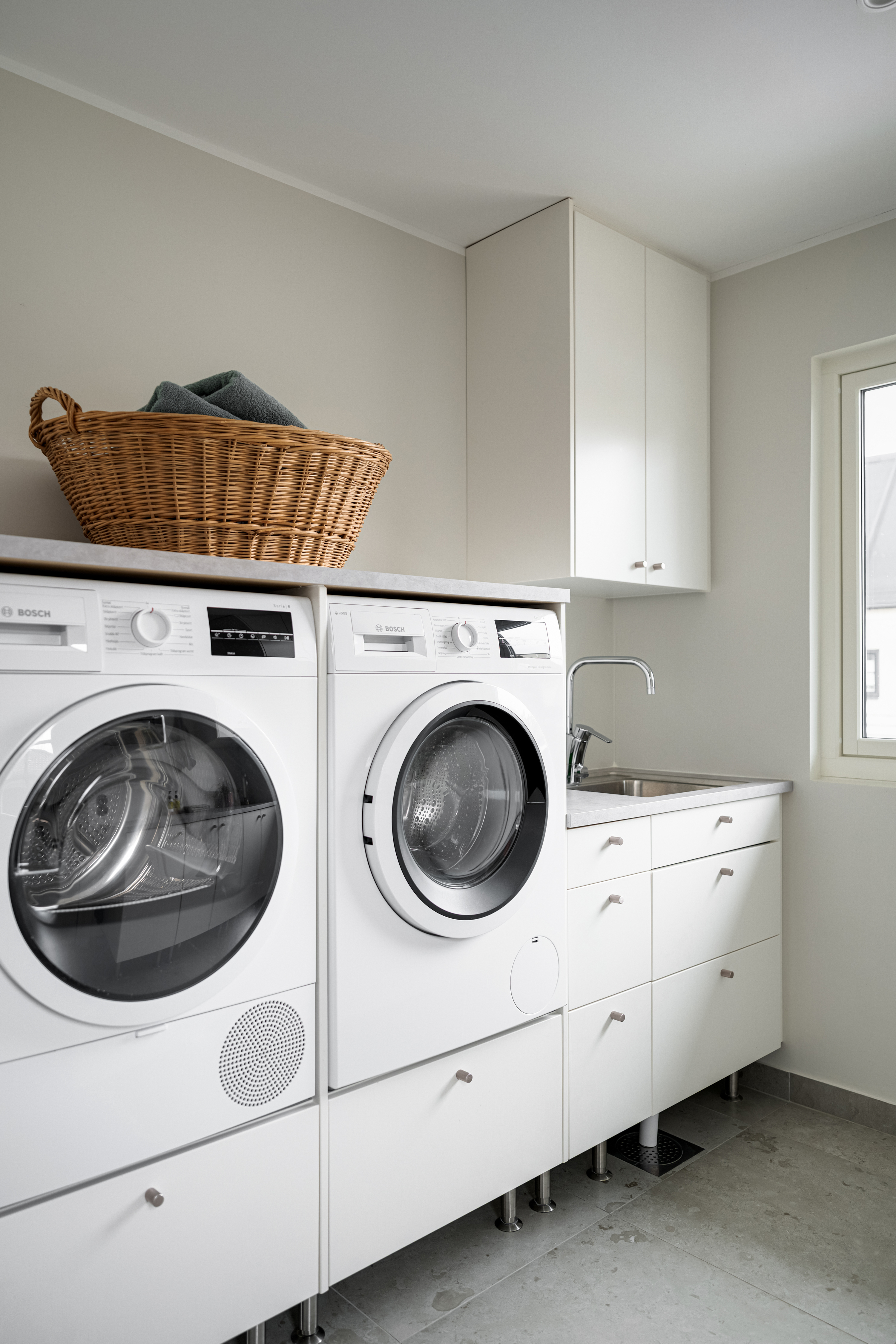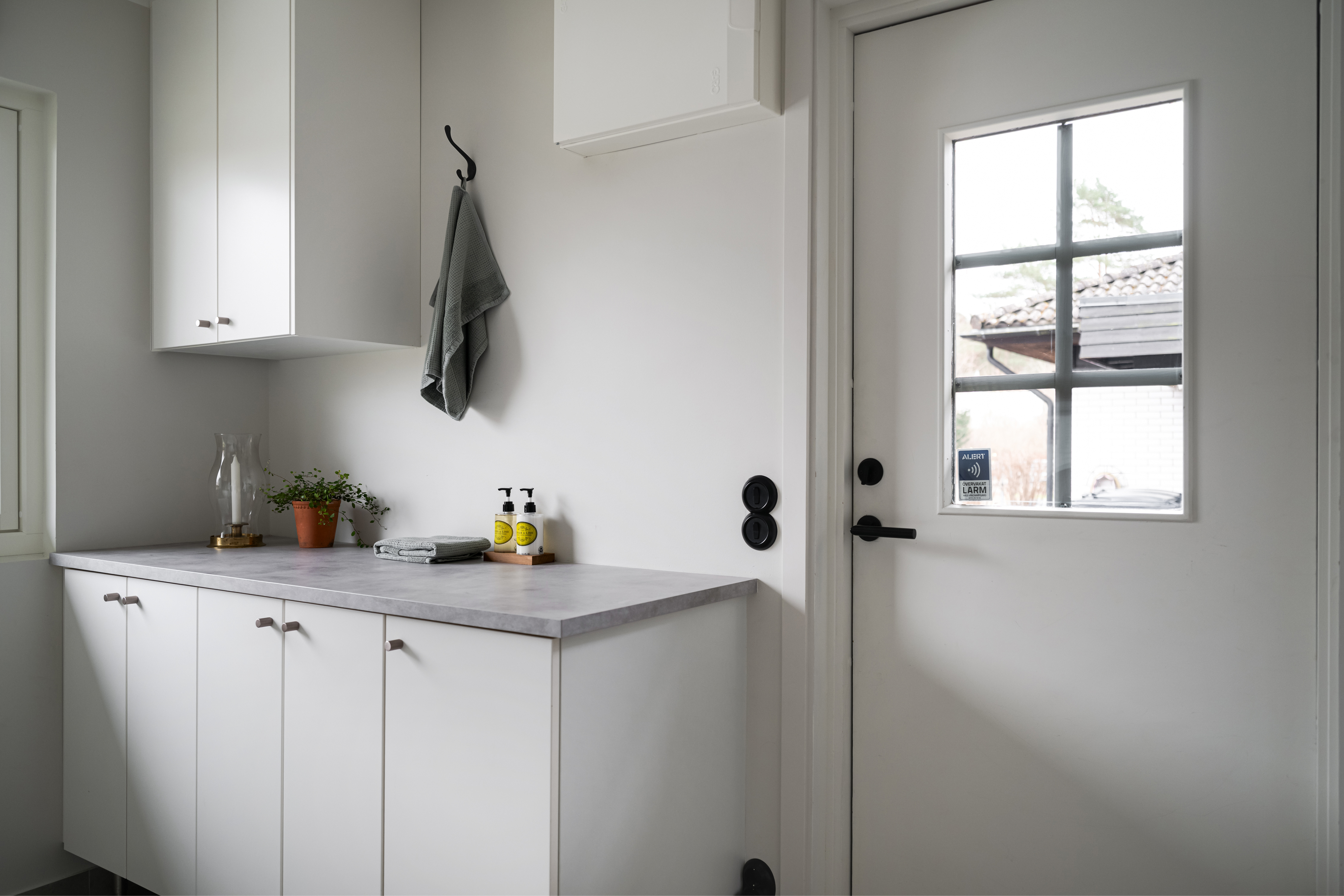 - Klinkergolv (Bricmate 60x60-plattor) och målad vägg. - Inredning med vita luckor och grå laminatbänkskiva. Vask. - Tvättmaskin och torktumlare från Bosch. - Värmepump från Mitsubishi. Avhärdningsfilter. - Infällda spotlights i tak.