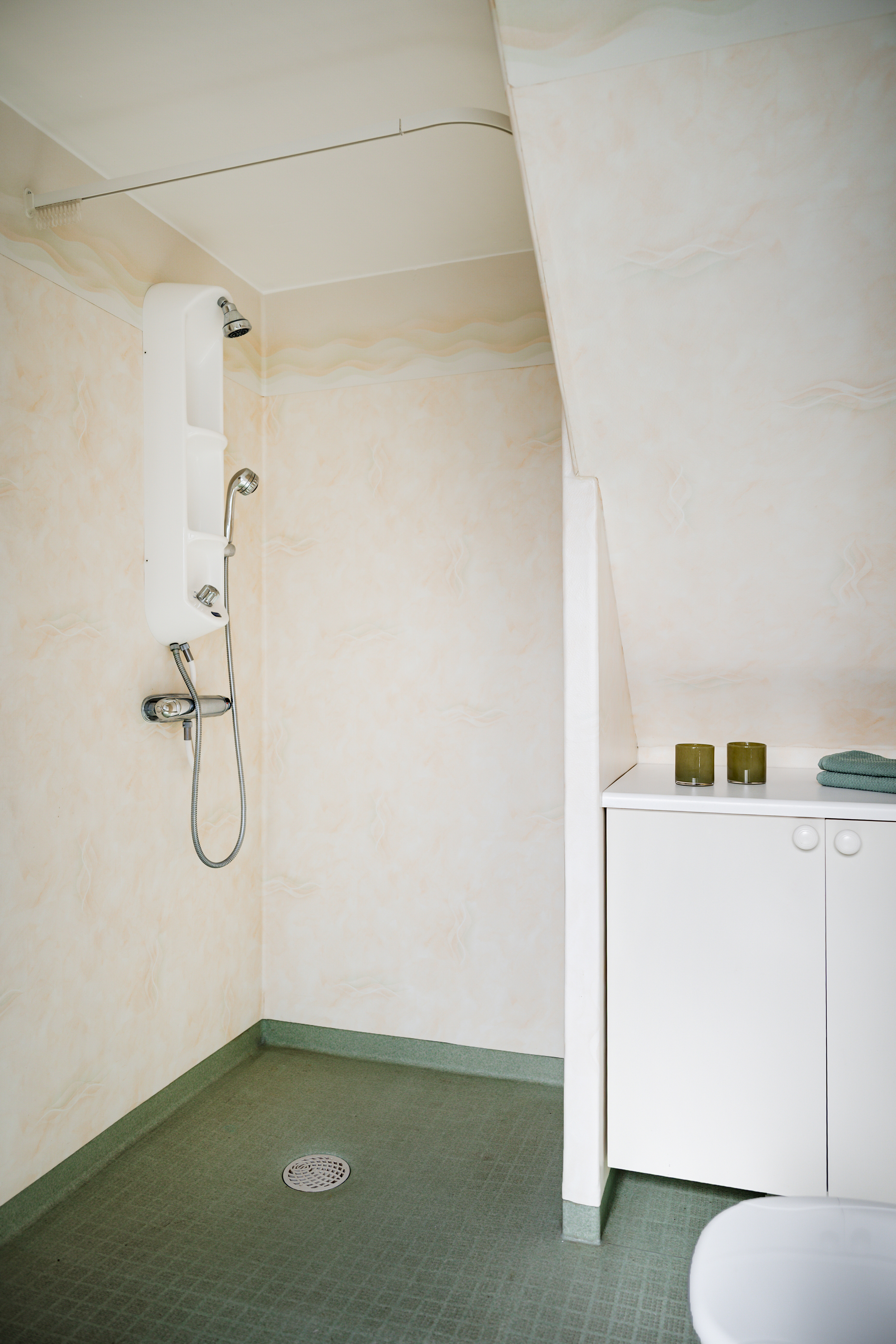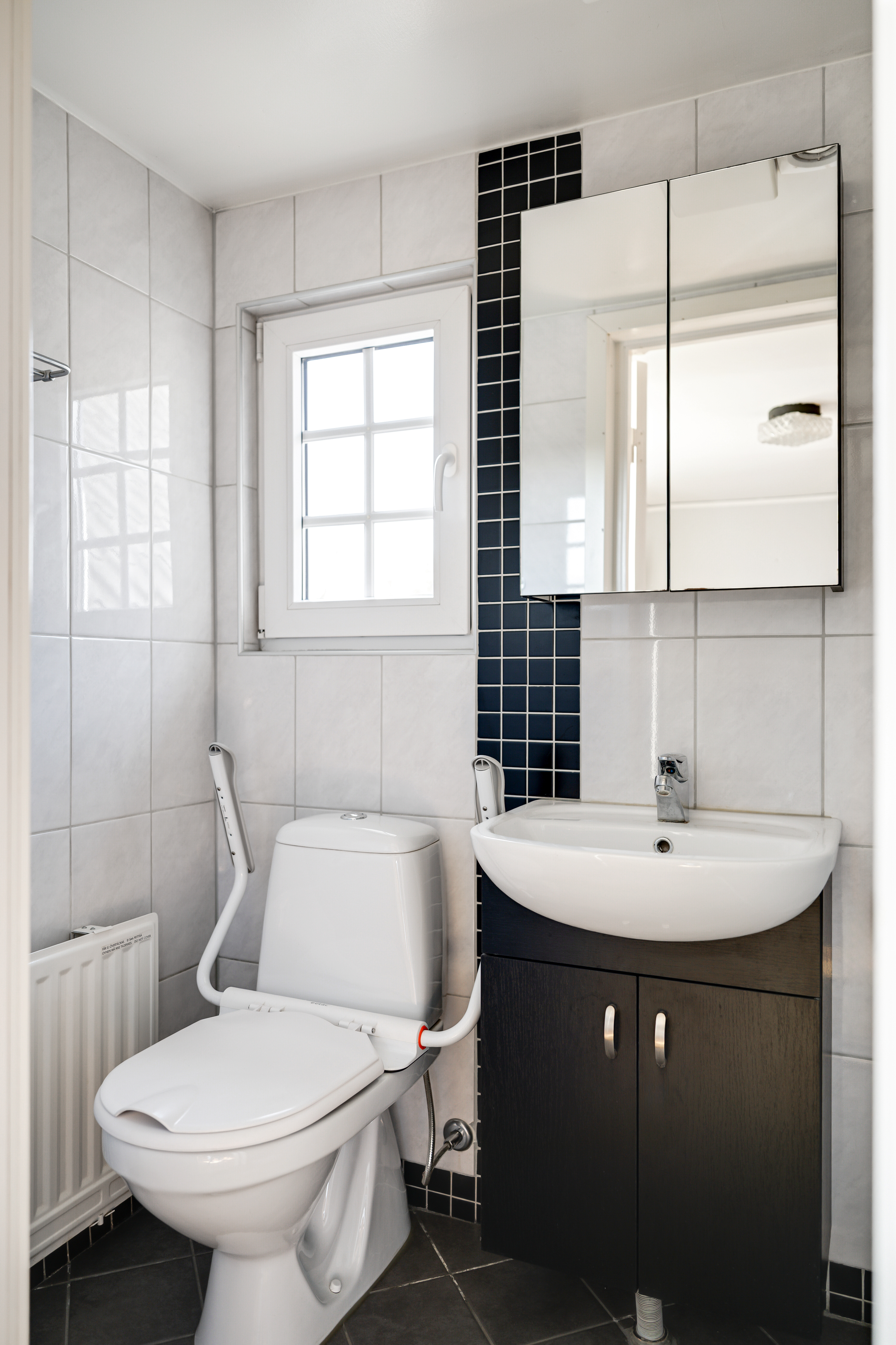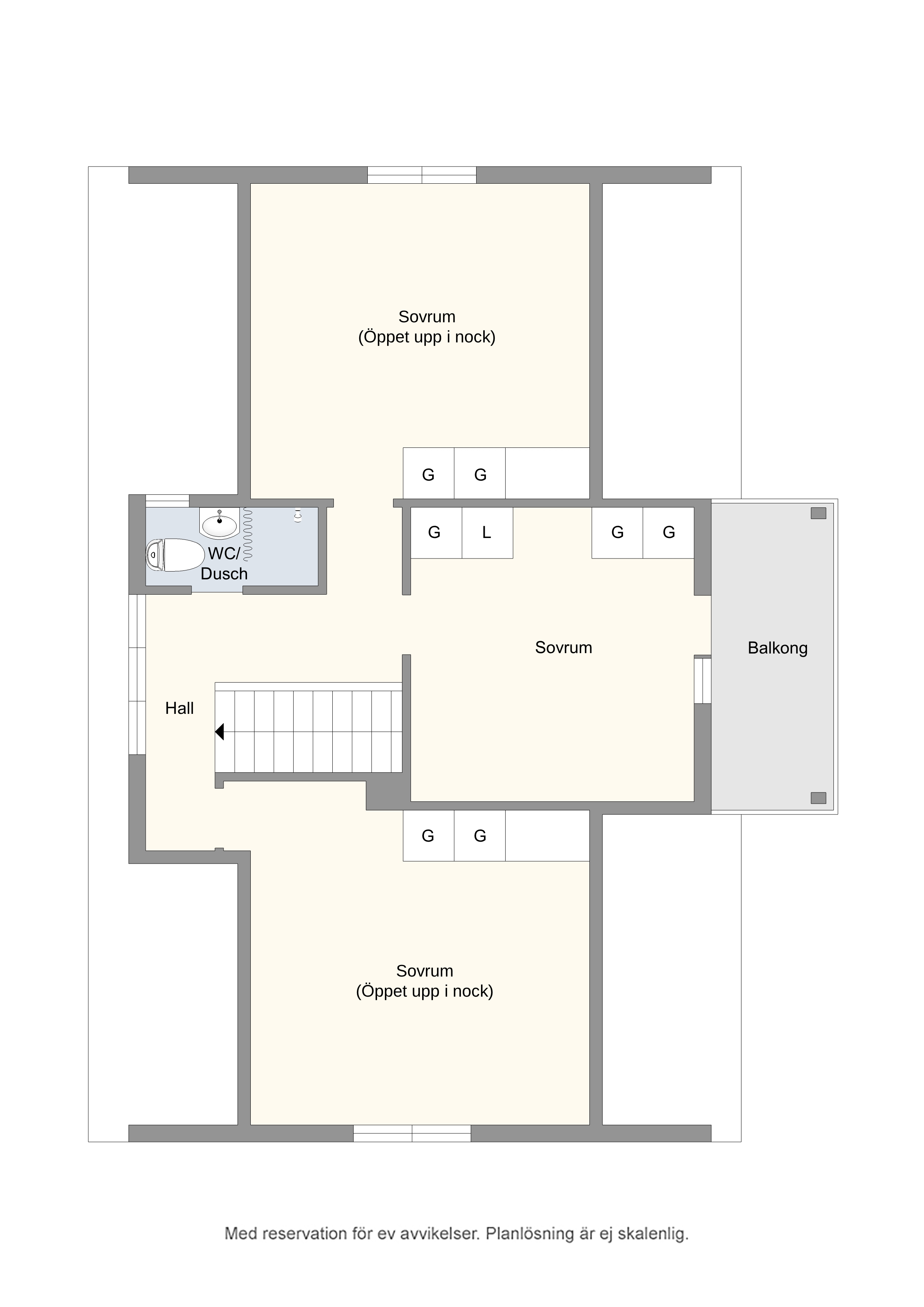 Huset har tre stora sovrum på ovanplan, varav två är öppna upp i nock och det andra har balkong. Det finns också en nyare kaklad dusch/wc.