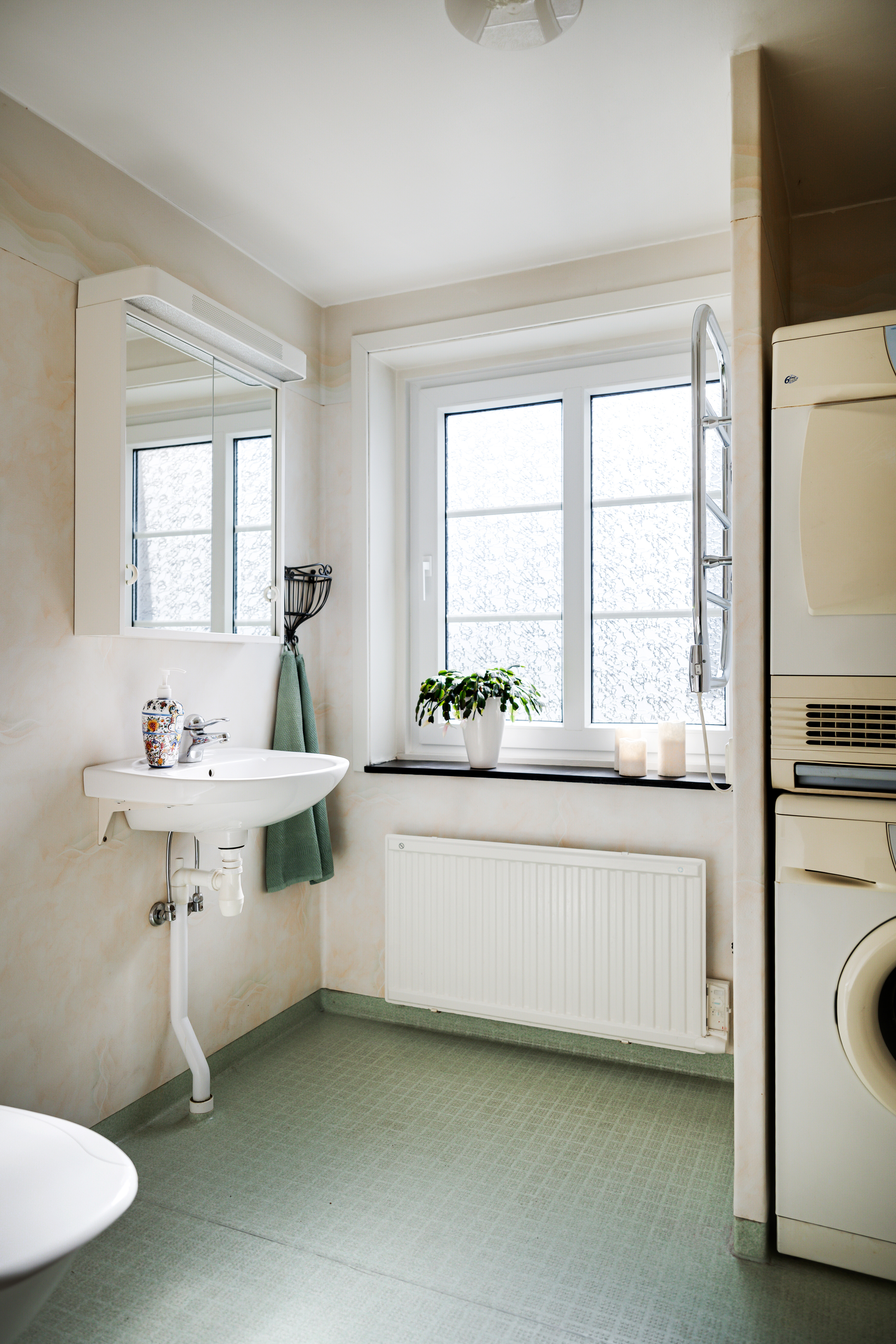Plastgolv och väggmatta. Tvättmaskin och torktumlare äldre.